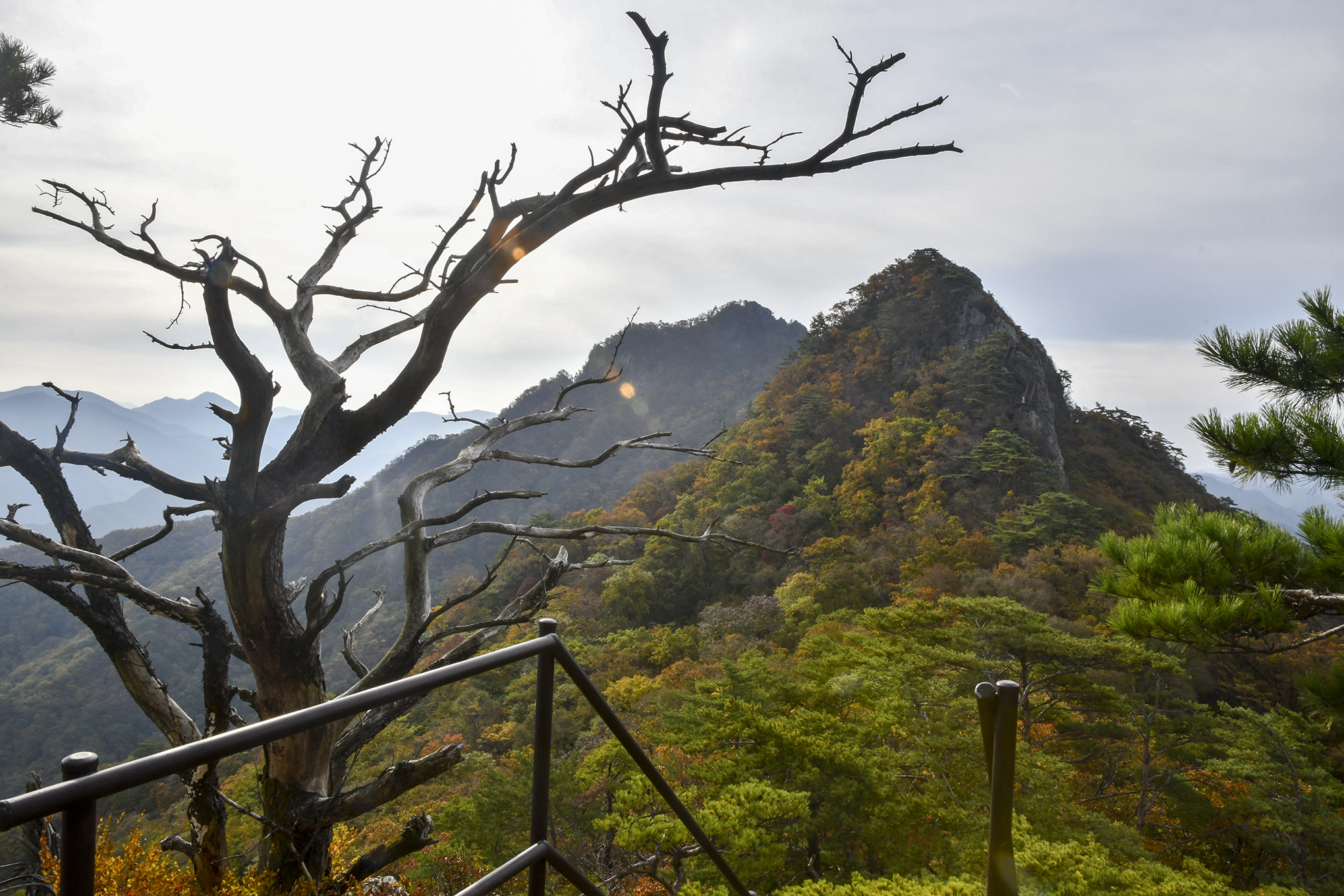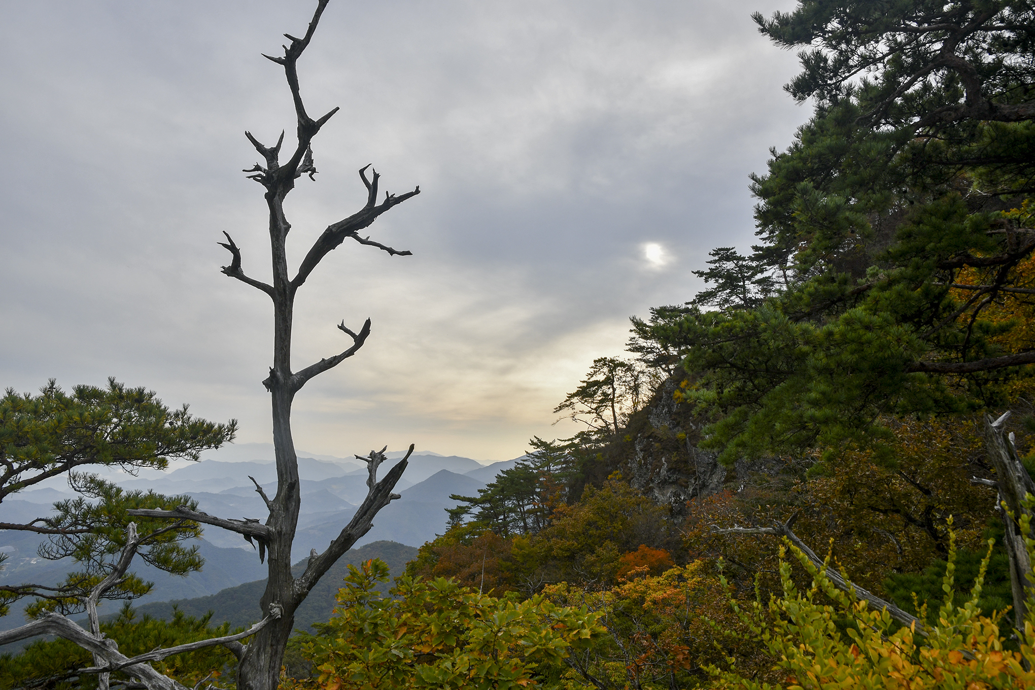 고사목 하나가 벼랑 끝에서 세상을 굽어보듯 백두대간 줄기를 내려다 보고,