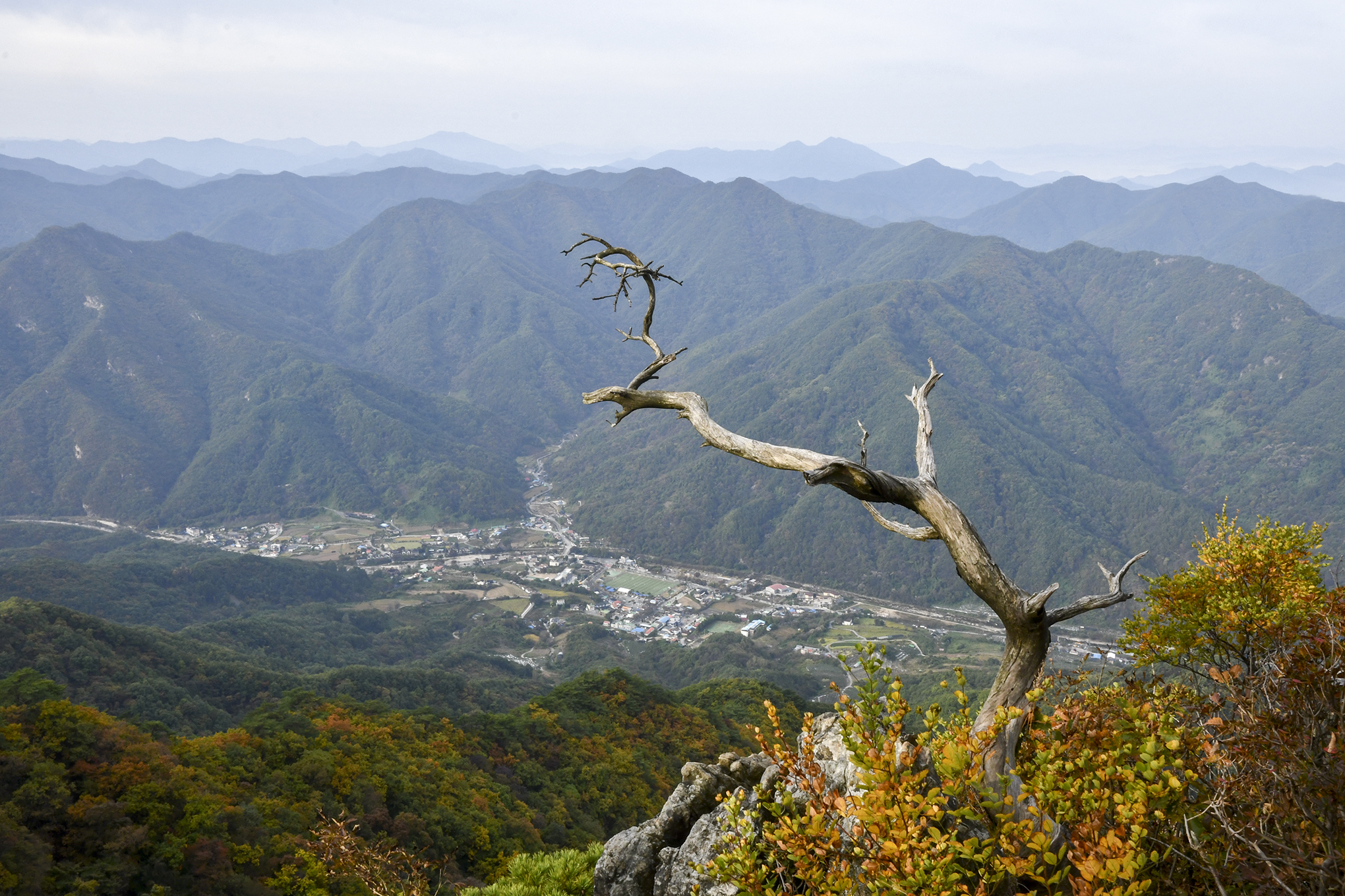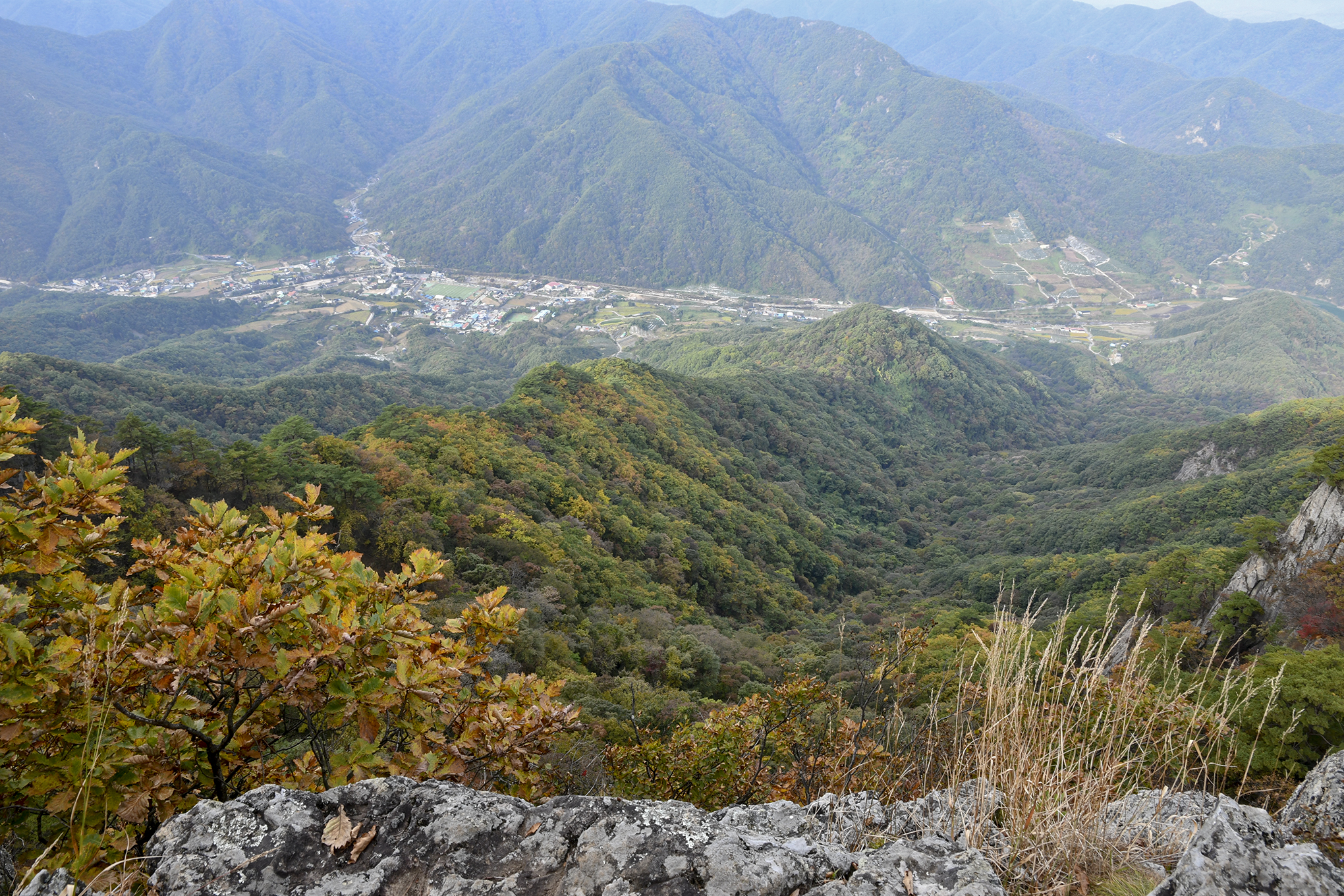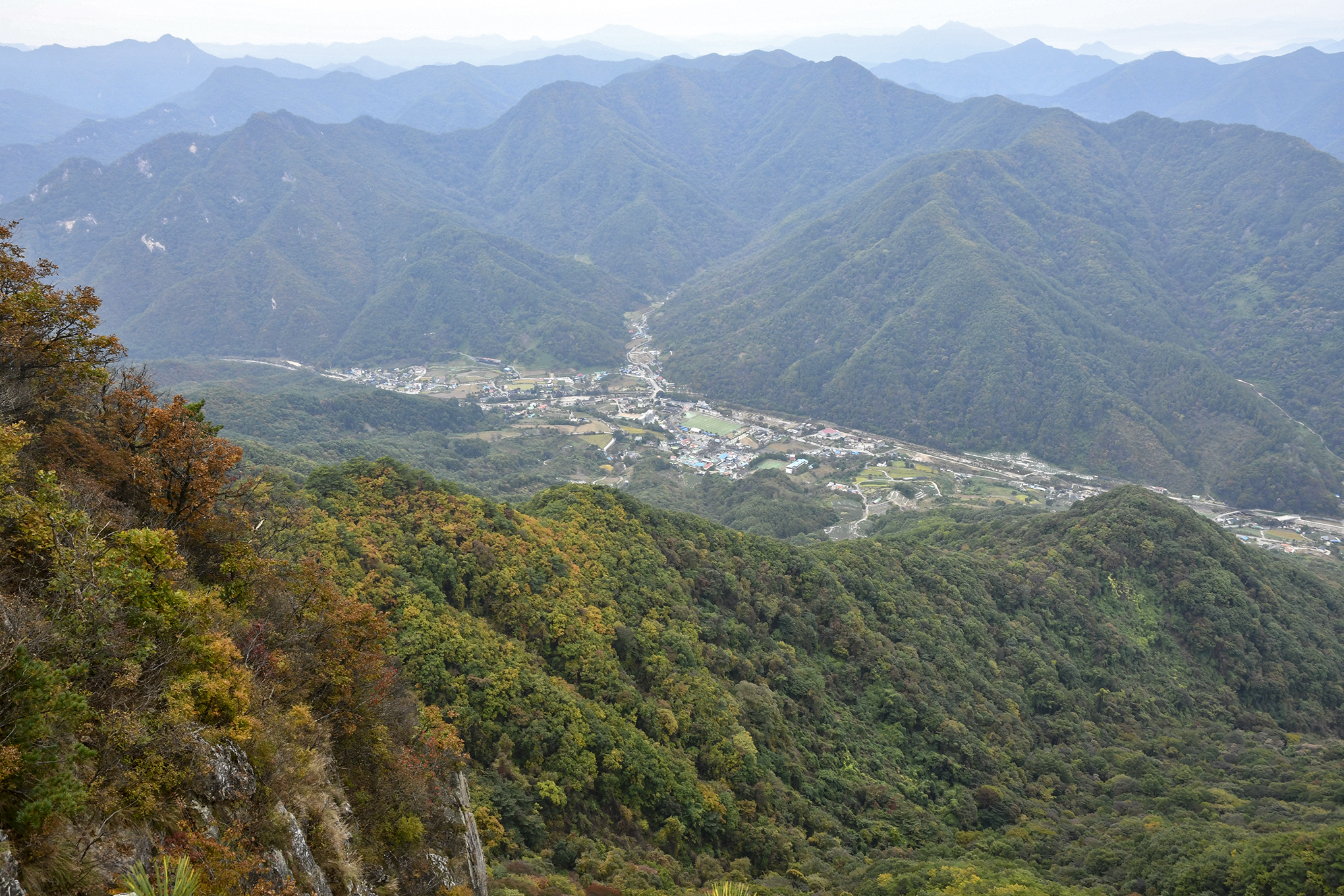 아래로 내려다보이는 마을 풍경 뒤로 백두대간의 높은 산줄기가 험준하게 지나간다.
