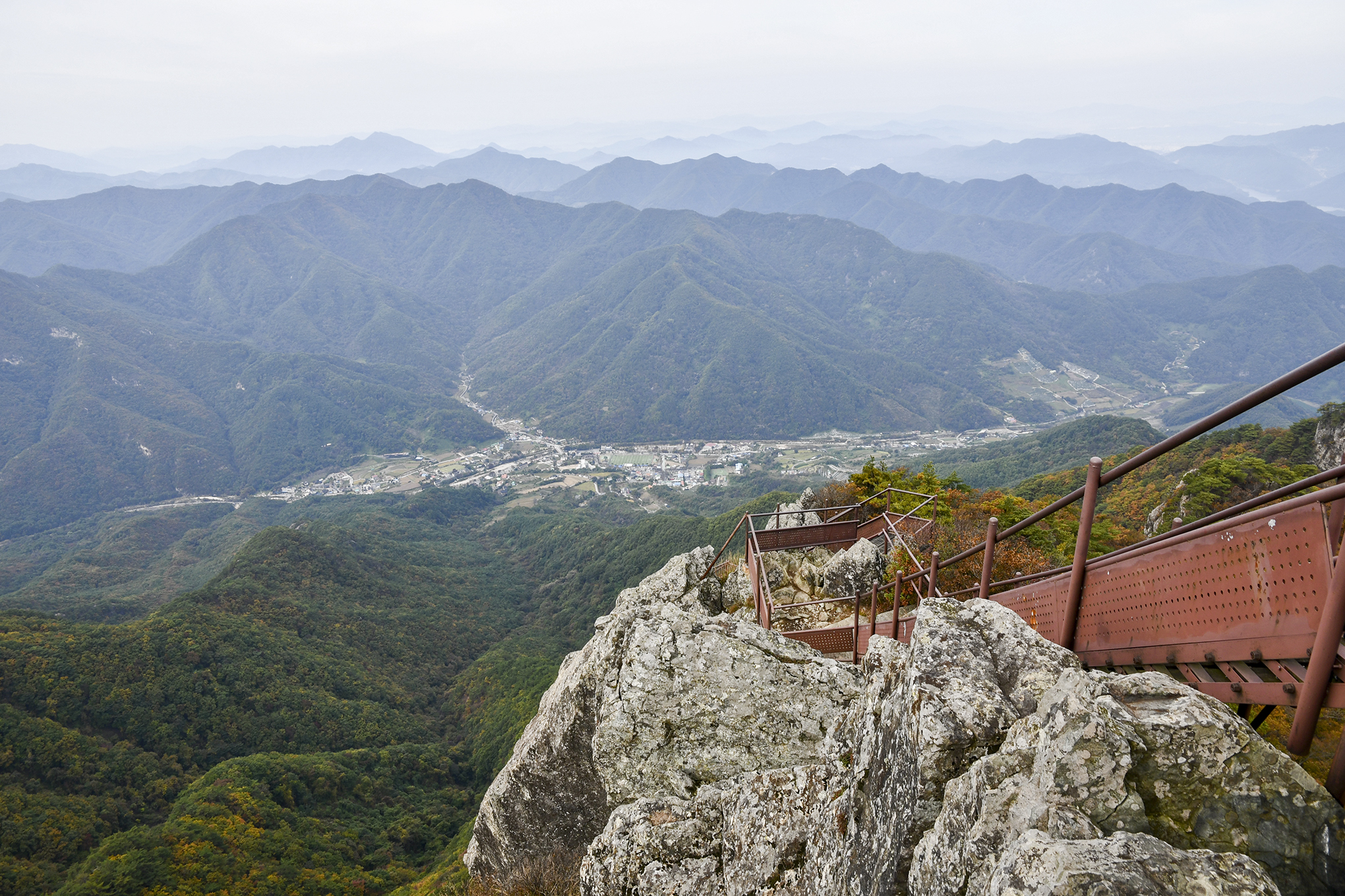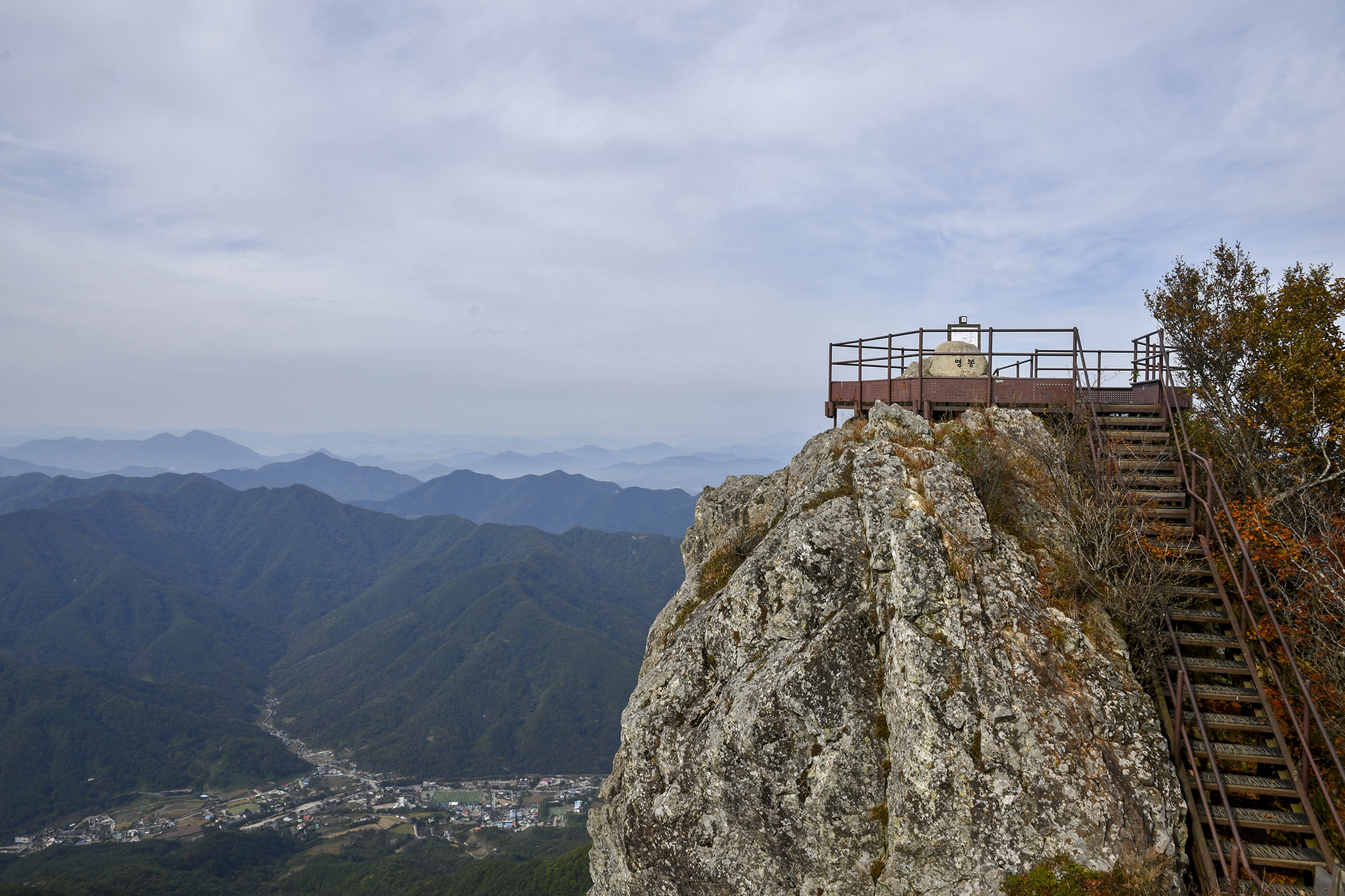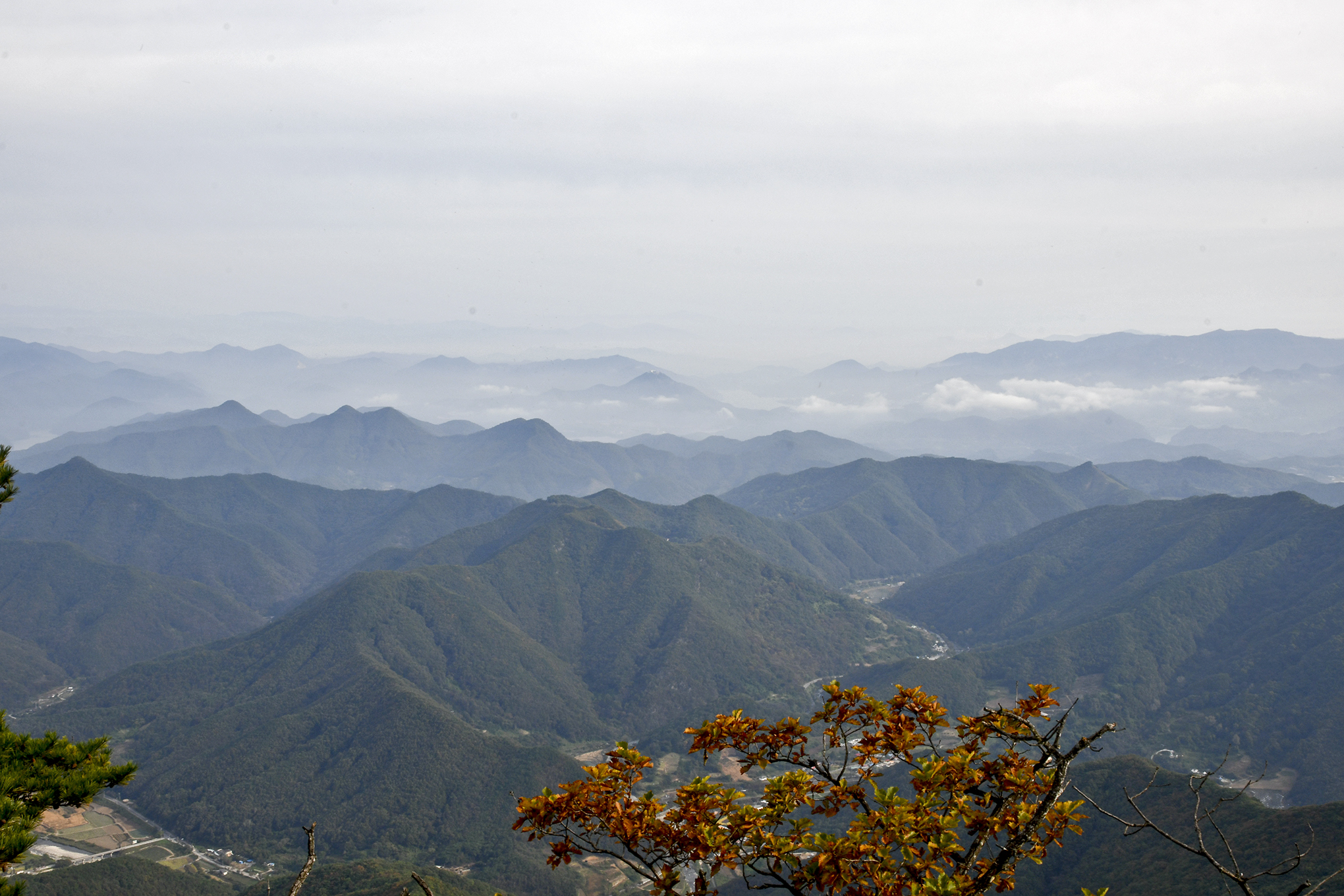 아래로 내려다보이는 마을 풍경 뒤로 백두대간의 높은 산줄기가 험준하게 지나간다.