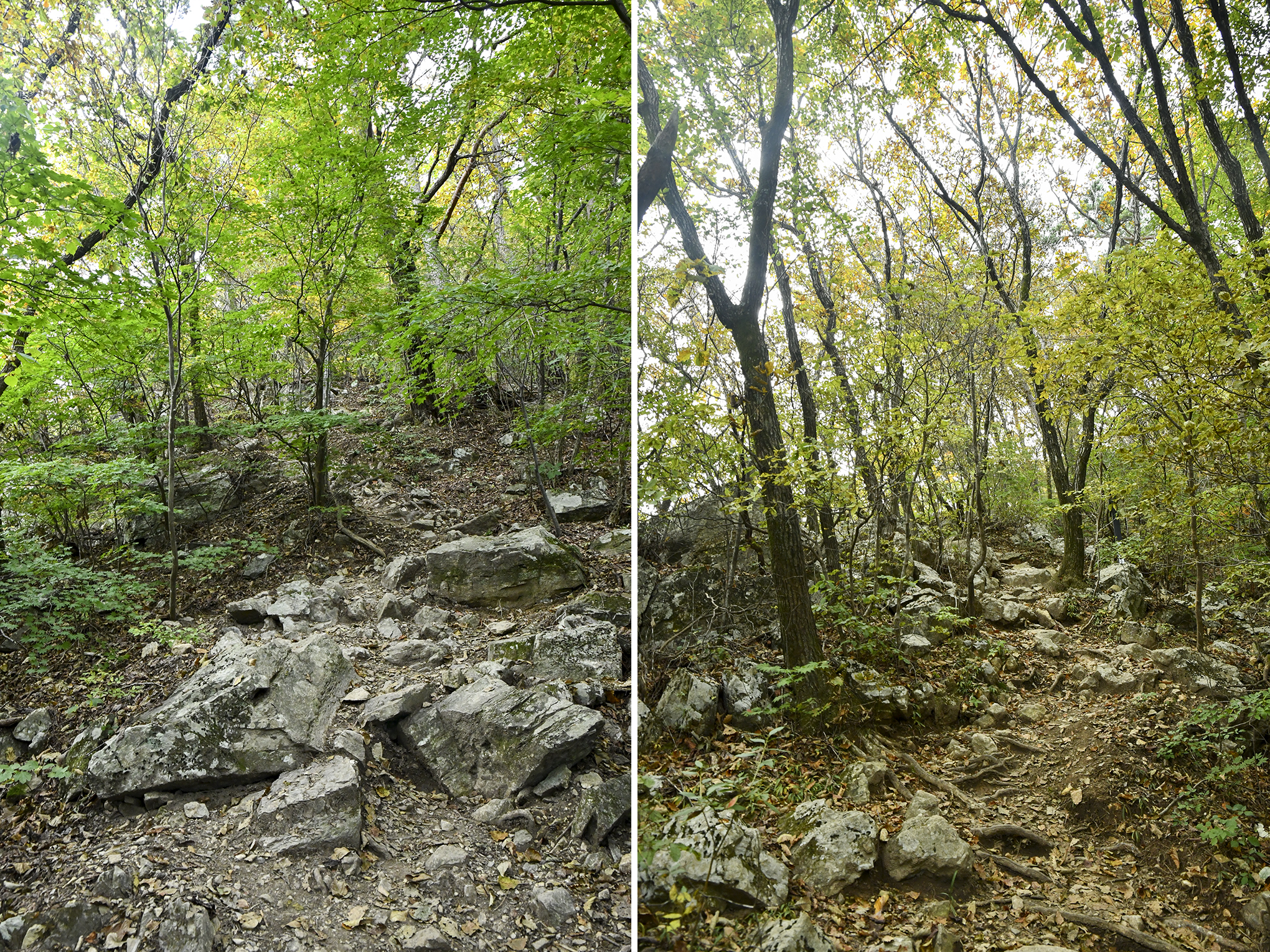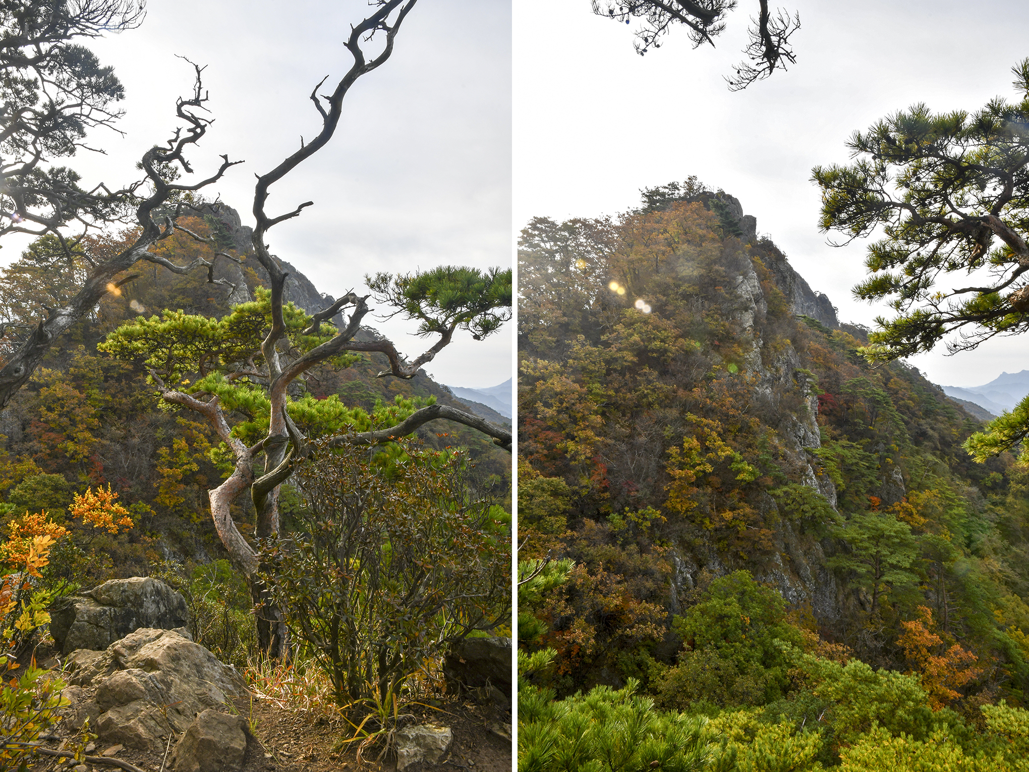 두 봉우리 골짜기까지 내려와 담은 사진, 고작 10분을 내려온 거리지만 고도가 엄청 낮아졌다는걸 예상할 수 있다.
