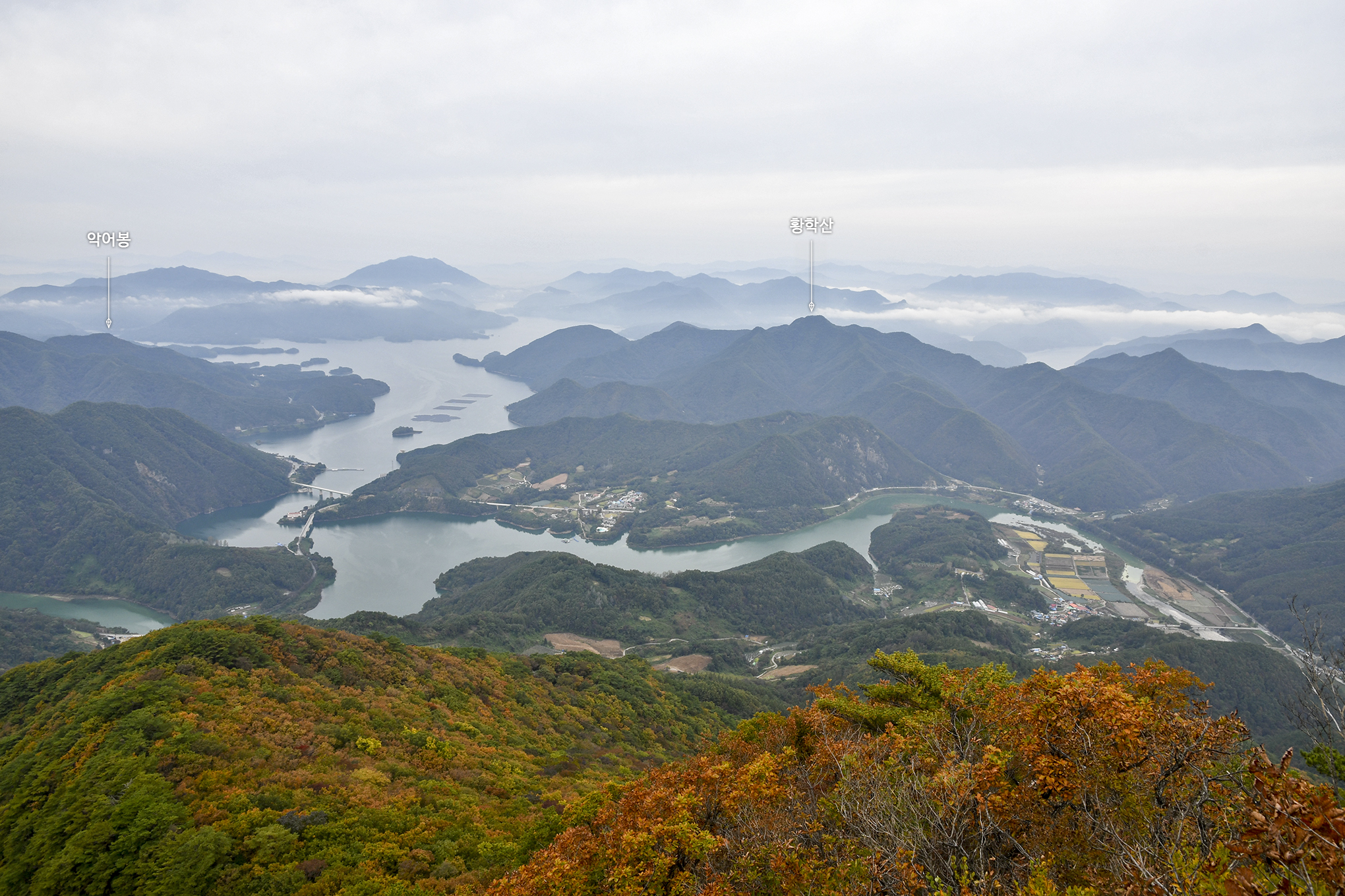 악어봉과 황학산이 조망되고 저멀리 산그리메가 단풍만큼이나 아름답다.