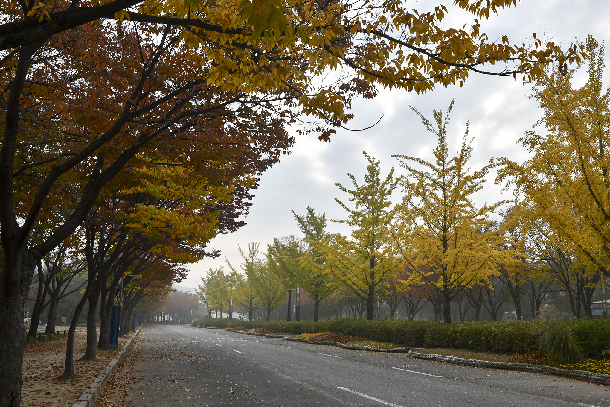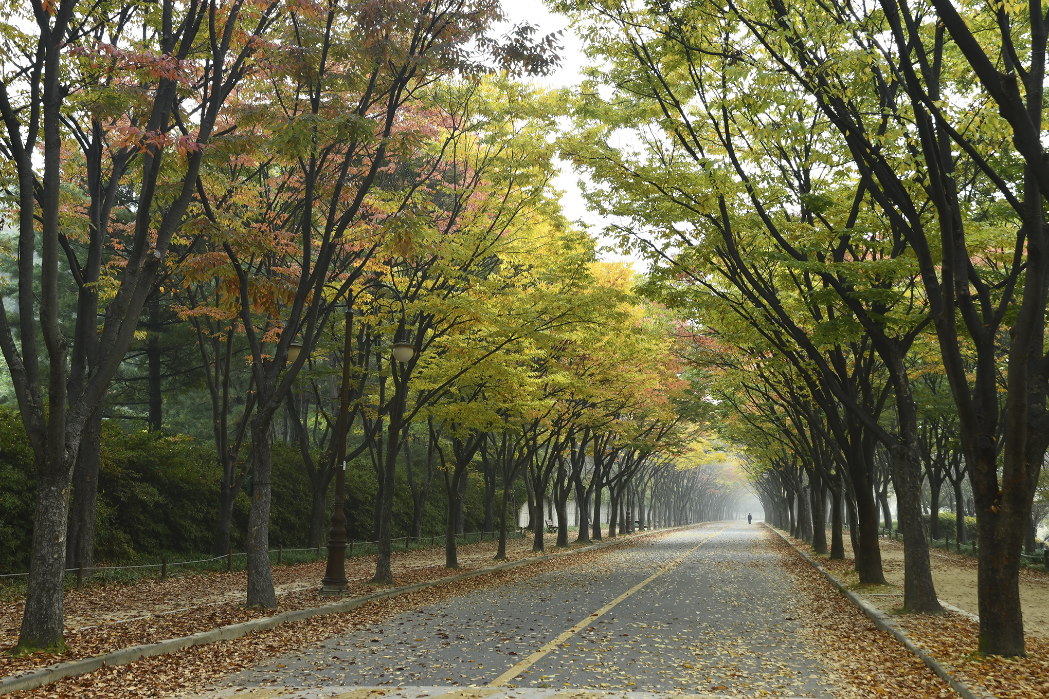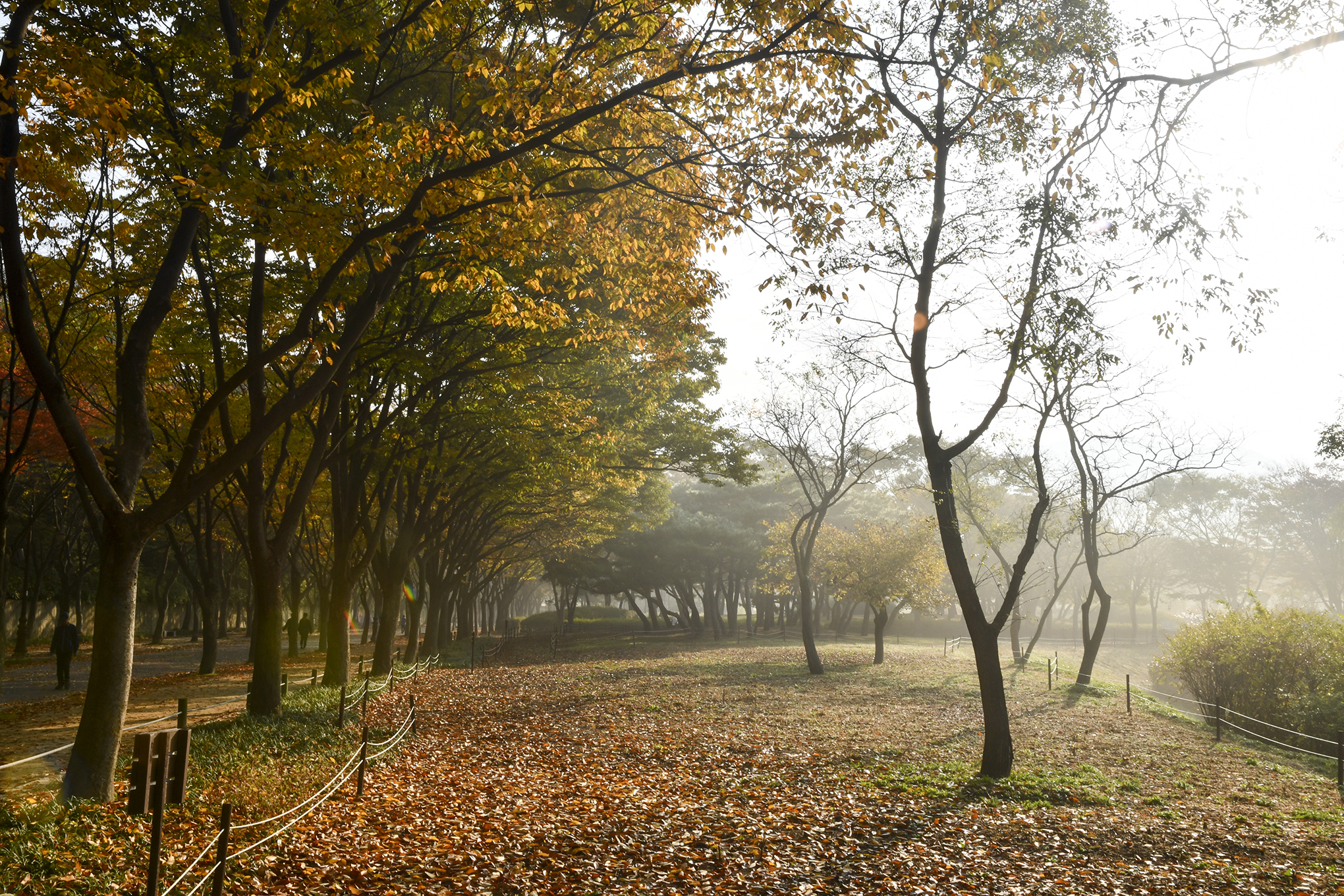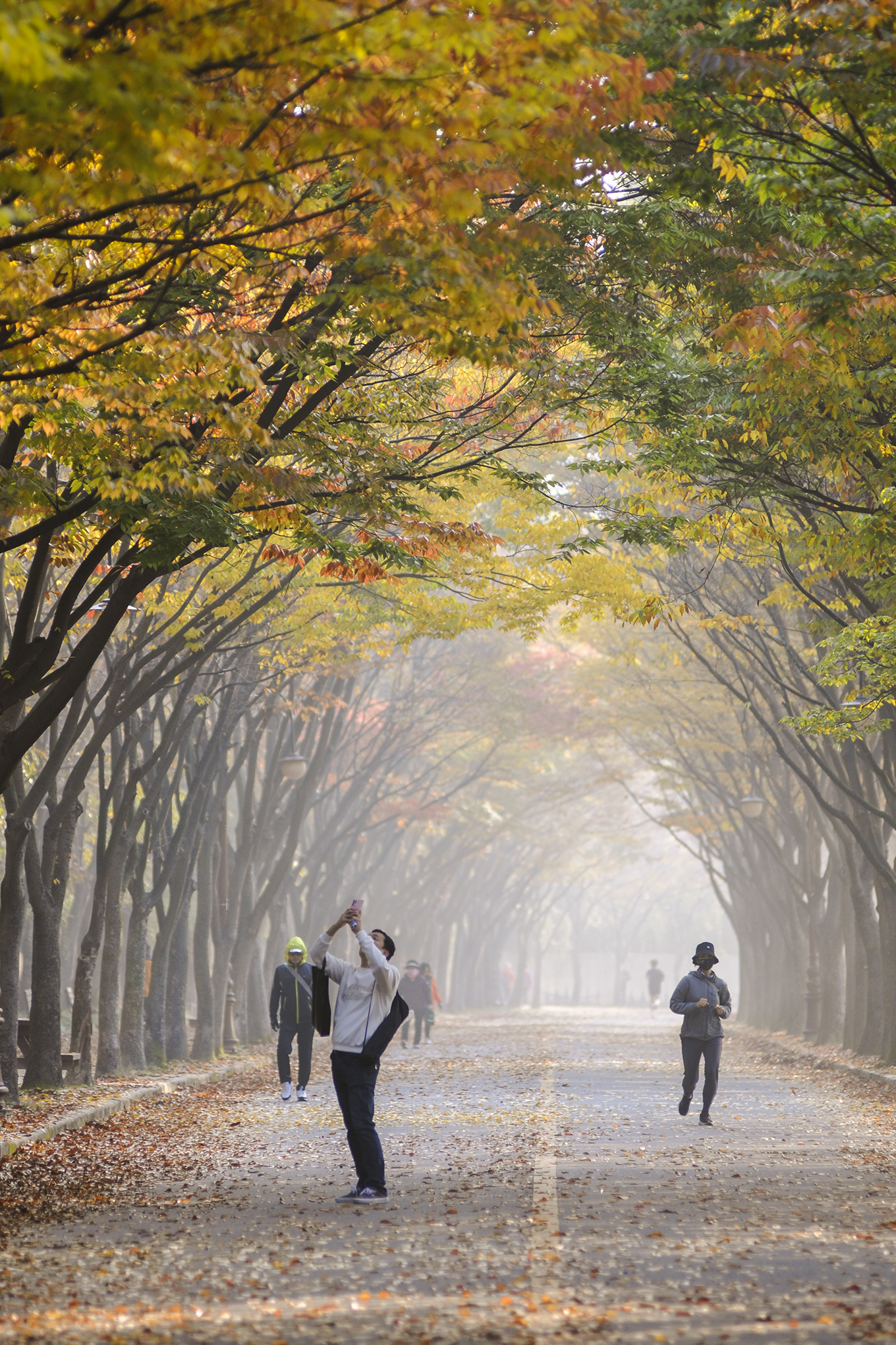 안개 낀 오늘 아침, 해가 나오길 기다리며 연례행사처럼 올해도 느티나무길 단풍을 담아본다.