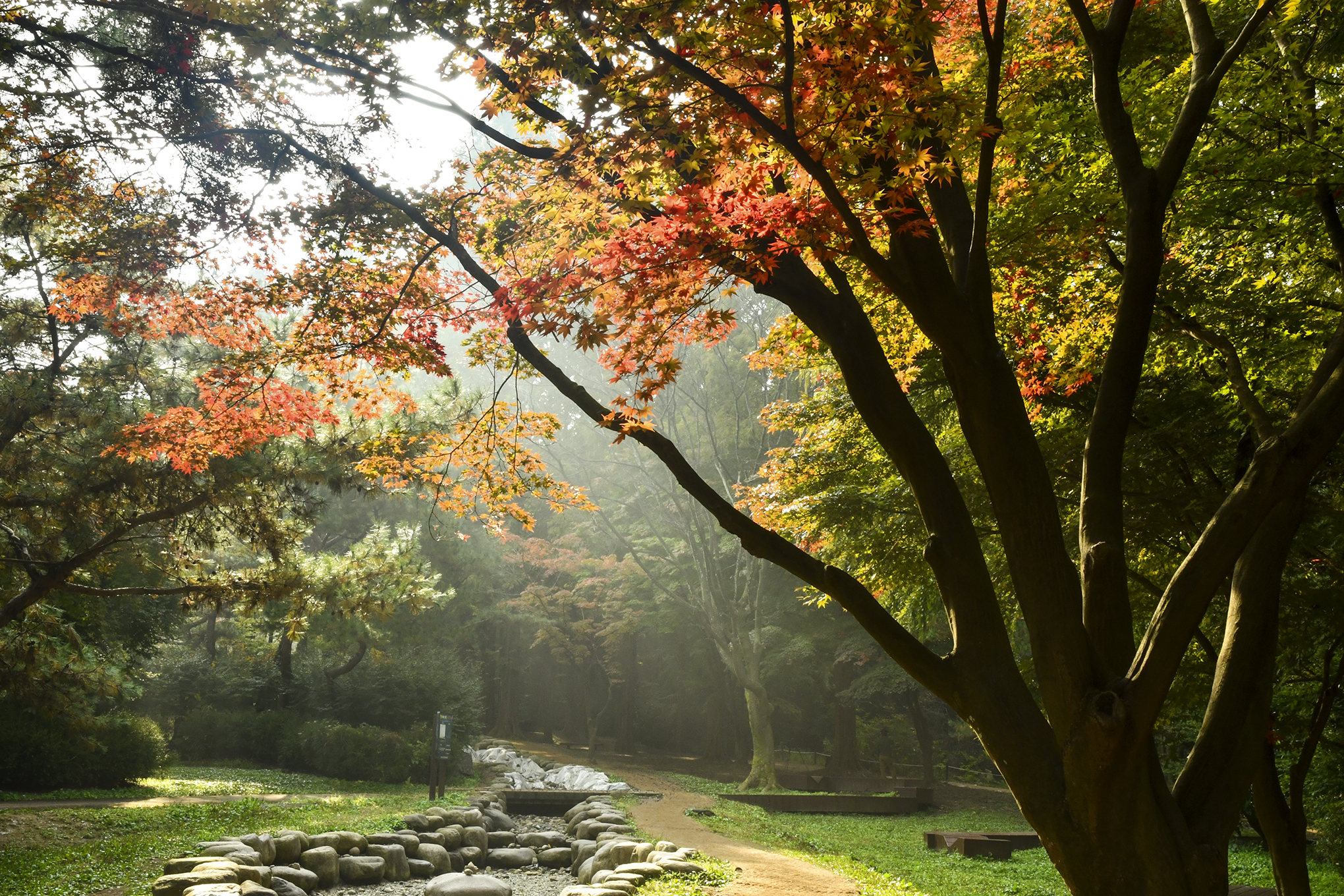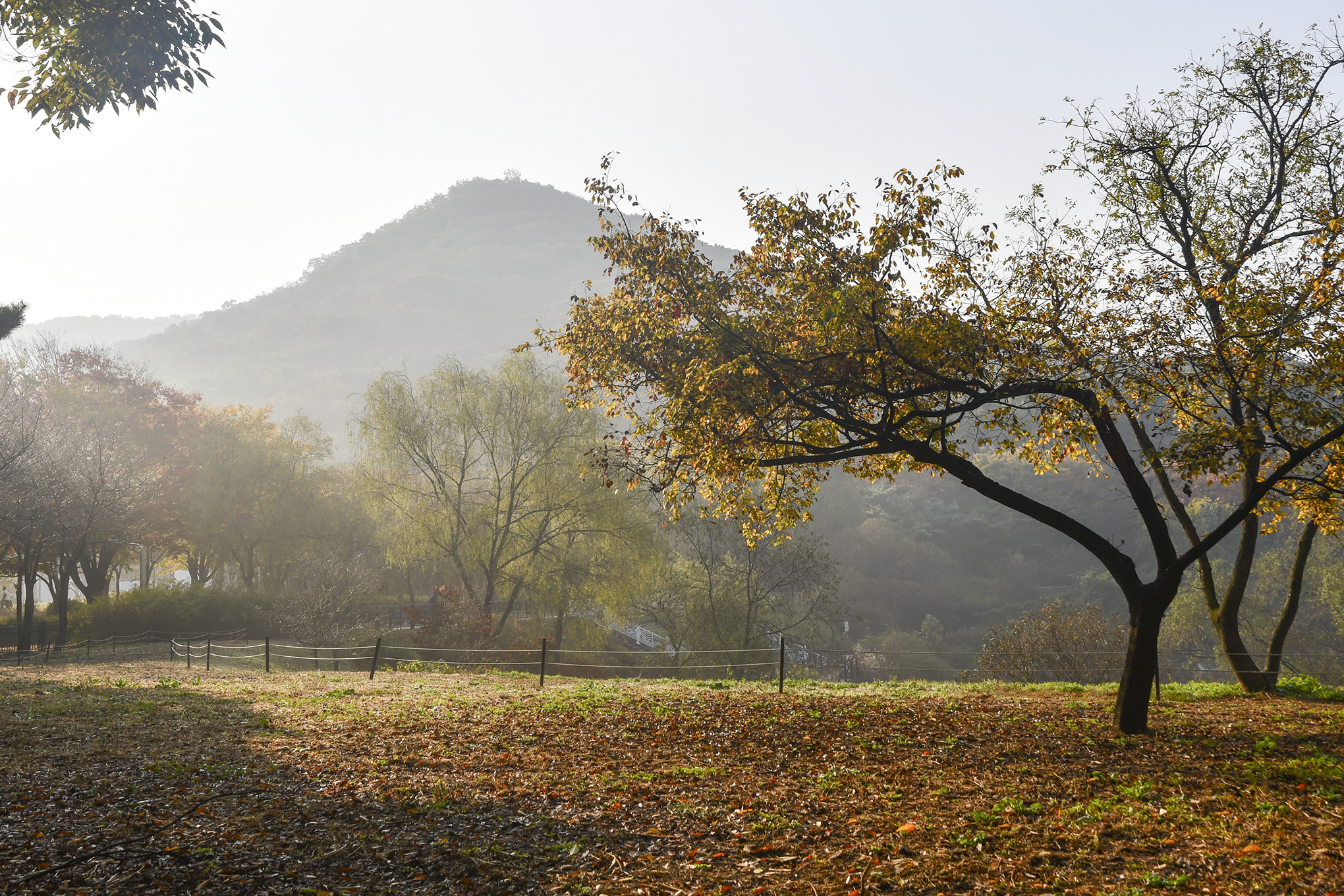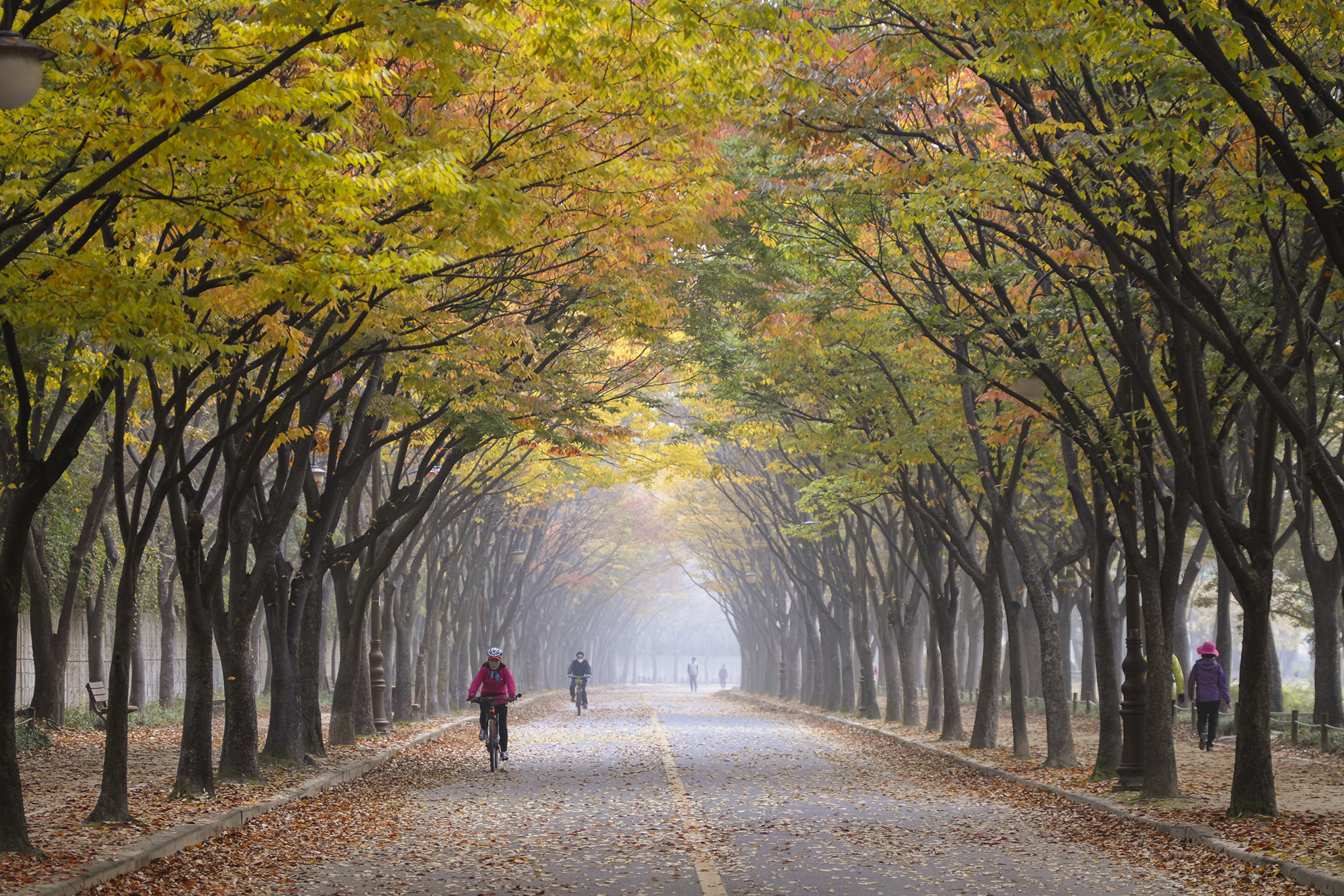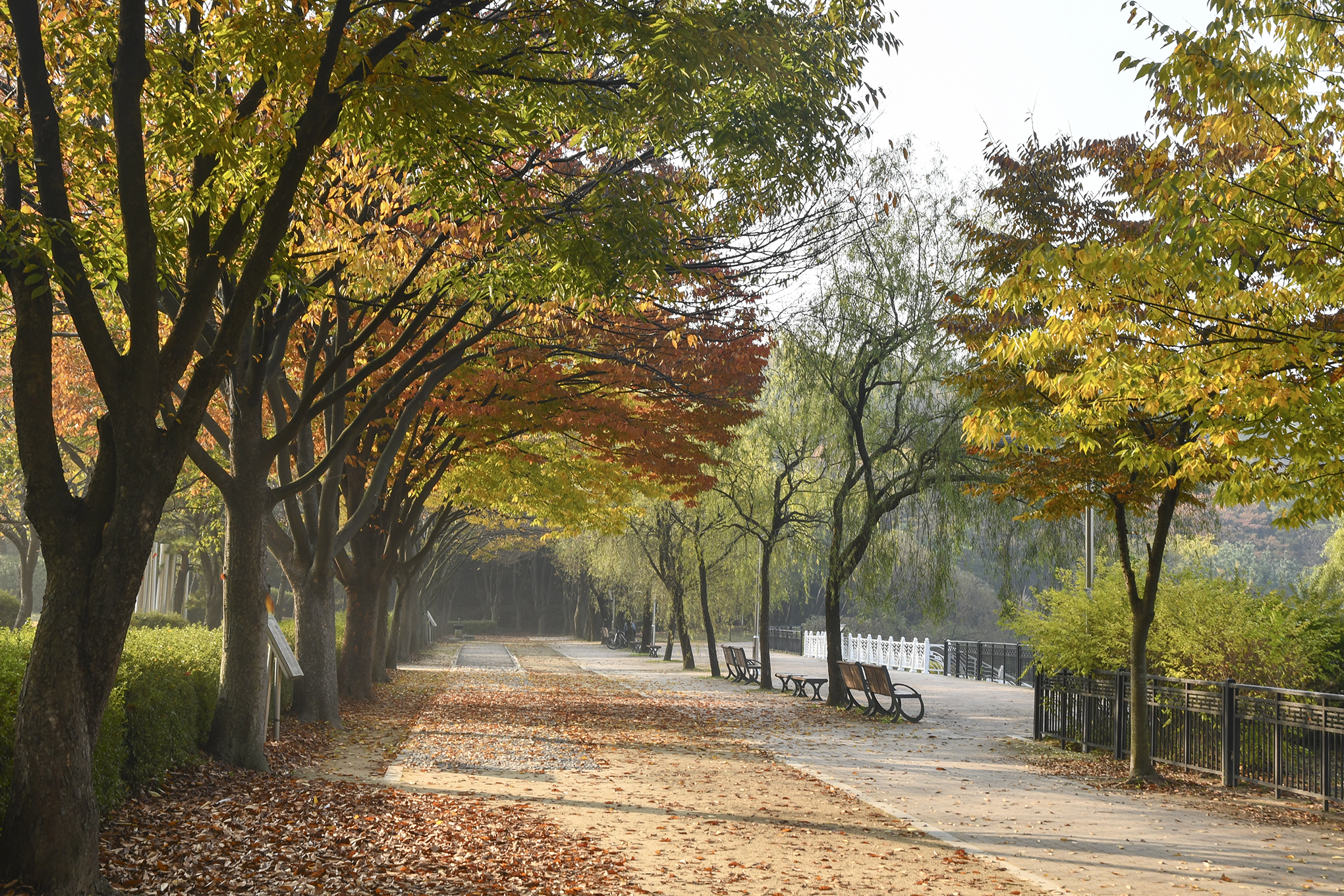 안개 낀 오늘 아침, 해가 나오길 기다리며 연례행사처럼 올해도 느티나무길 단풍을 담아본다.