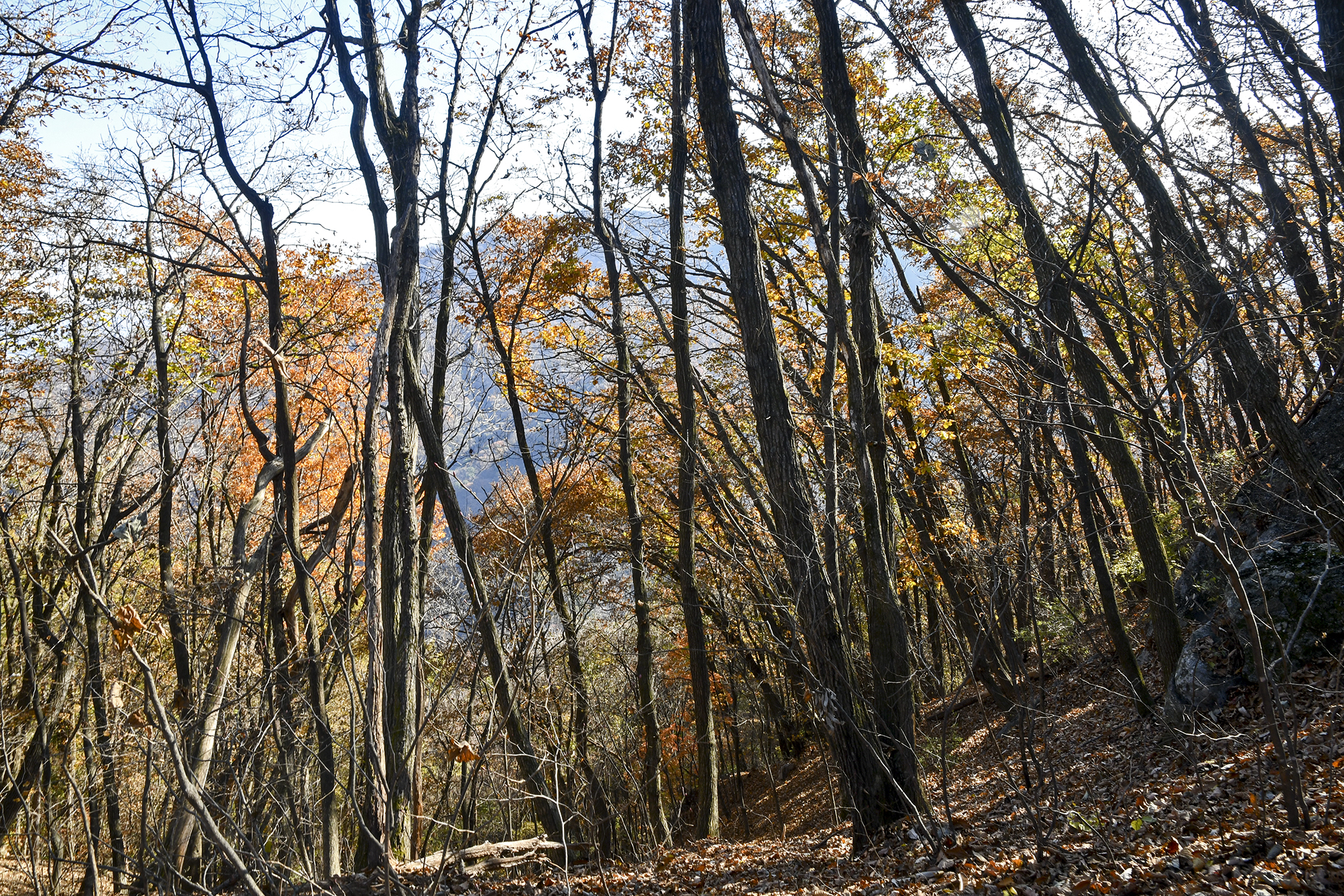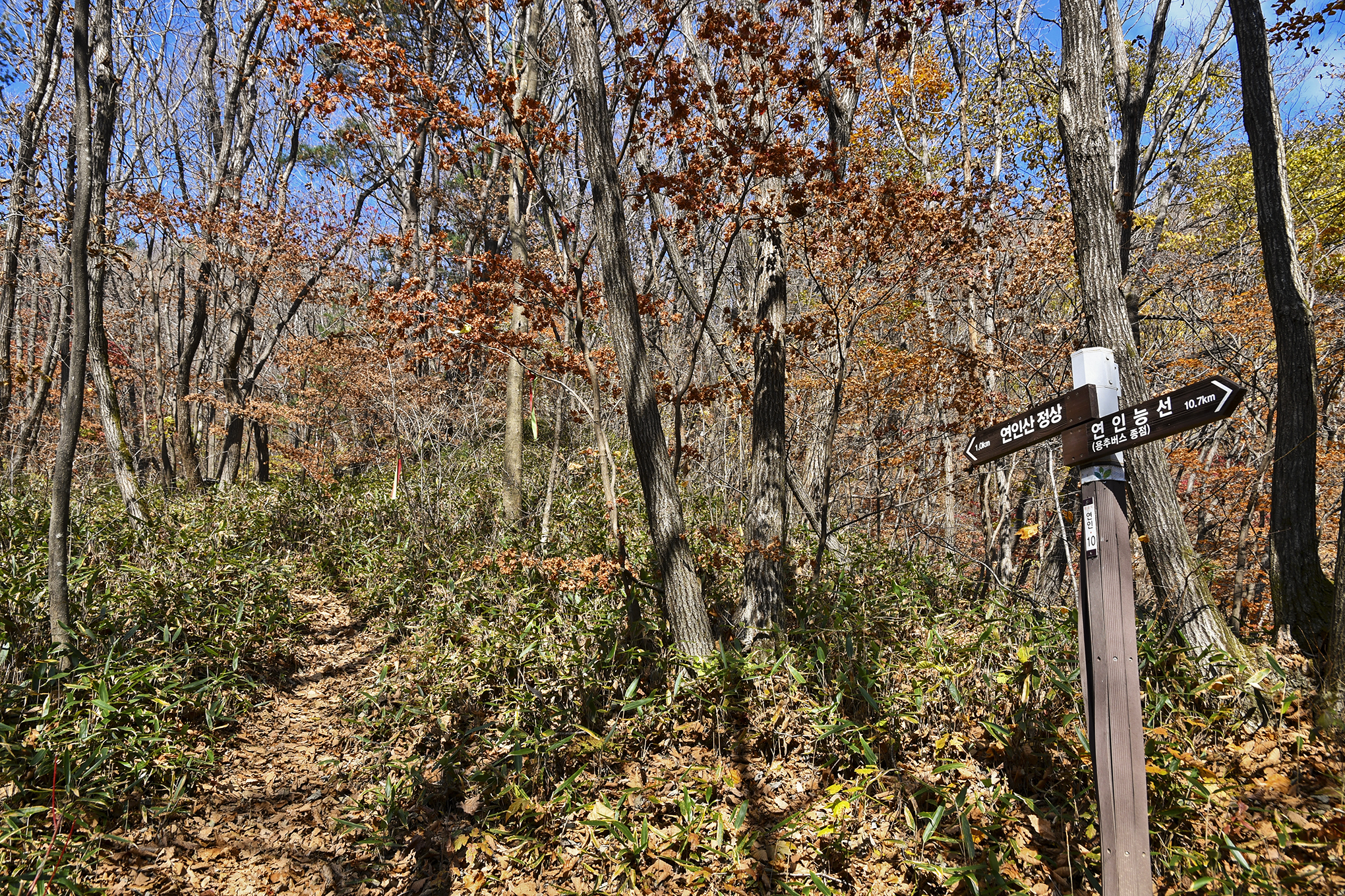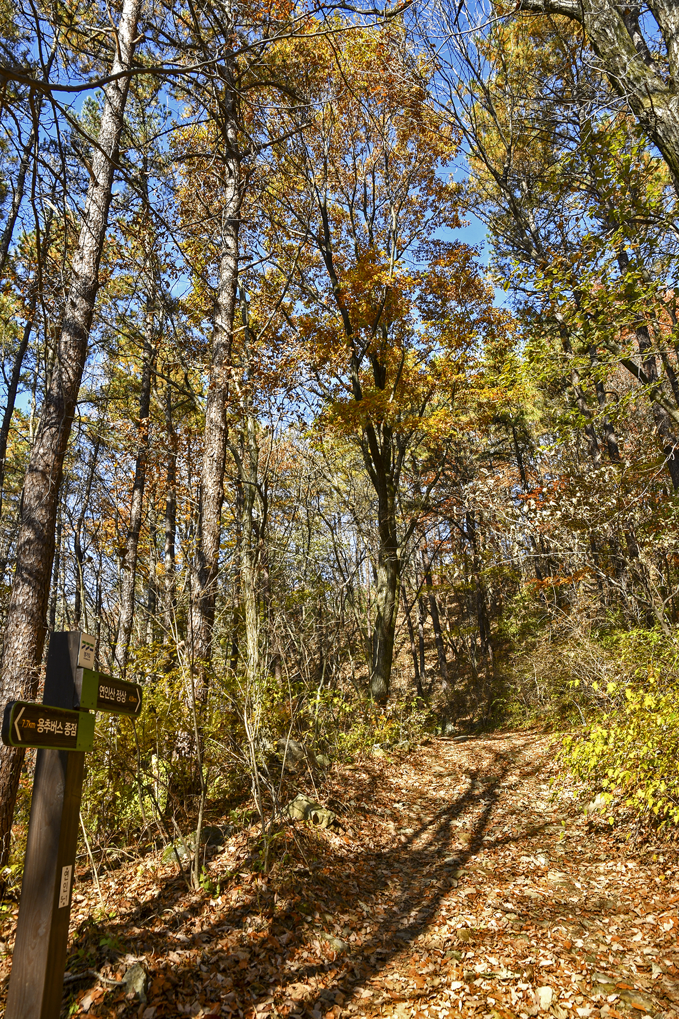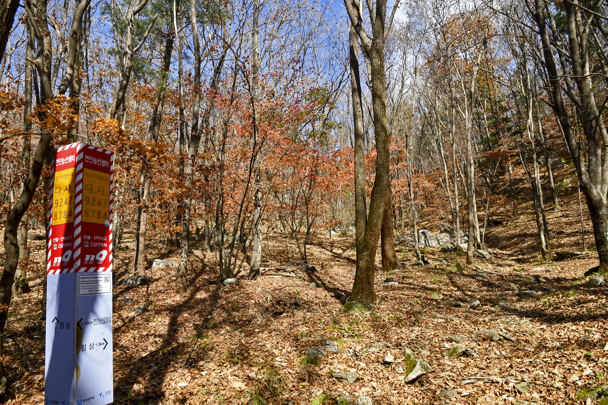 어떤 구간은 등산로가 보이지 않을 정도로 낙엽이 많지만 능선으로 걸으니 등산로가 지워져도 길을 잃을 염려는 없다.