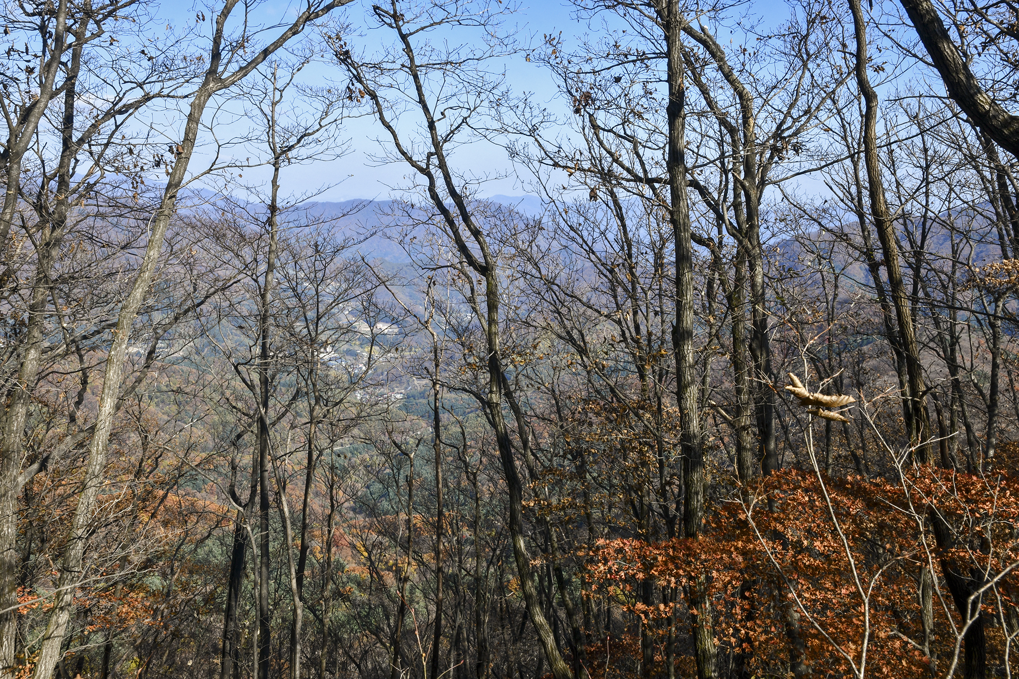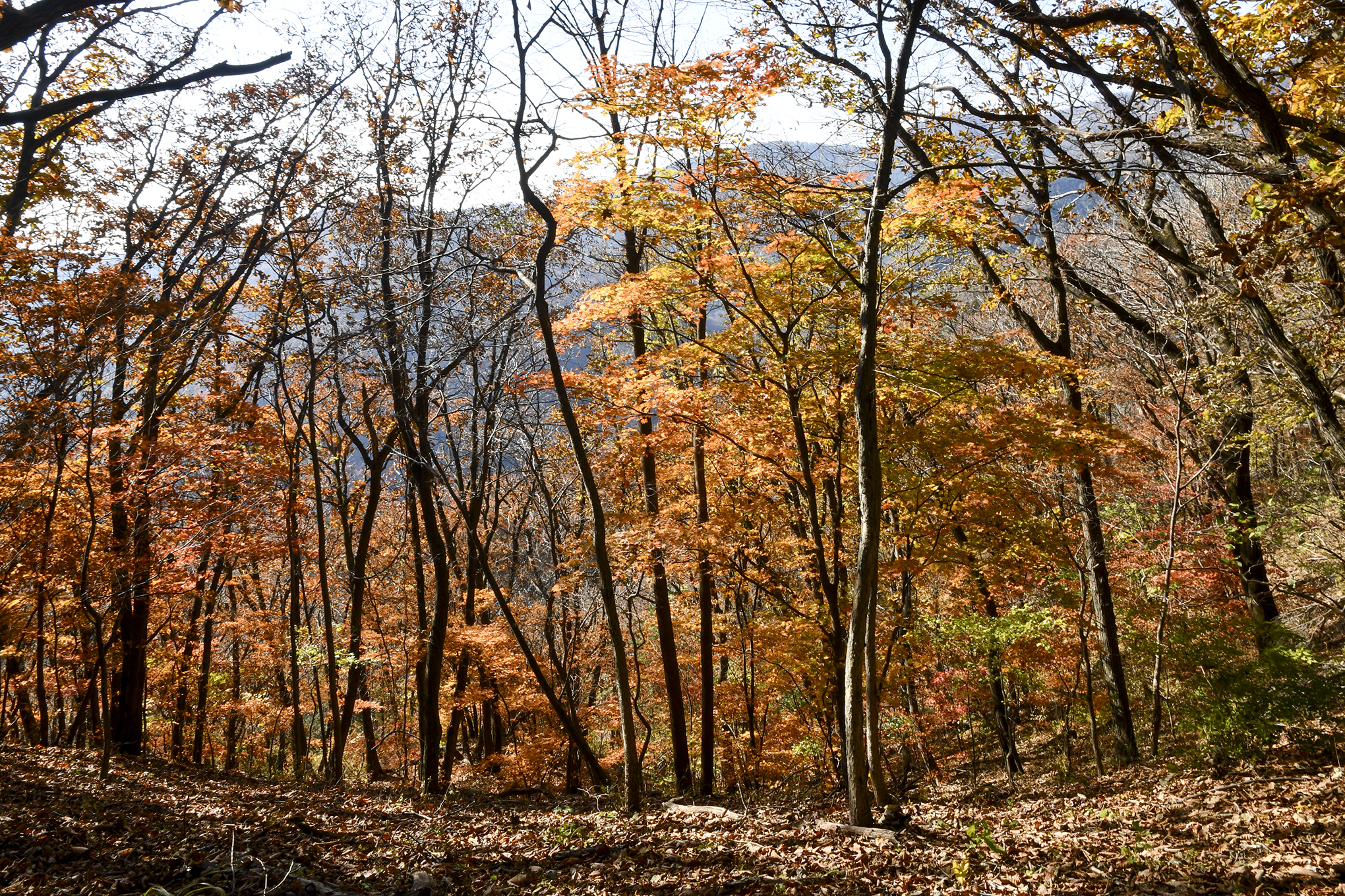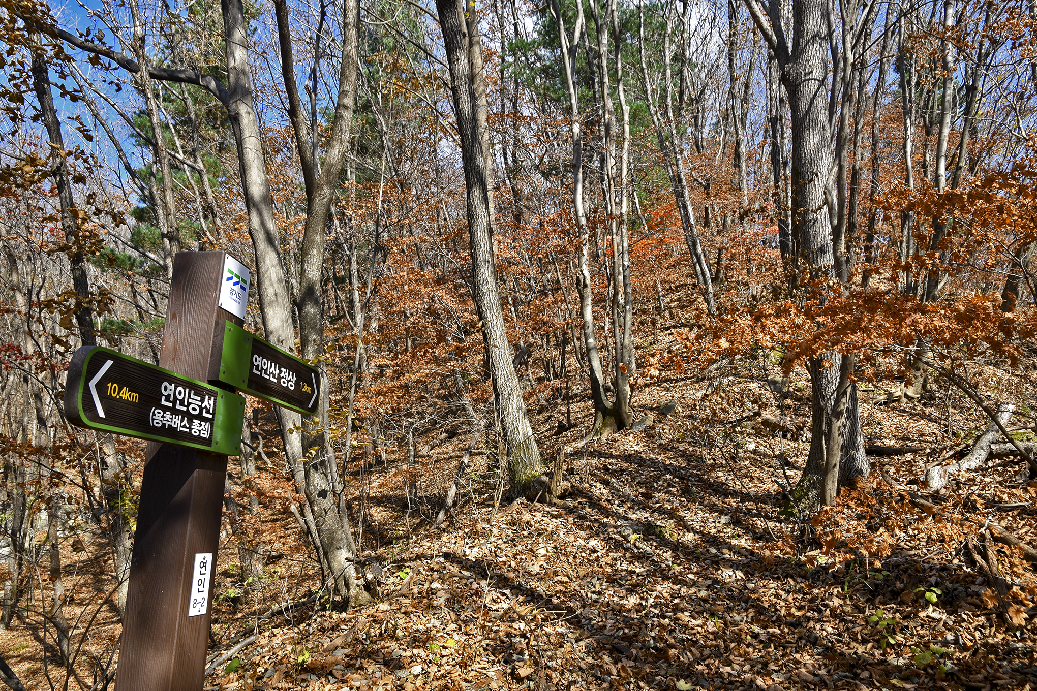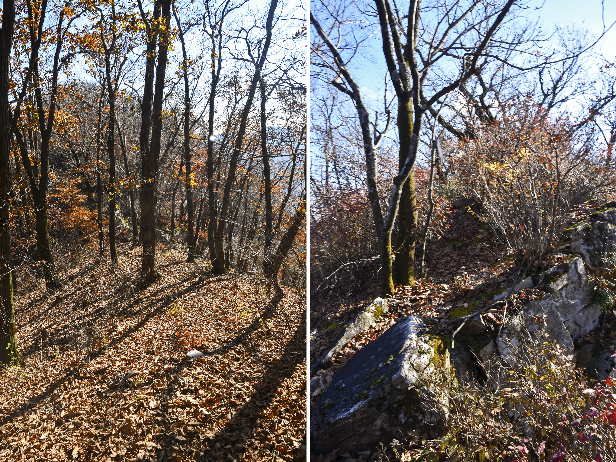 어떤 구간은 등산로가 보이지 않을 정도로 낙엽이 많지만 능선으로 걸으니 등산로가 지워져도 길을 잃을 염려는 없다.