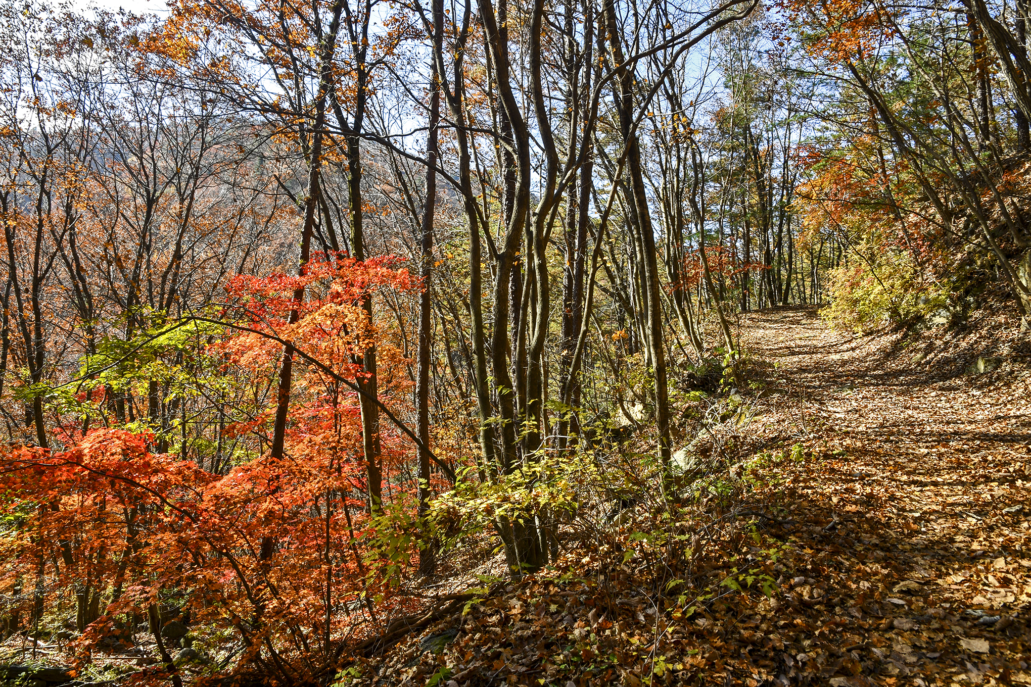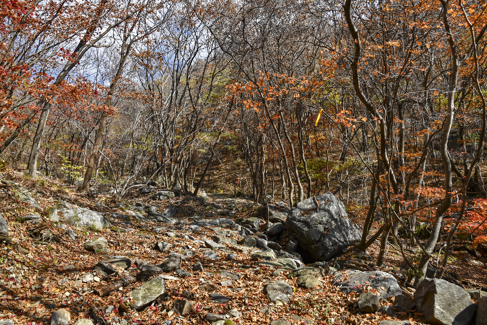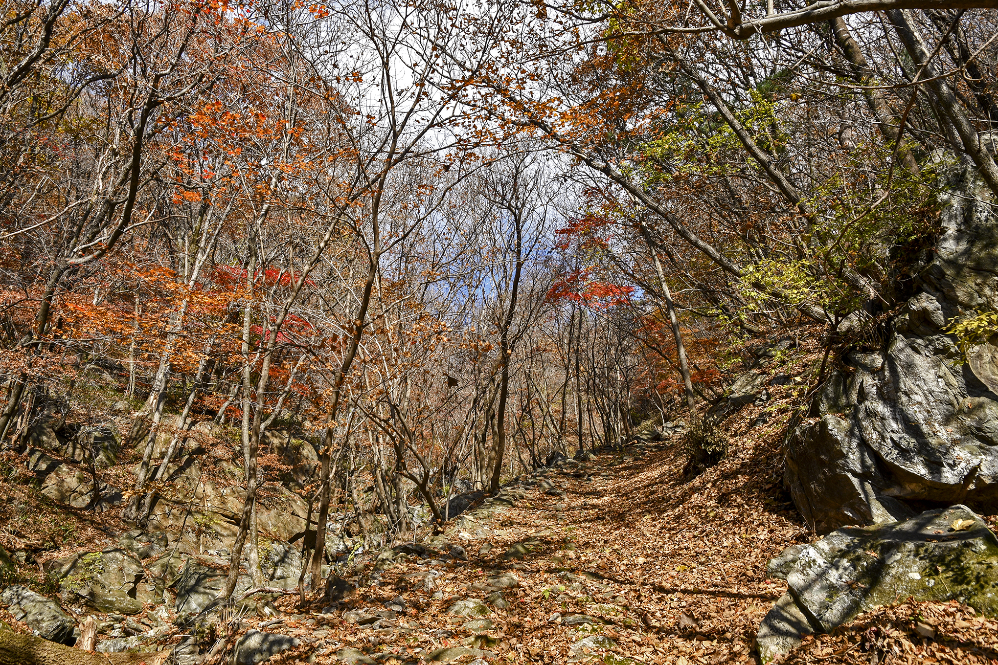 길이 좋아 보이지만 낙엽으로 가려진 너덜길이라 잘못 디디면 발목을 접질릴 수 있어 속도도 나지 않는다.