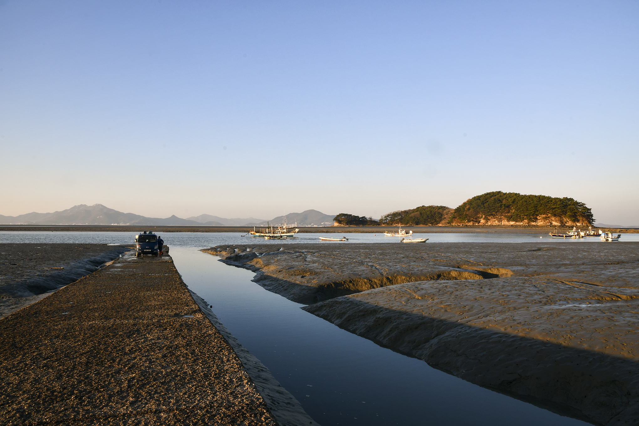선착장 아래로 내려갈수록 신시모도로 유명한 신도가 온전히 드러나고, 신도의 구봉산과 왕봉산으로 해가 넘어갈 것으로 보인다.