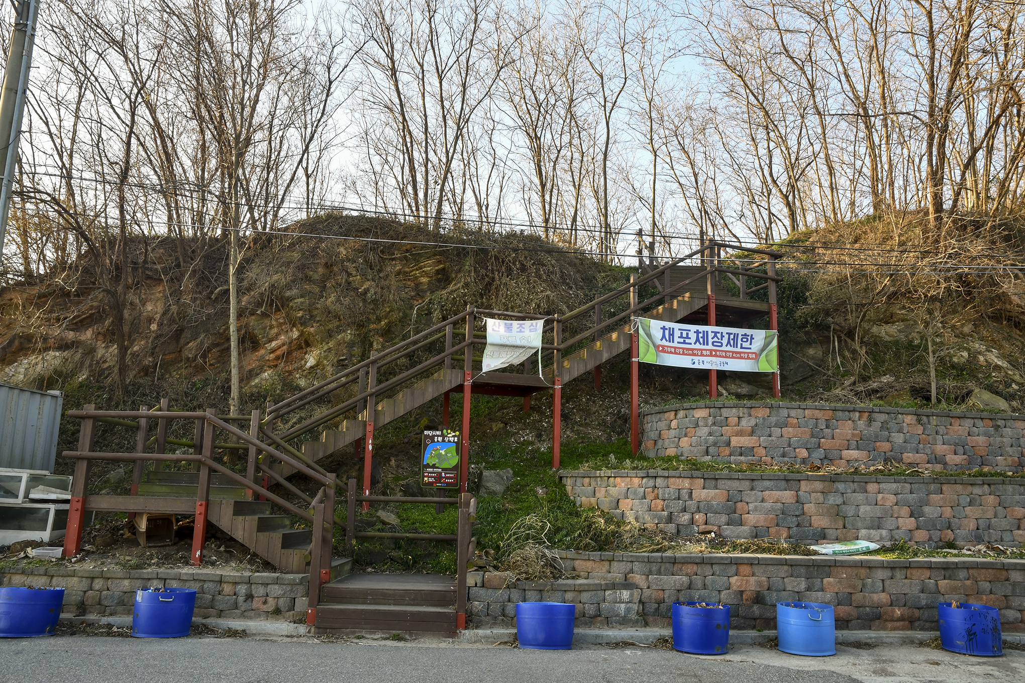 버스 앞쪽 예단포항 입구에 산으로 올라가는 데크계단이 만들어져 있다.