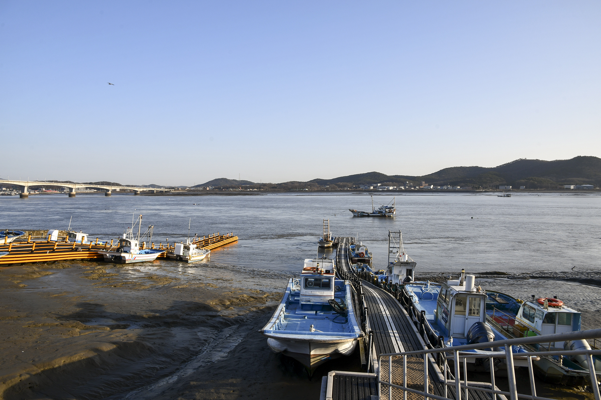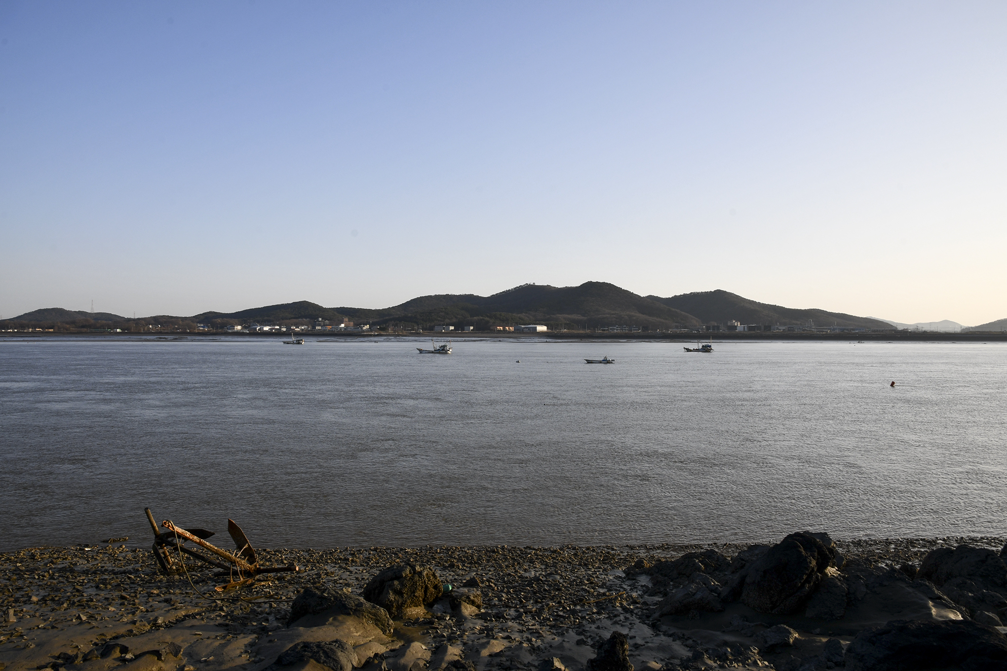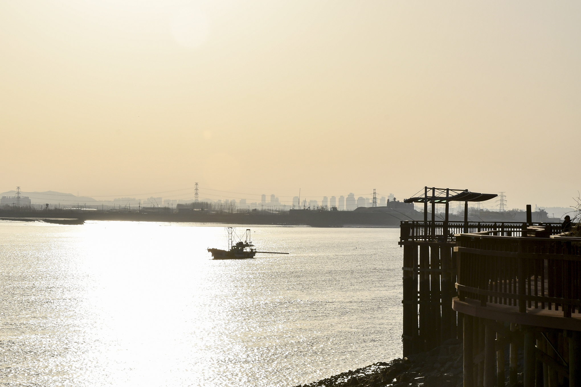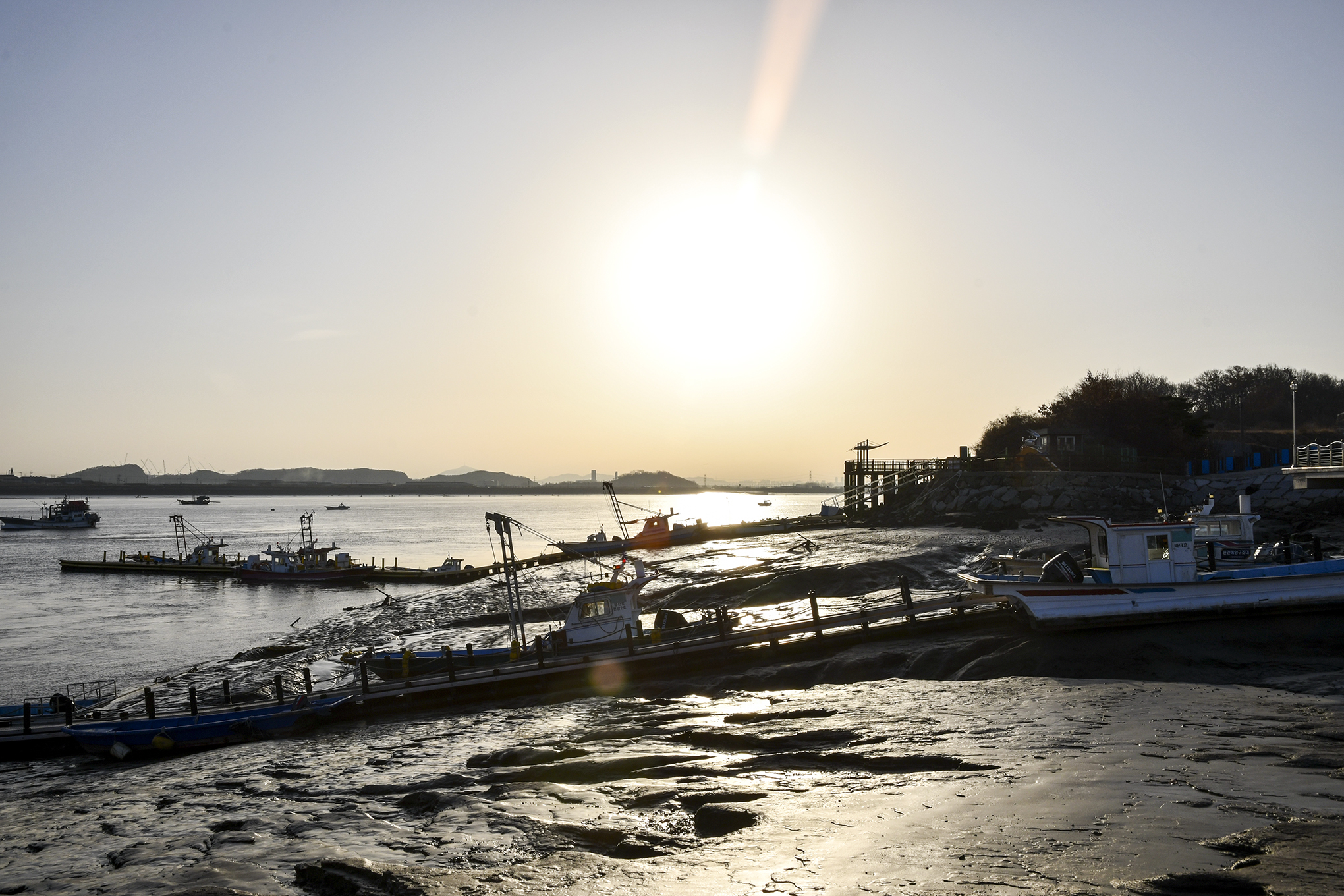 아직도 일출의 기운이 남아있는 염하와 정박해 있는 배들의 풍경이 이색적이다.