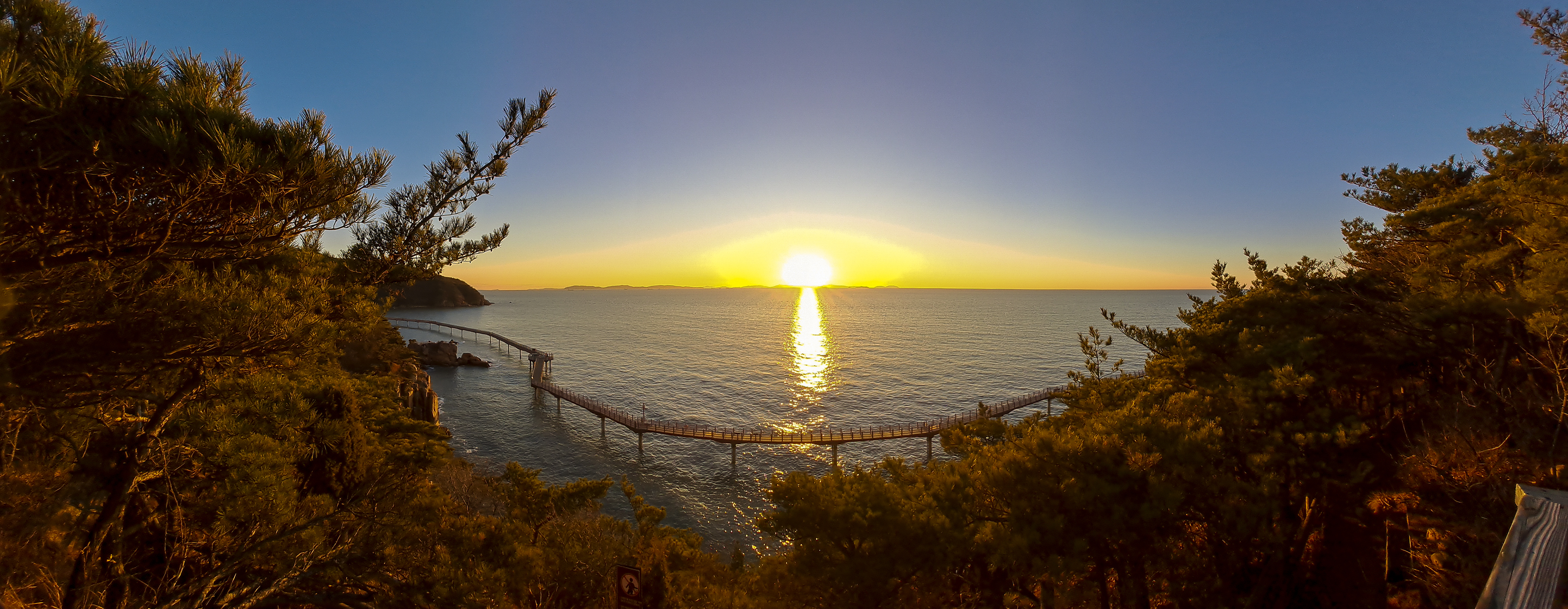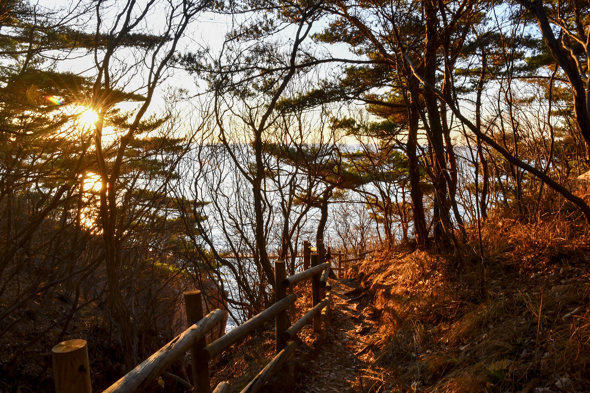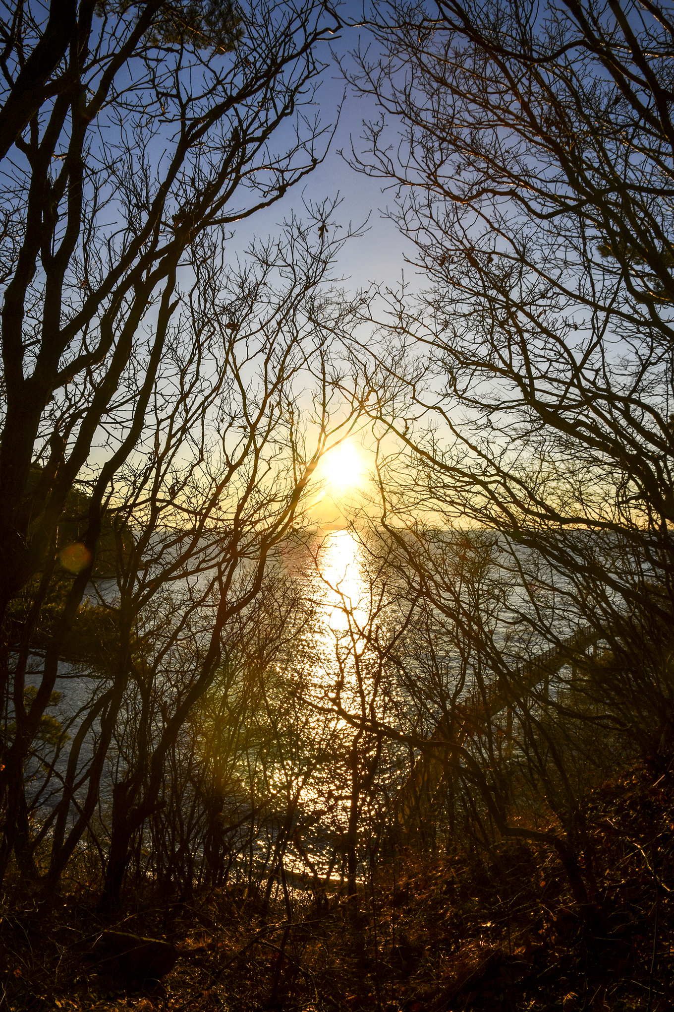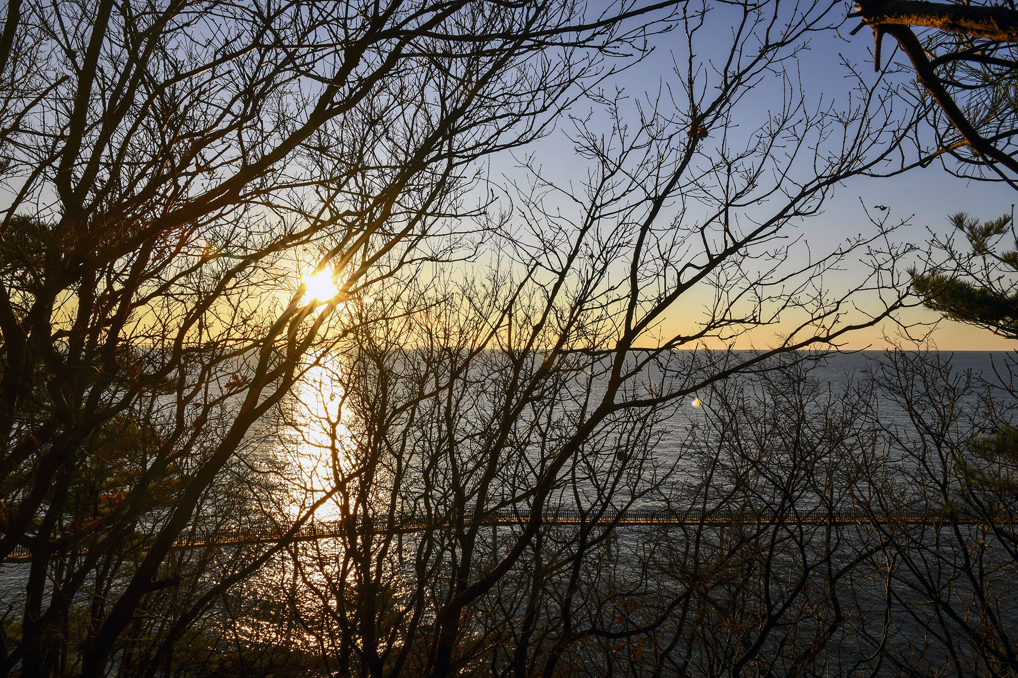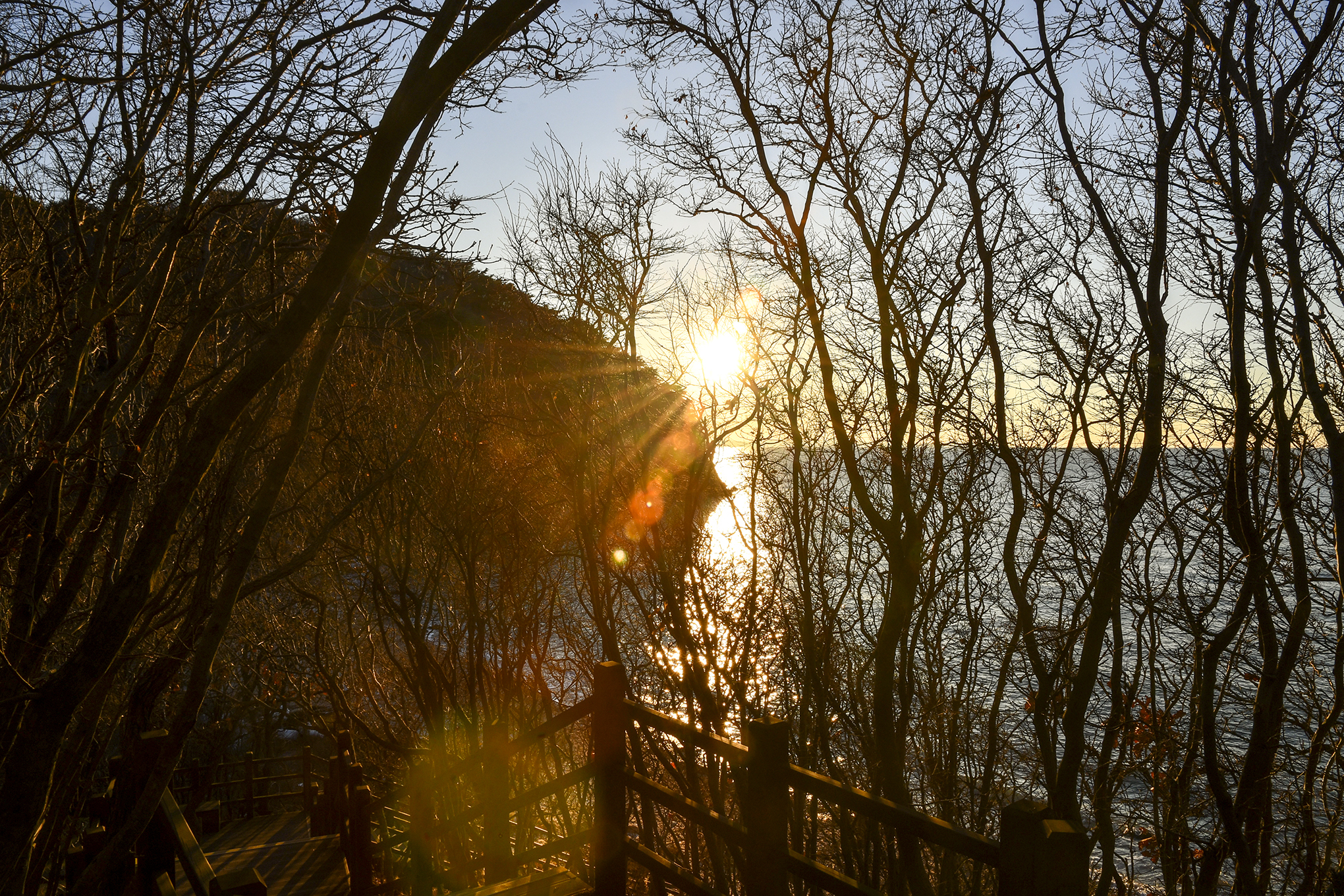 숲길로 들어서는 지점에서는 좌측의 섬 일부가 해넘이에 간섭하는 일몰각이다.