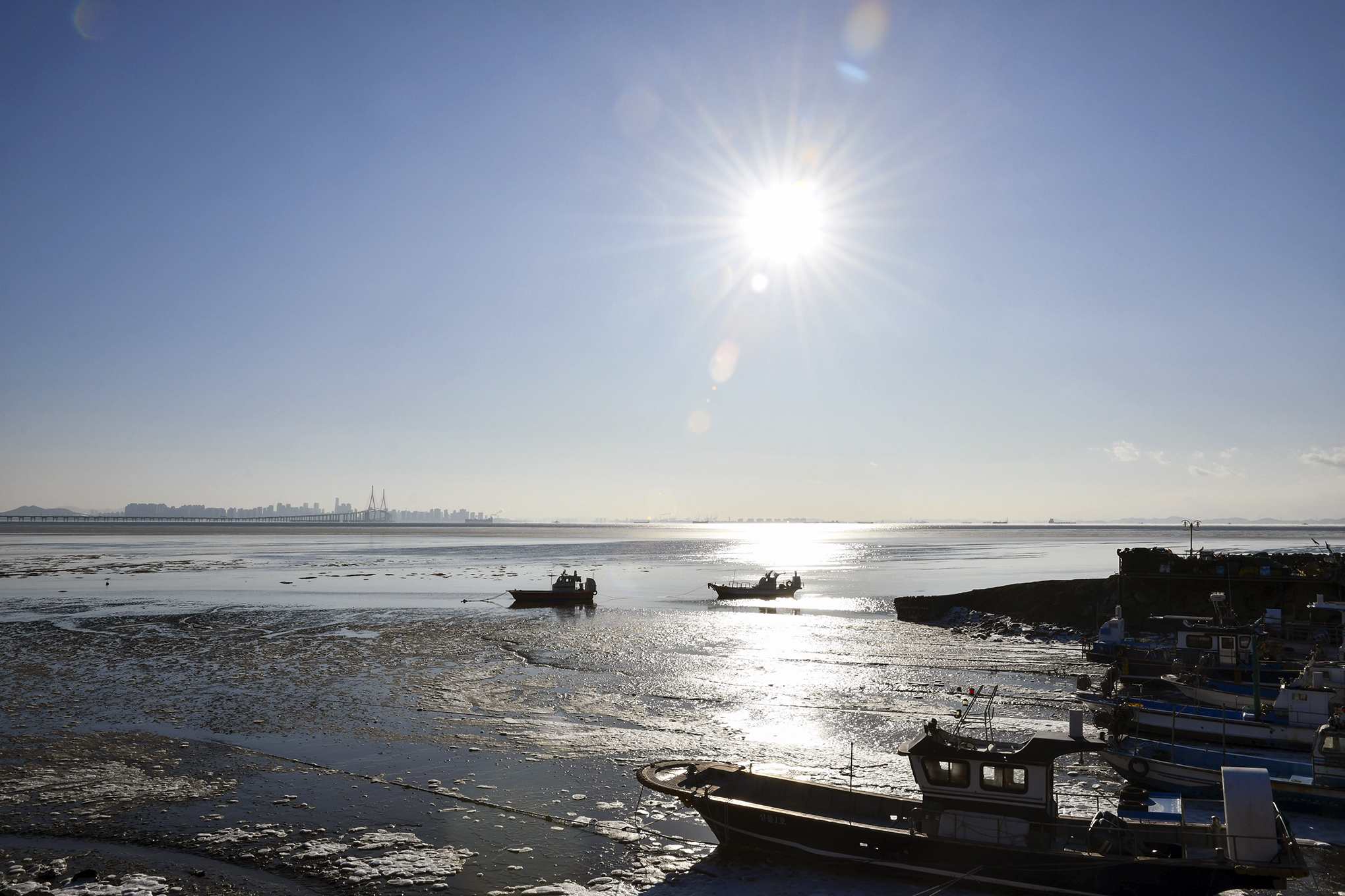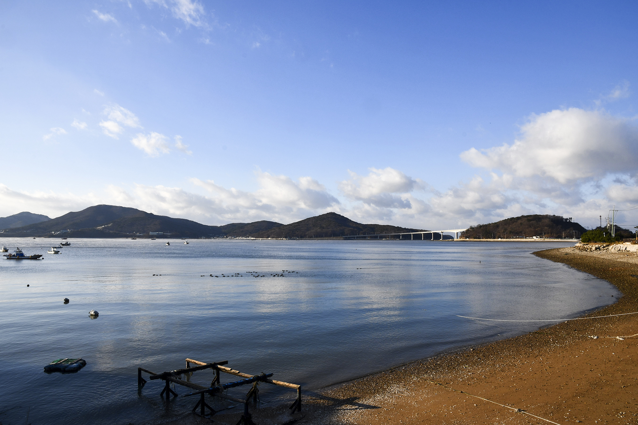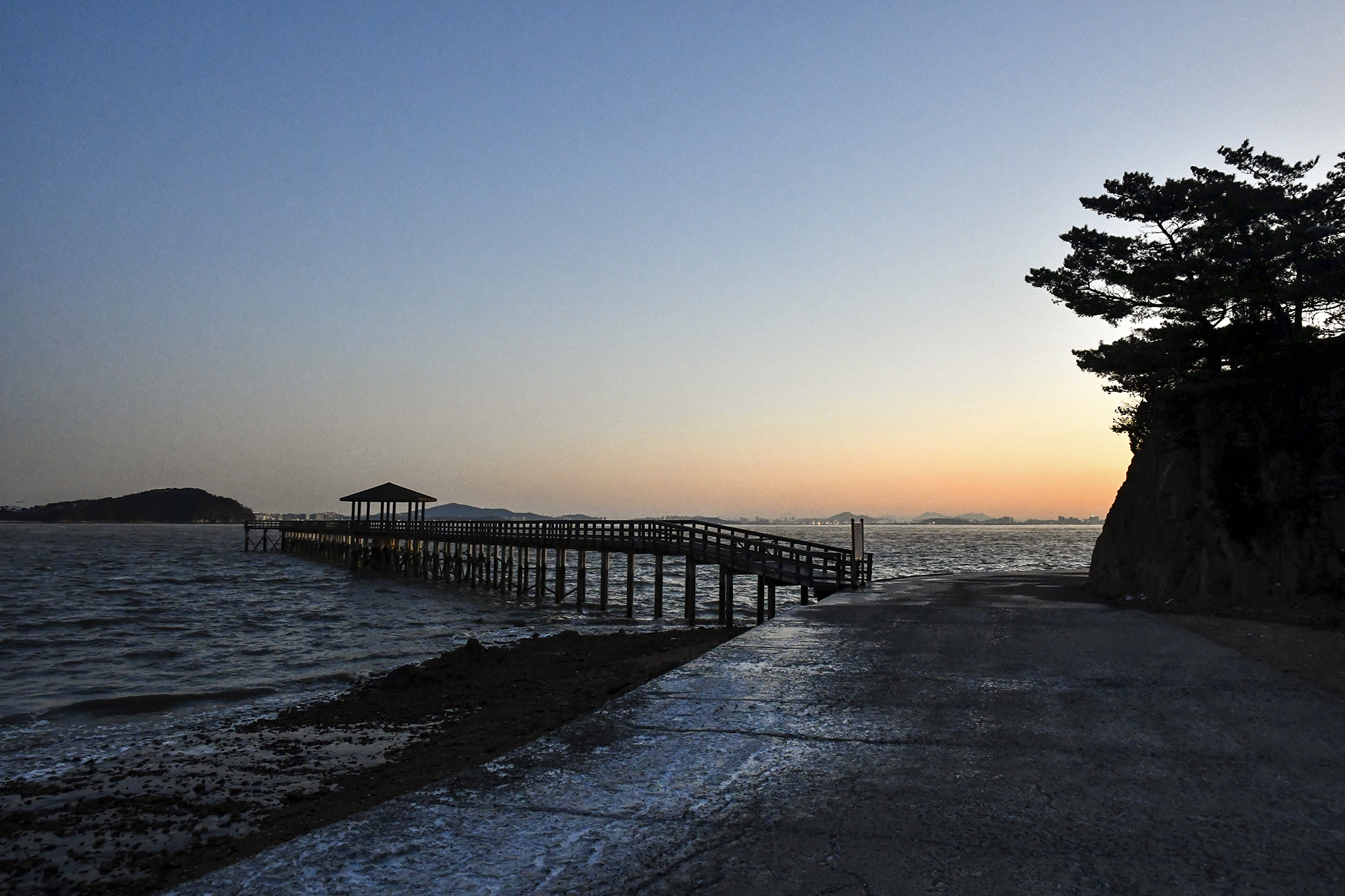 해안방조제를 따라 더 뒤로 물러나 선착장과 전망데크를 함께 담아보자.