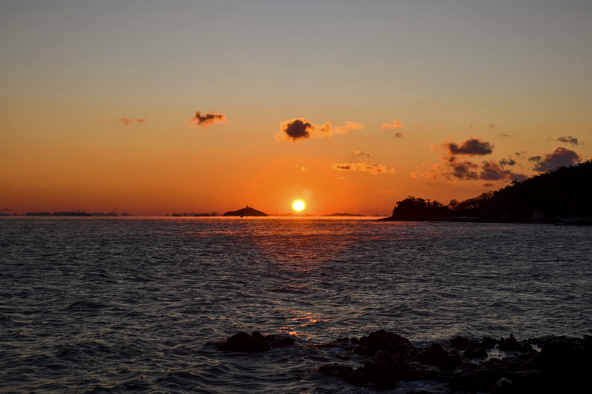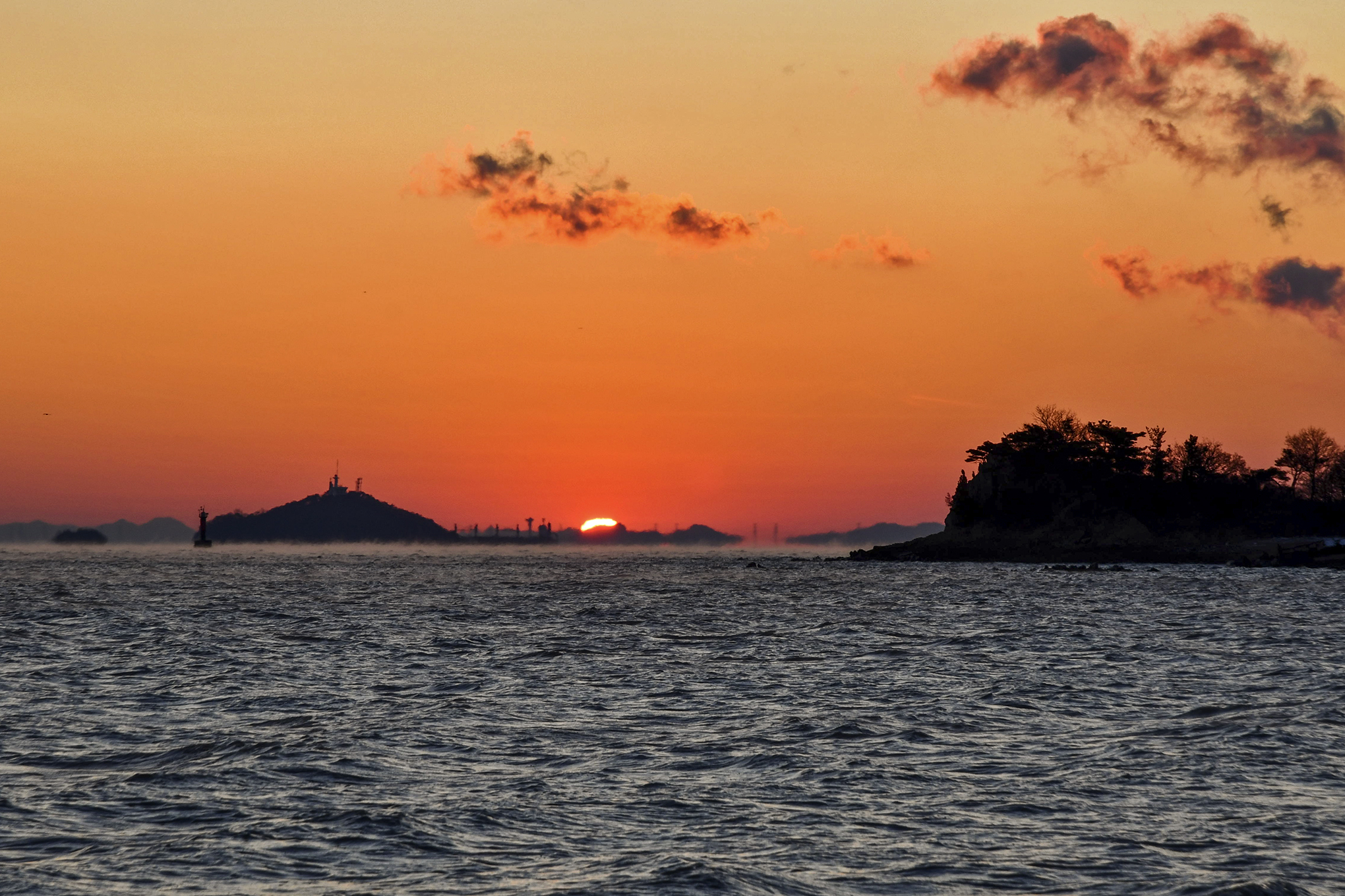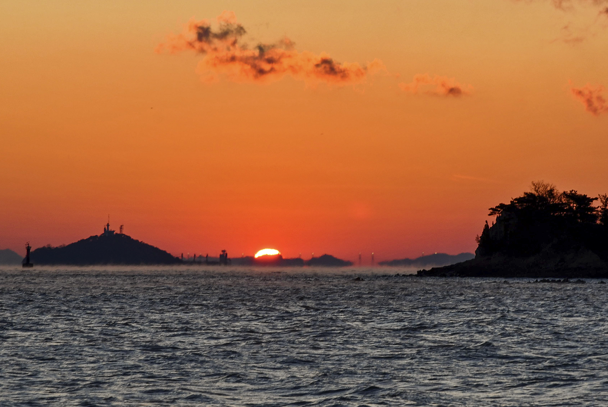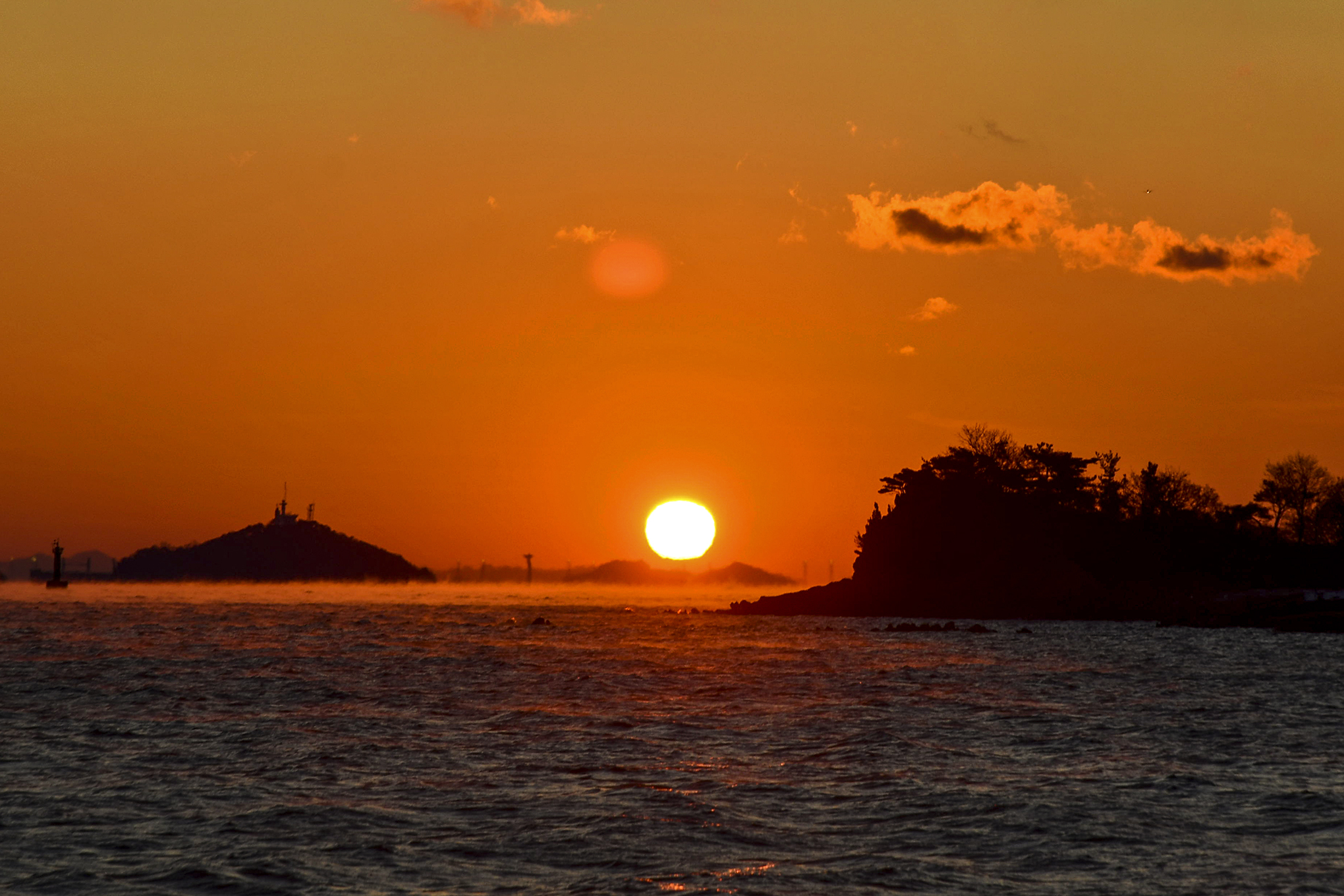 우측에 무의도 해안 절벽과 좌측에 이름모를 섬 사이로 이글거리며 뜨겁게 솟아 오른다.