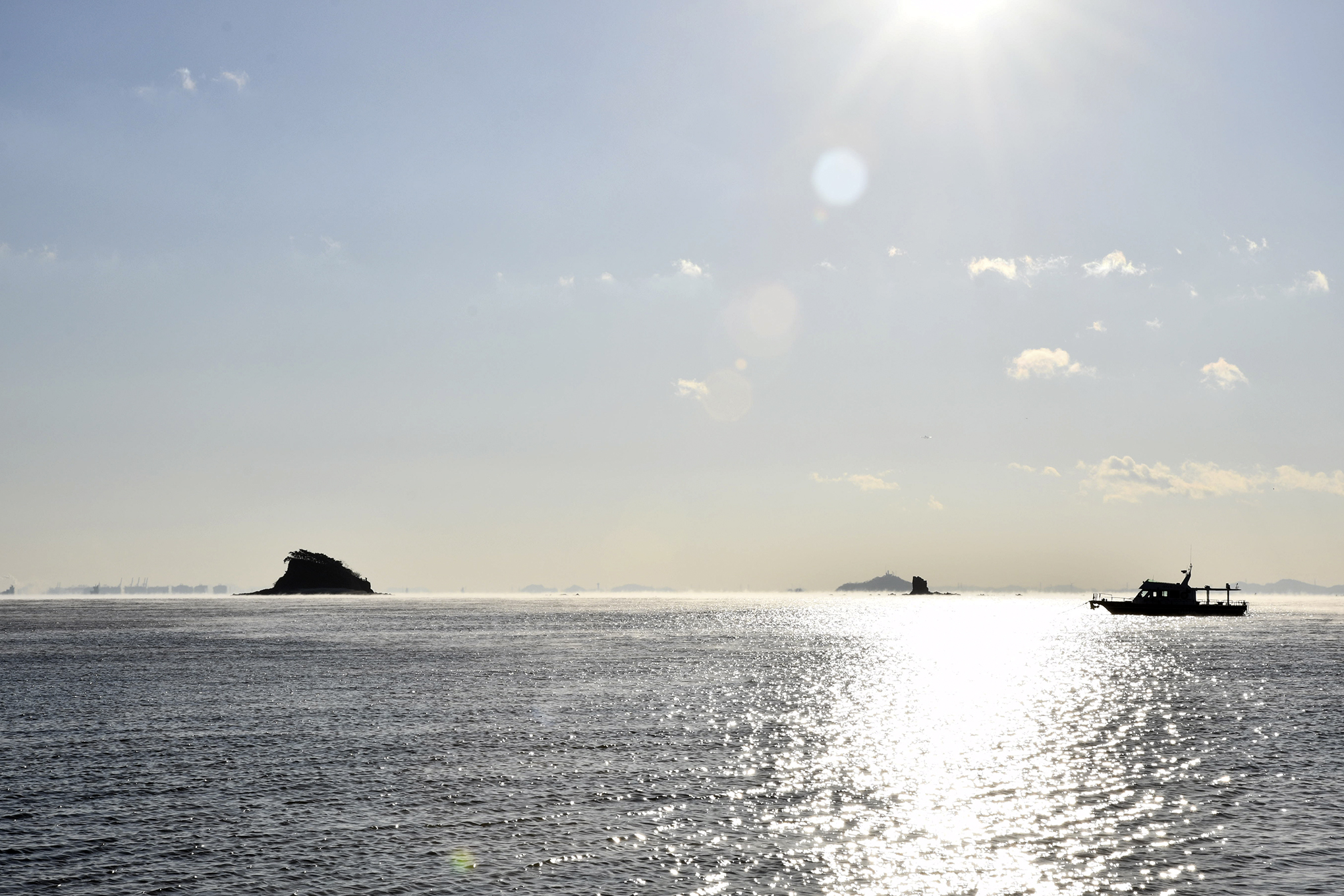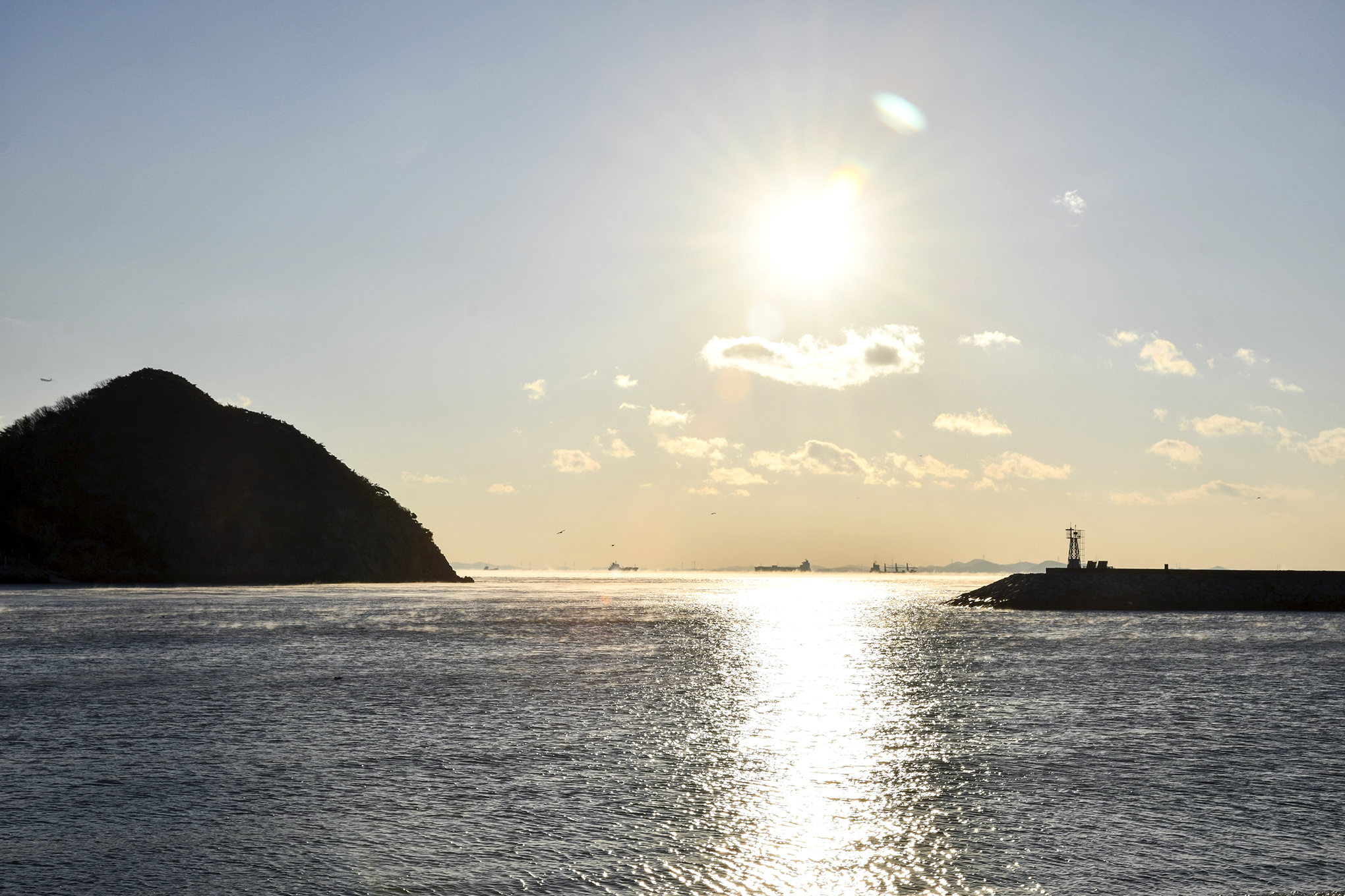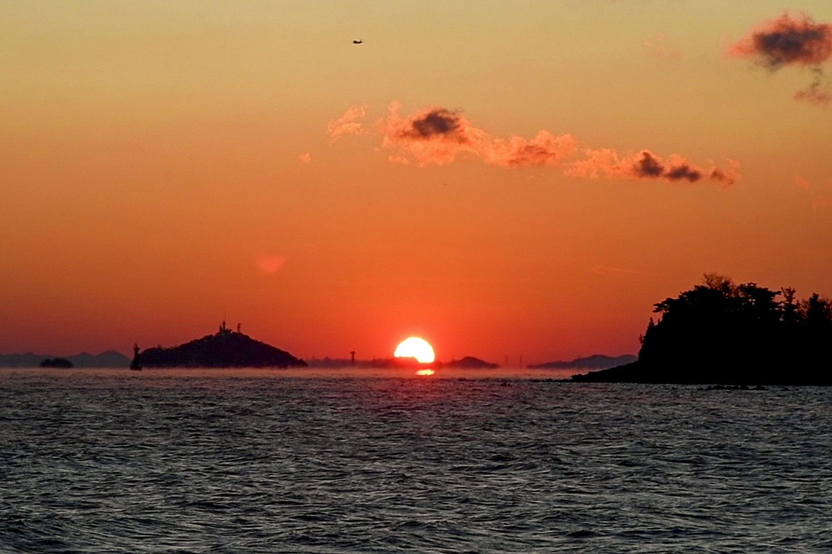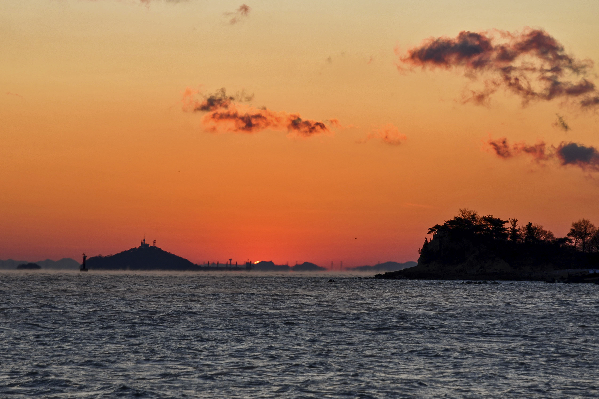 우측에 무의도 해안 절벽과 좌측에 이름모를 섬 사이로 이글거리며 뜨겁게 솟아 오른다.