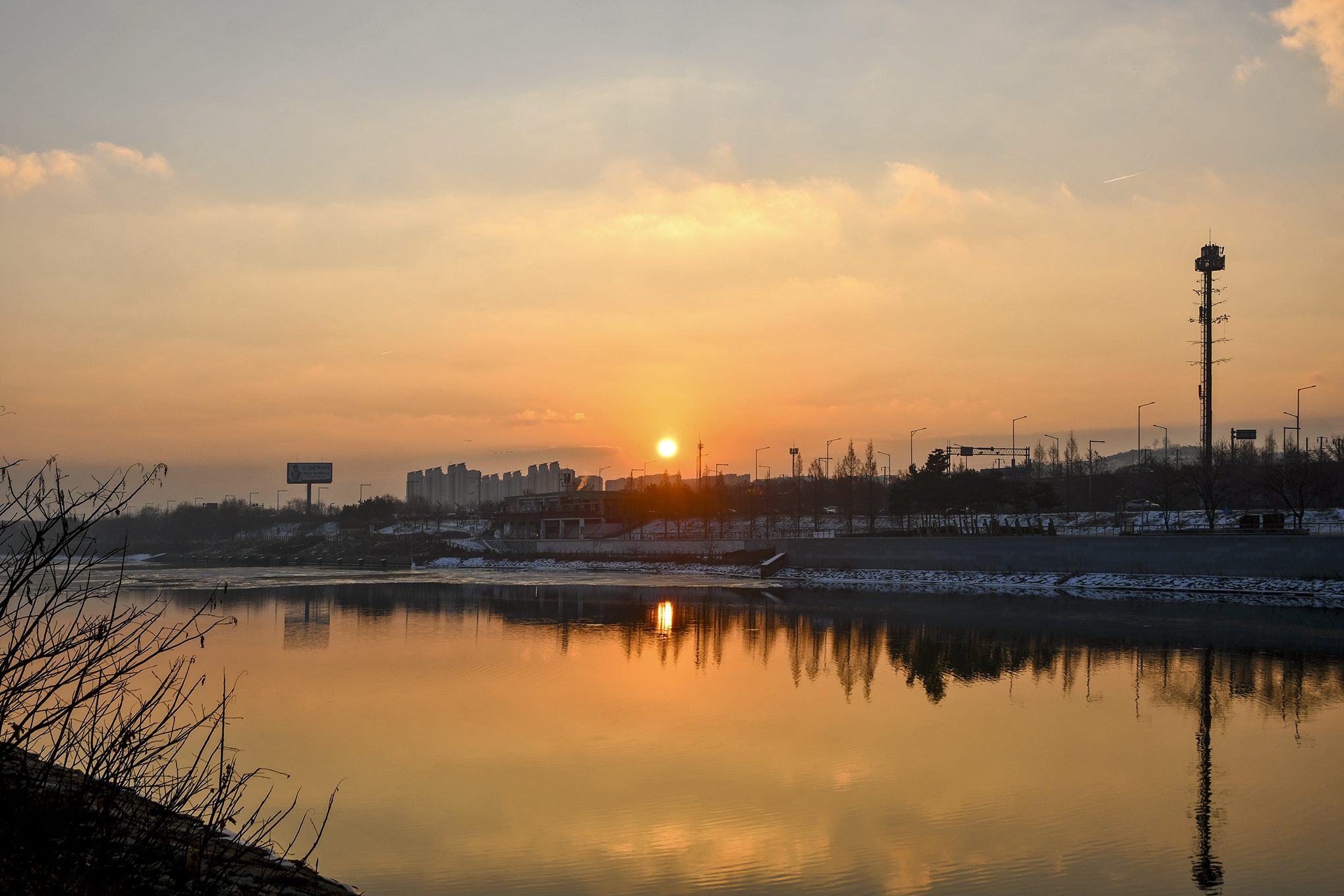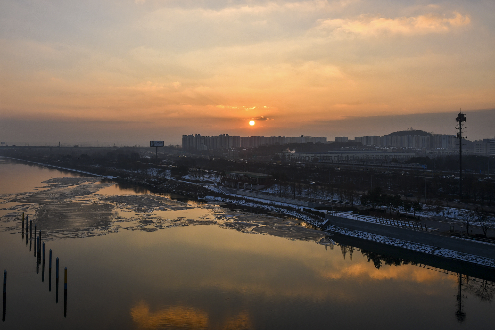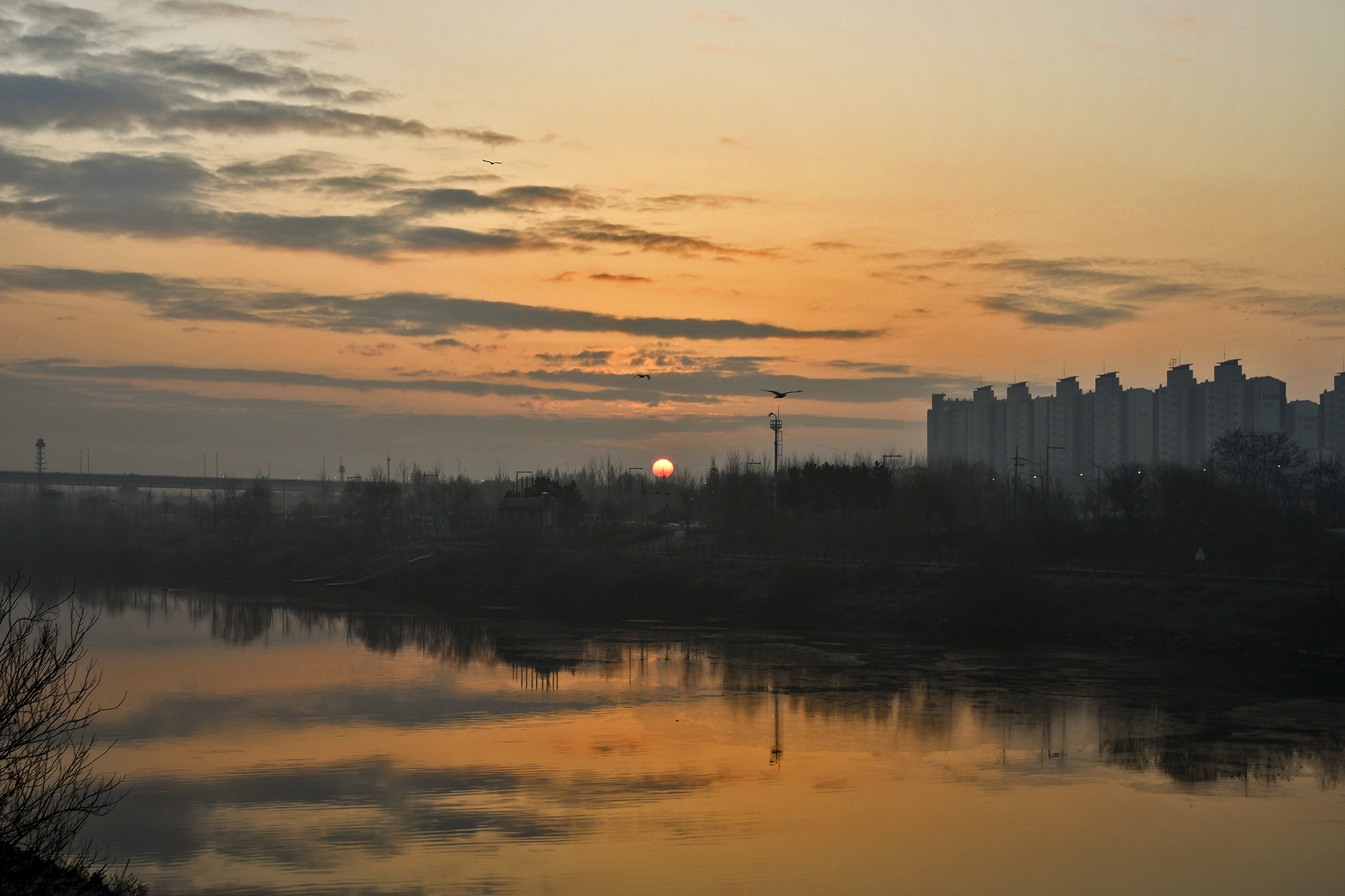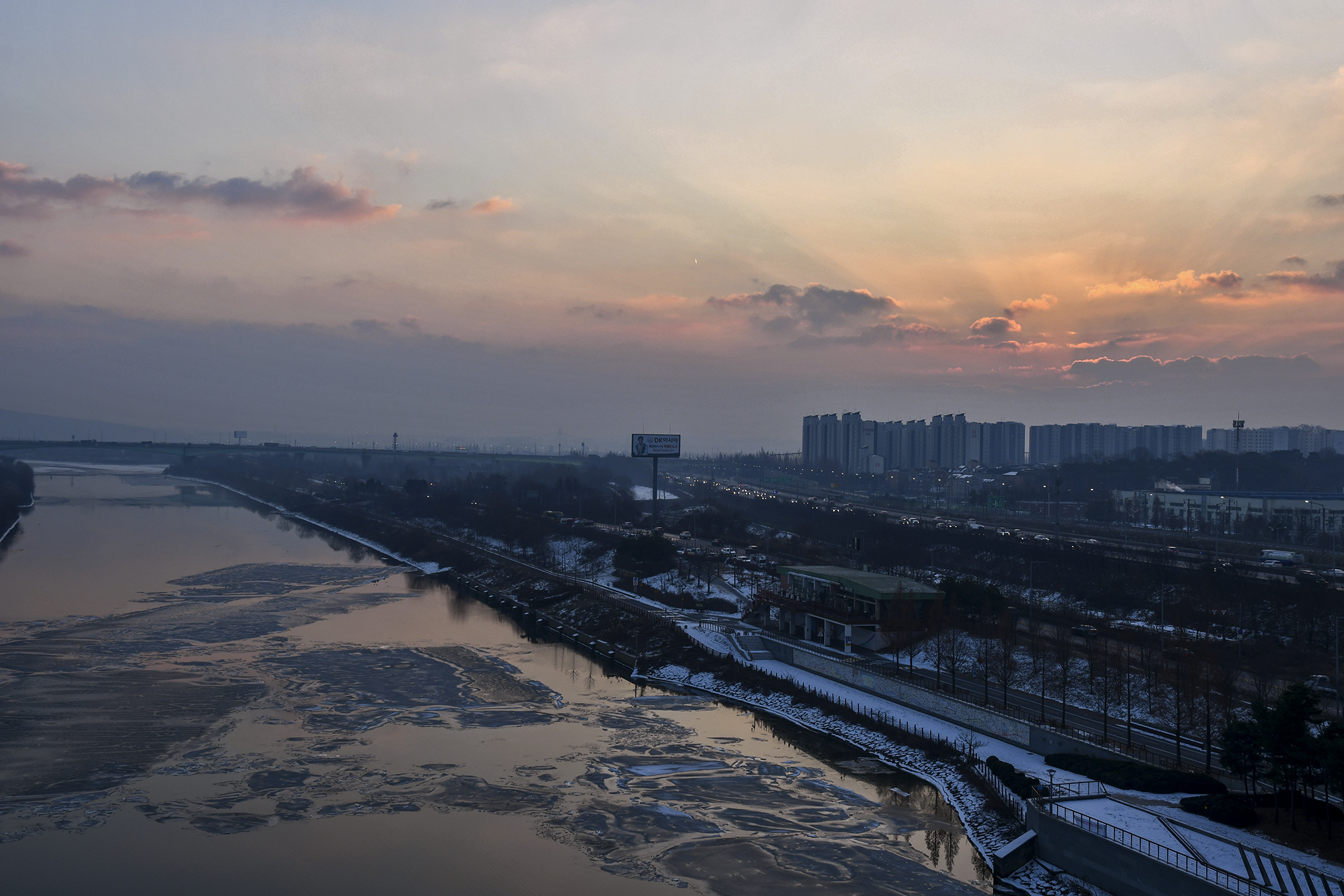 아라뱃길 중간에서 떠오르면 좋을텐데 계절상 우측 아파트 뒤로 떠오르는 일출각이다.