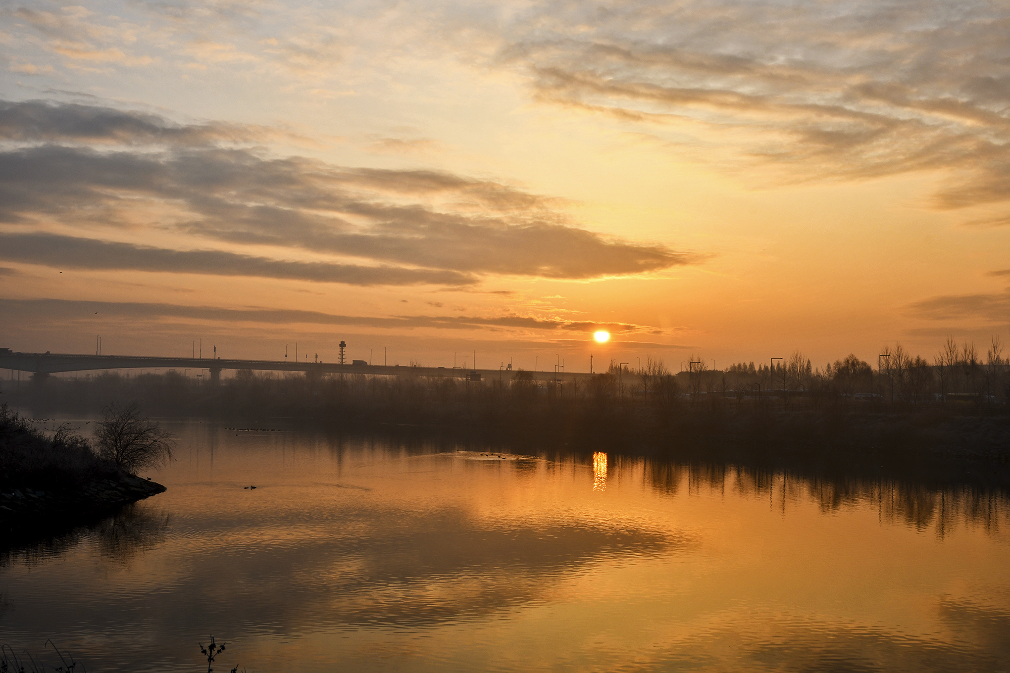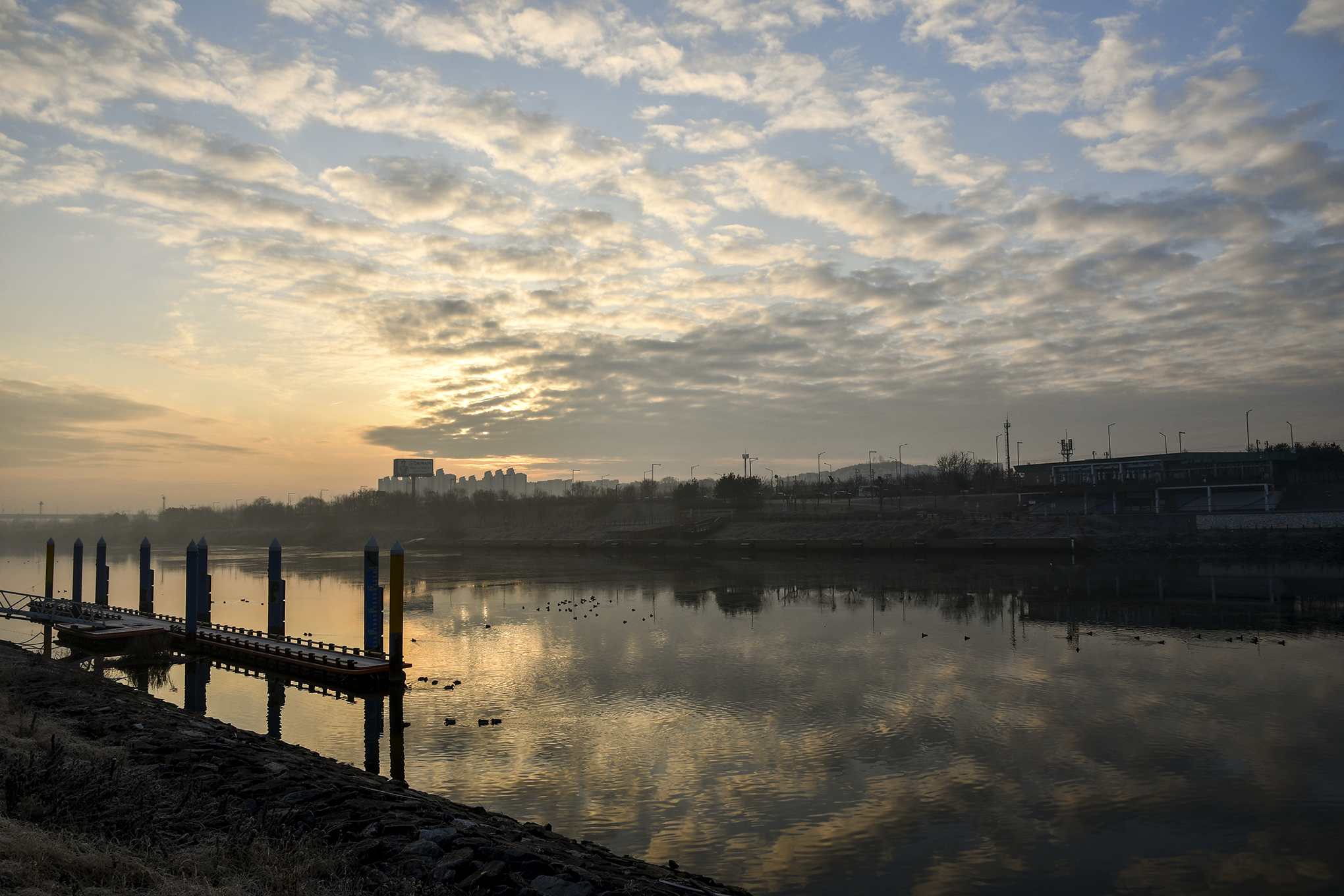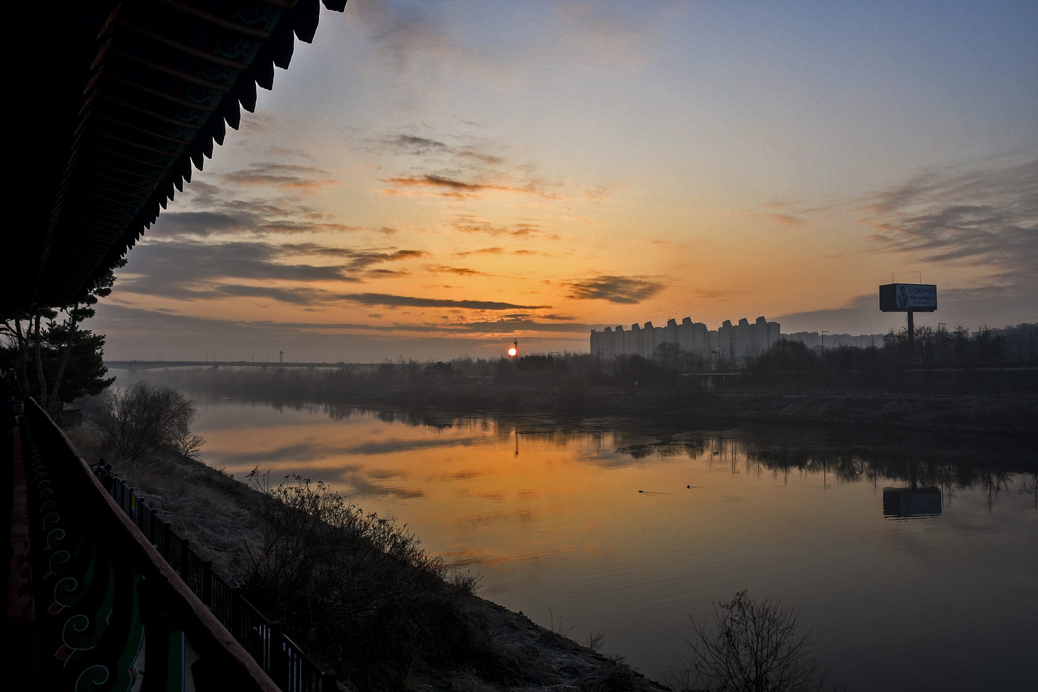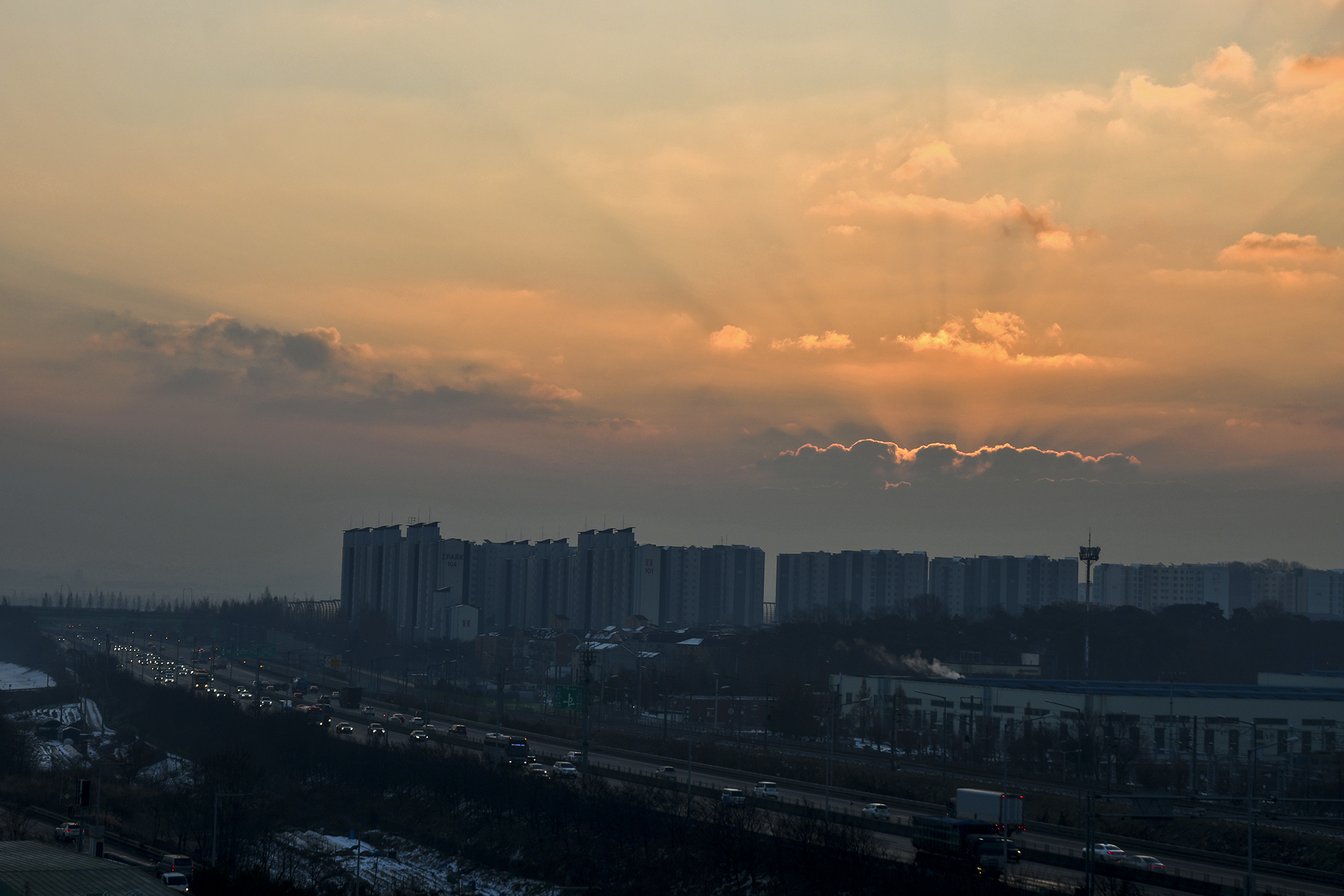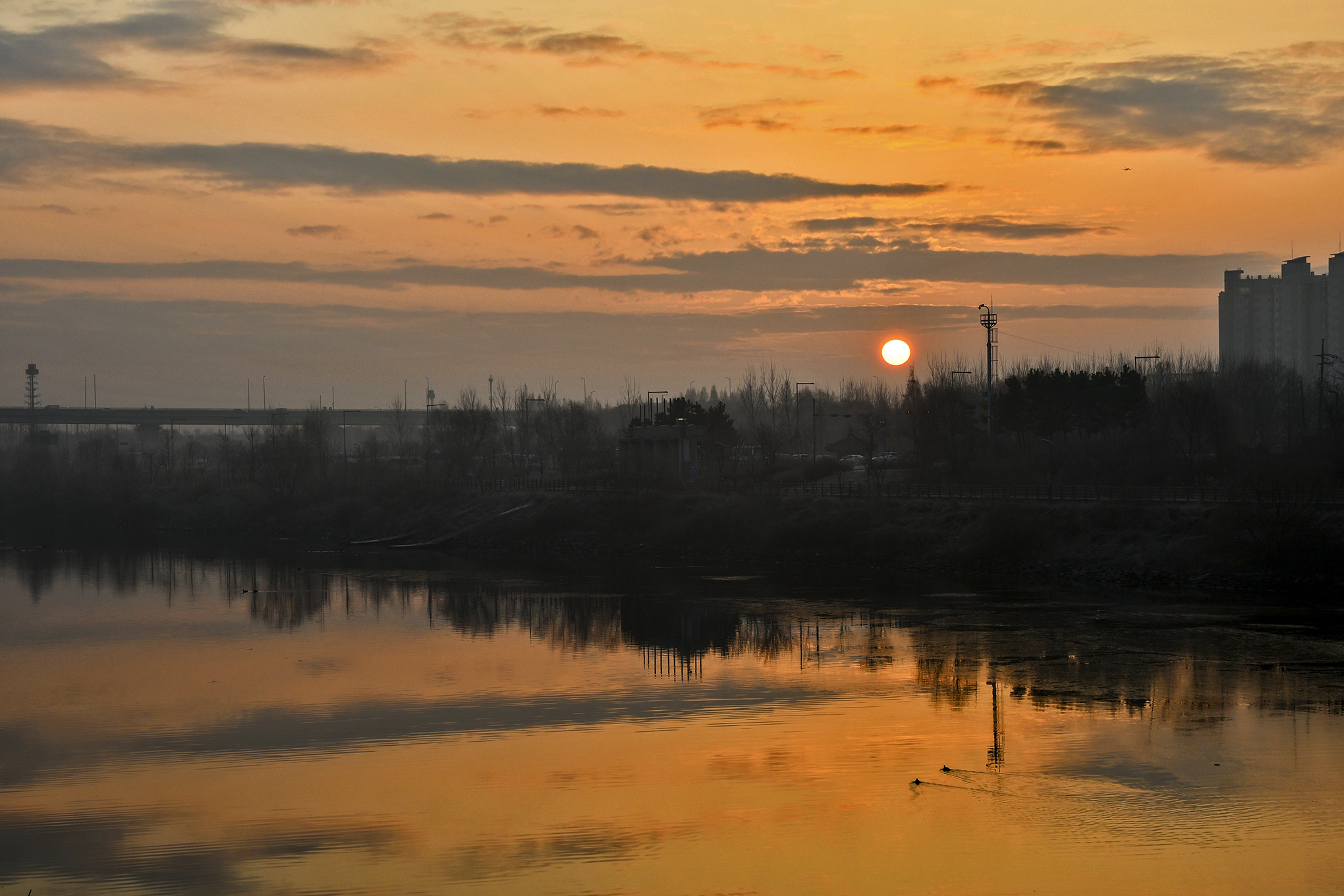 아라뱃길 중간에서 떠오르면 좋을텐데 계절상 우측 아파트 뒤로 떠오르는 일출각이다.