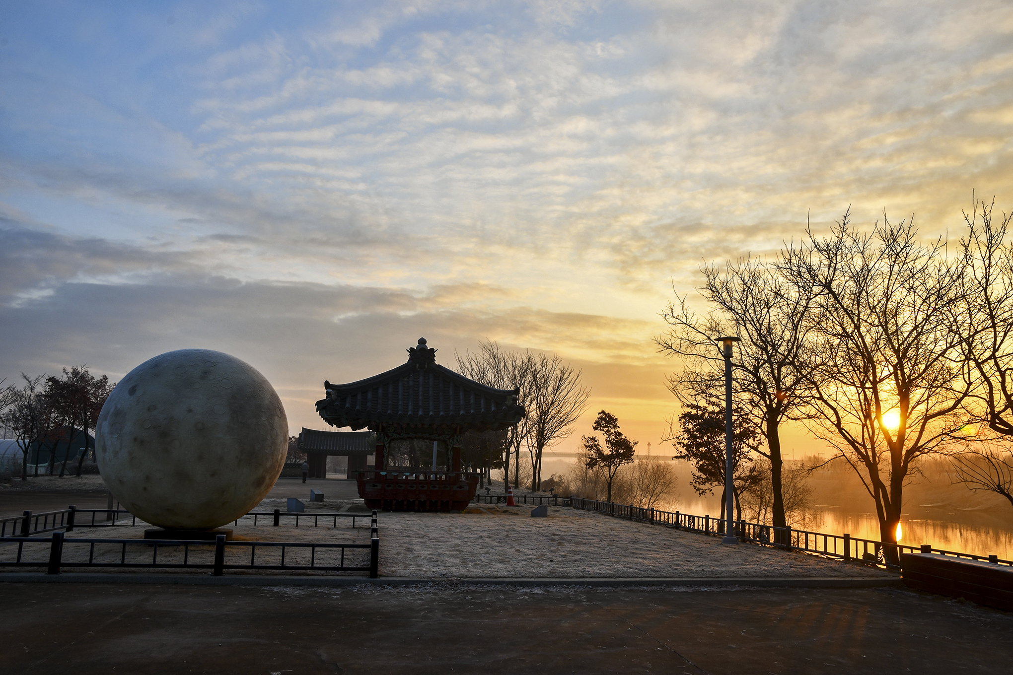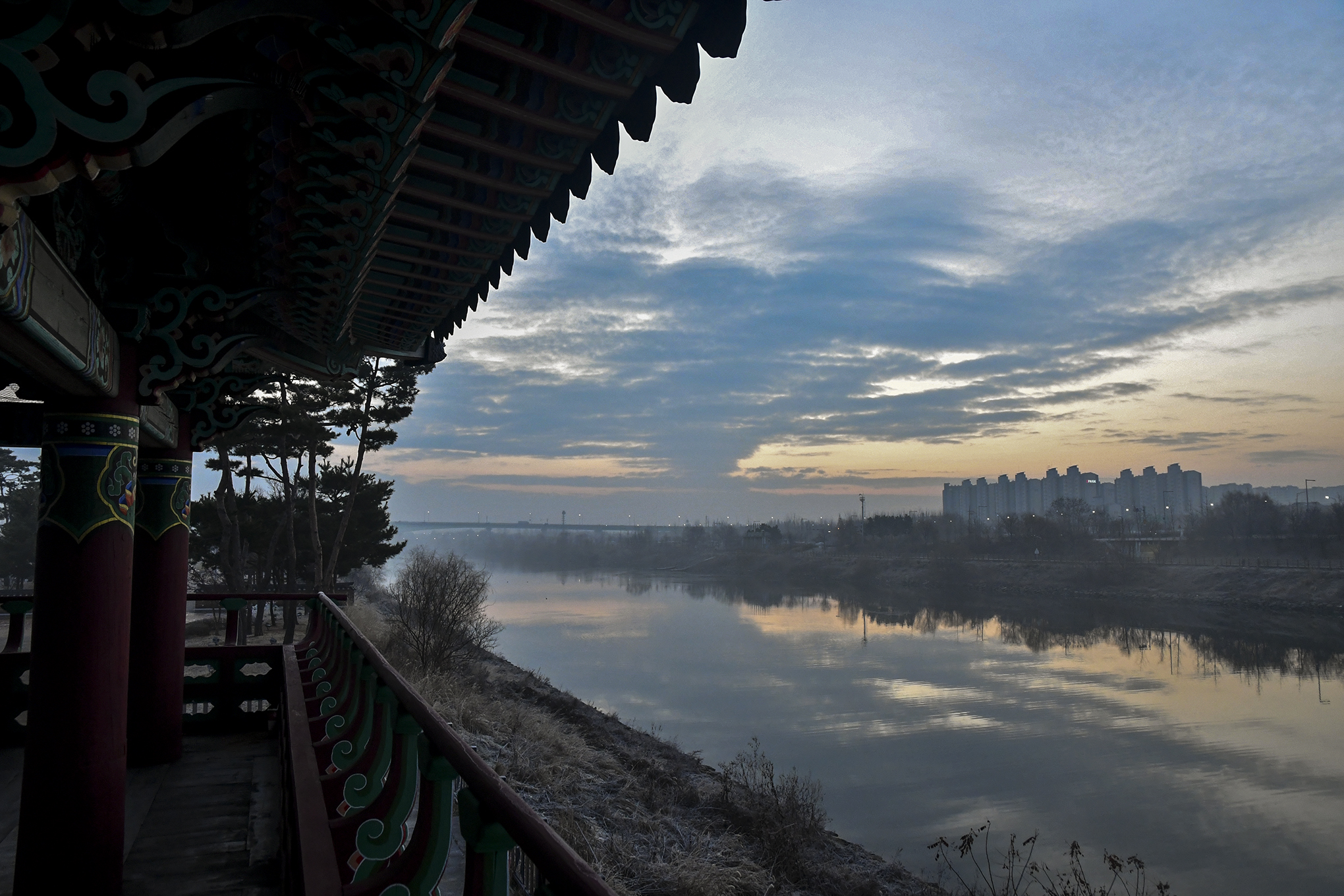 수향루 위로 올라와 바라본 모습, 새해 첫 해가 뜨는 방향인데 구름층이 두텁고 안개가 뿌옇다.