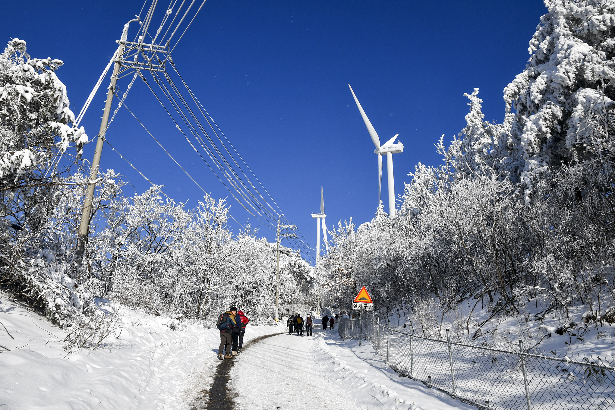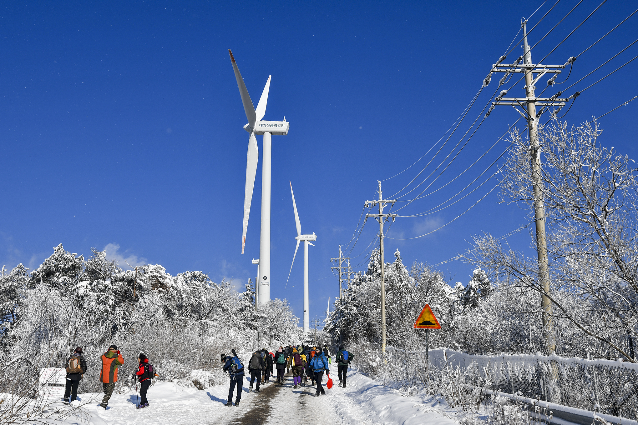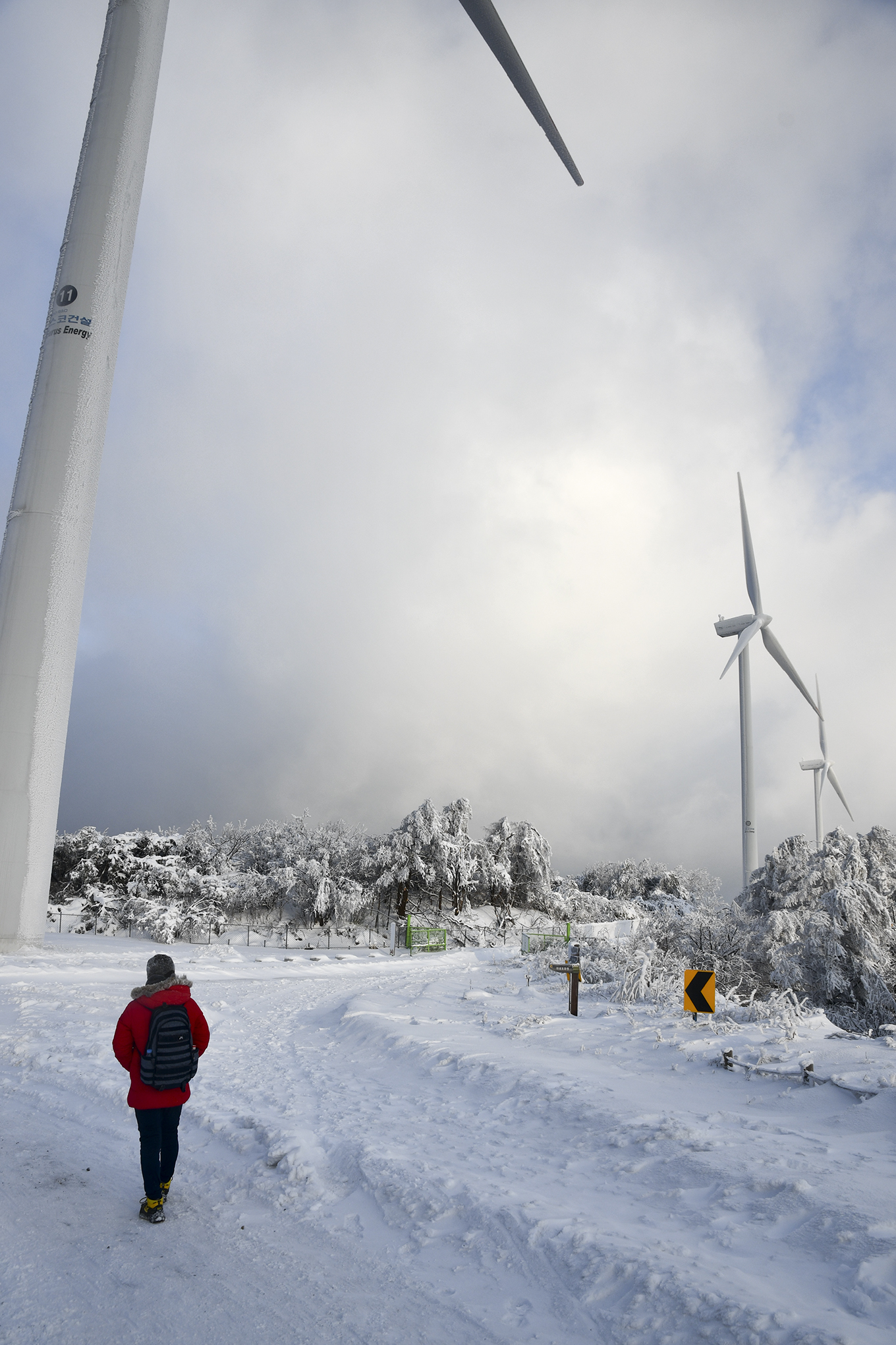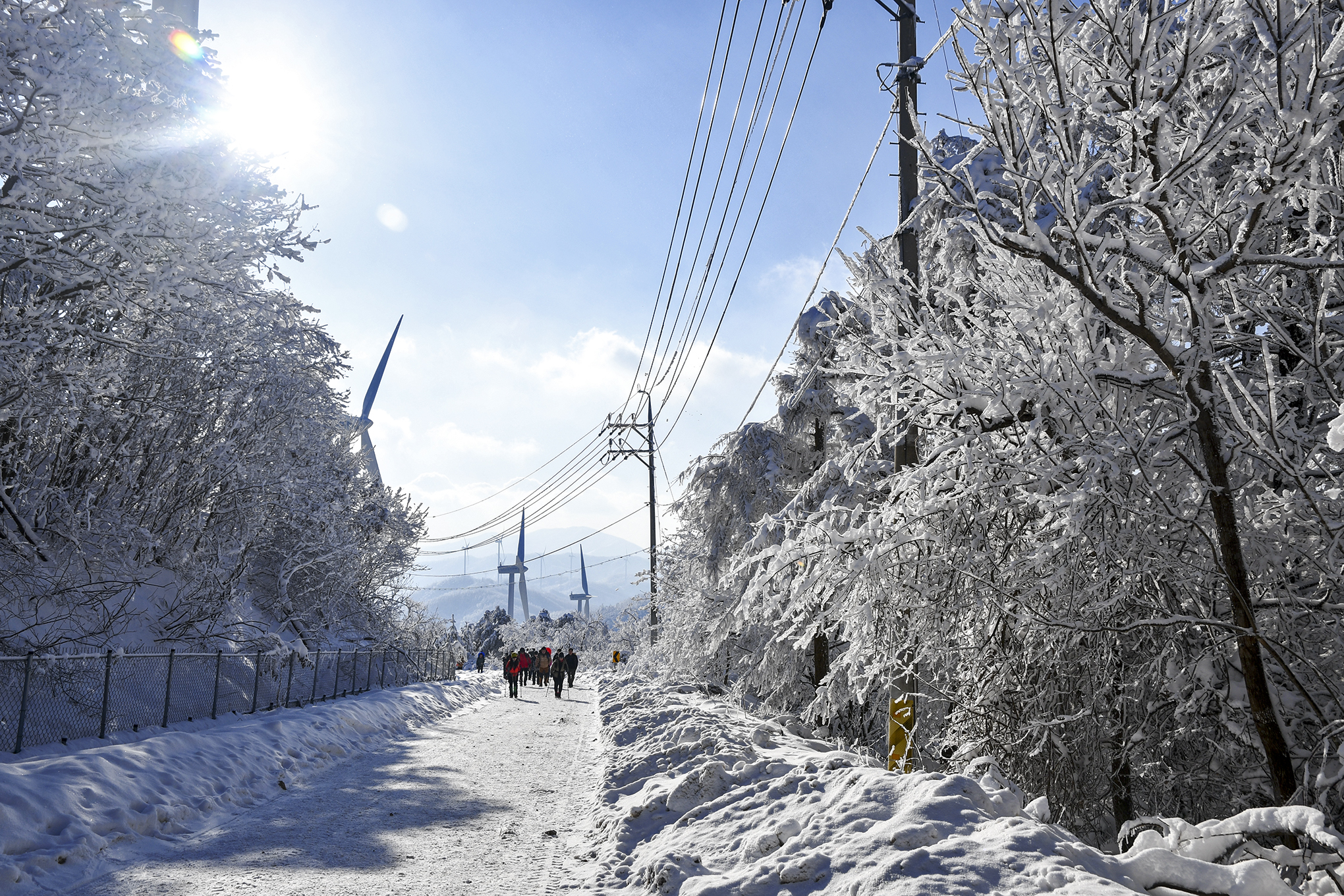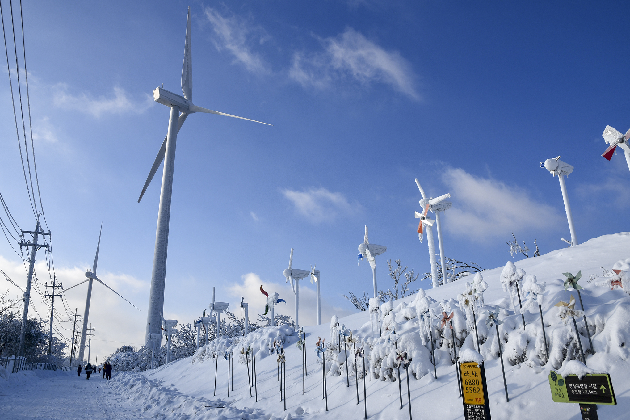태기산에는 풍력발전단지가 있는데 설경과 너무도 잘 어울리는 풍경이다.