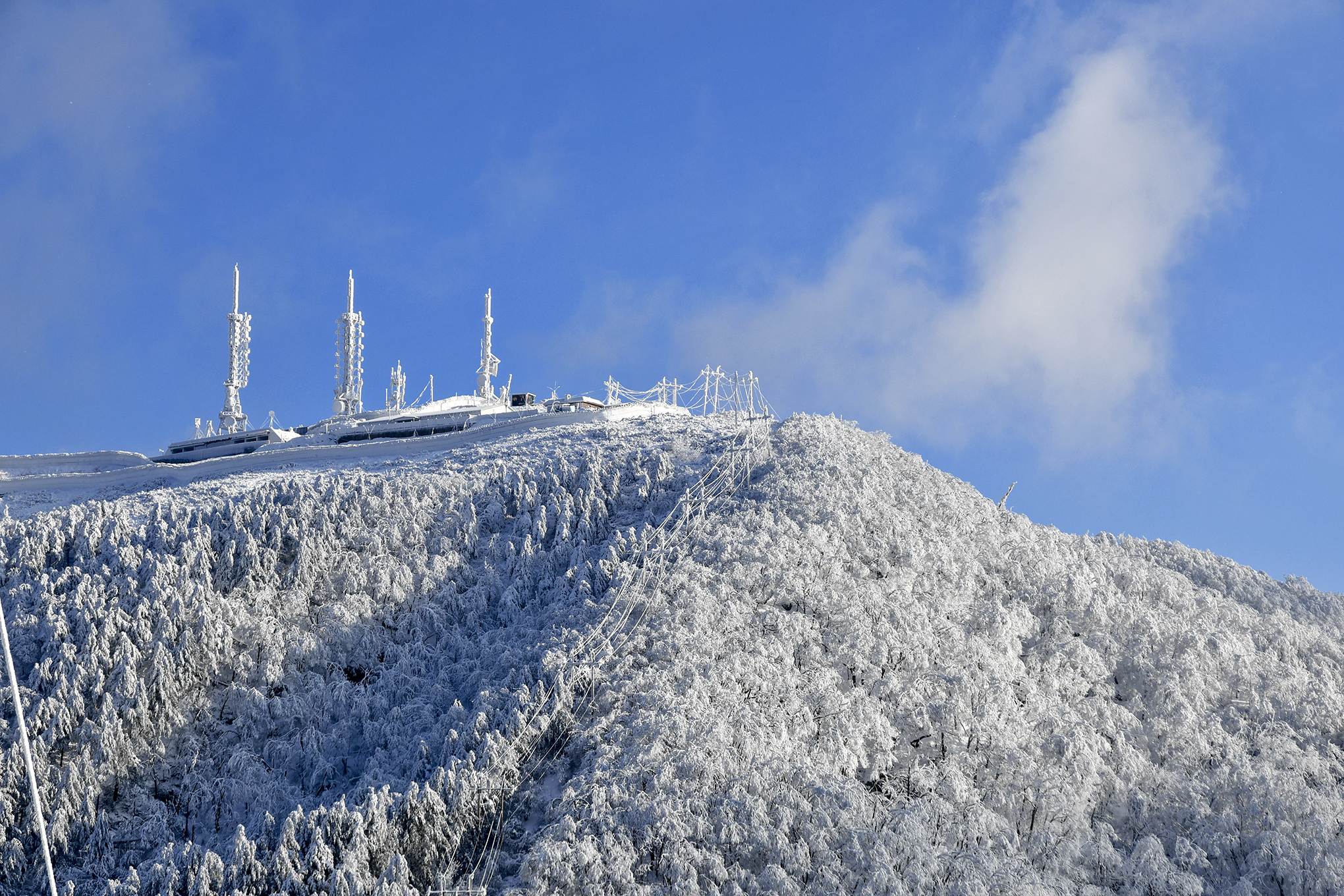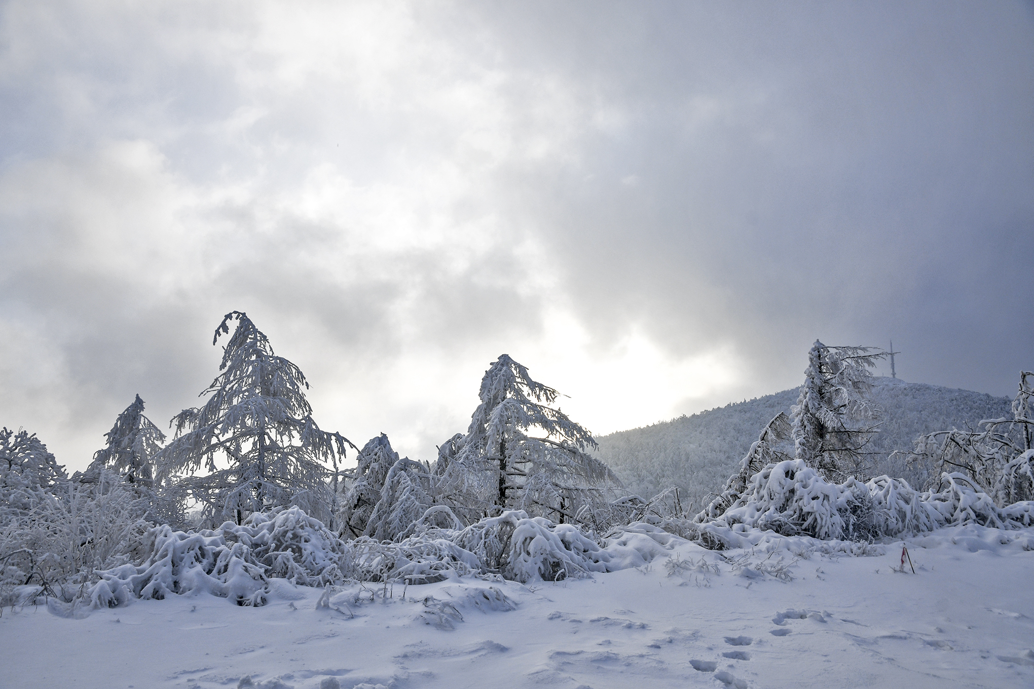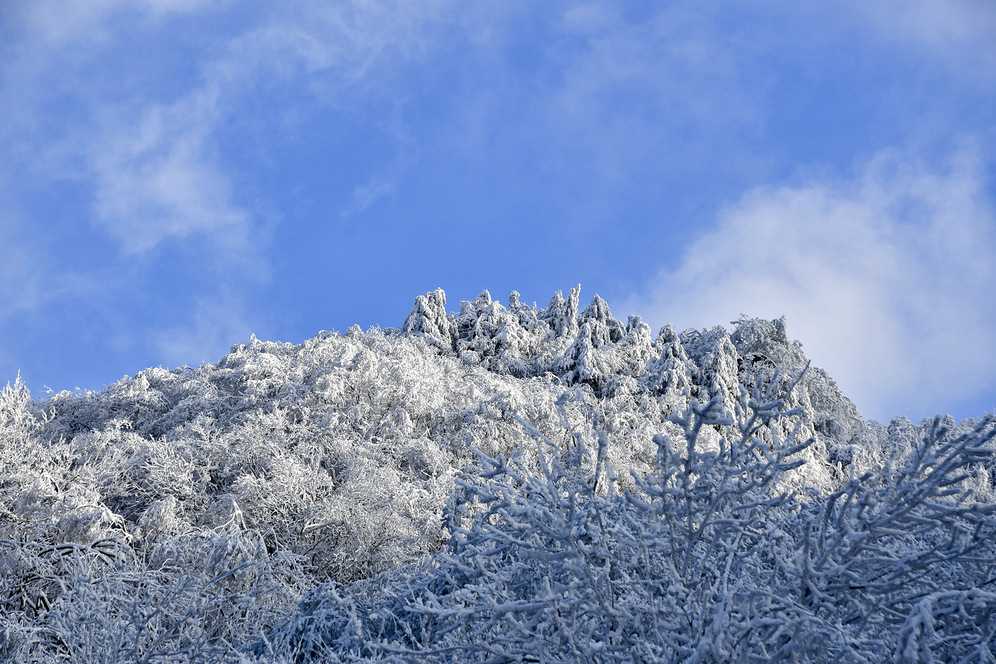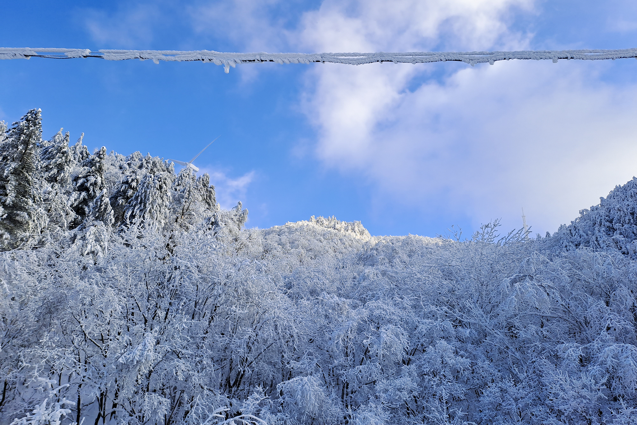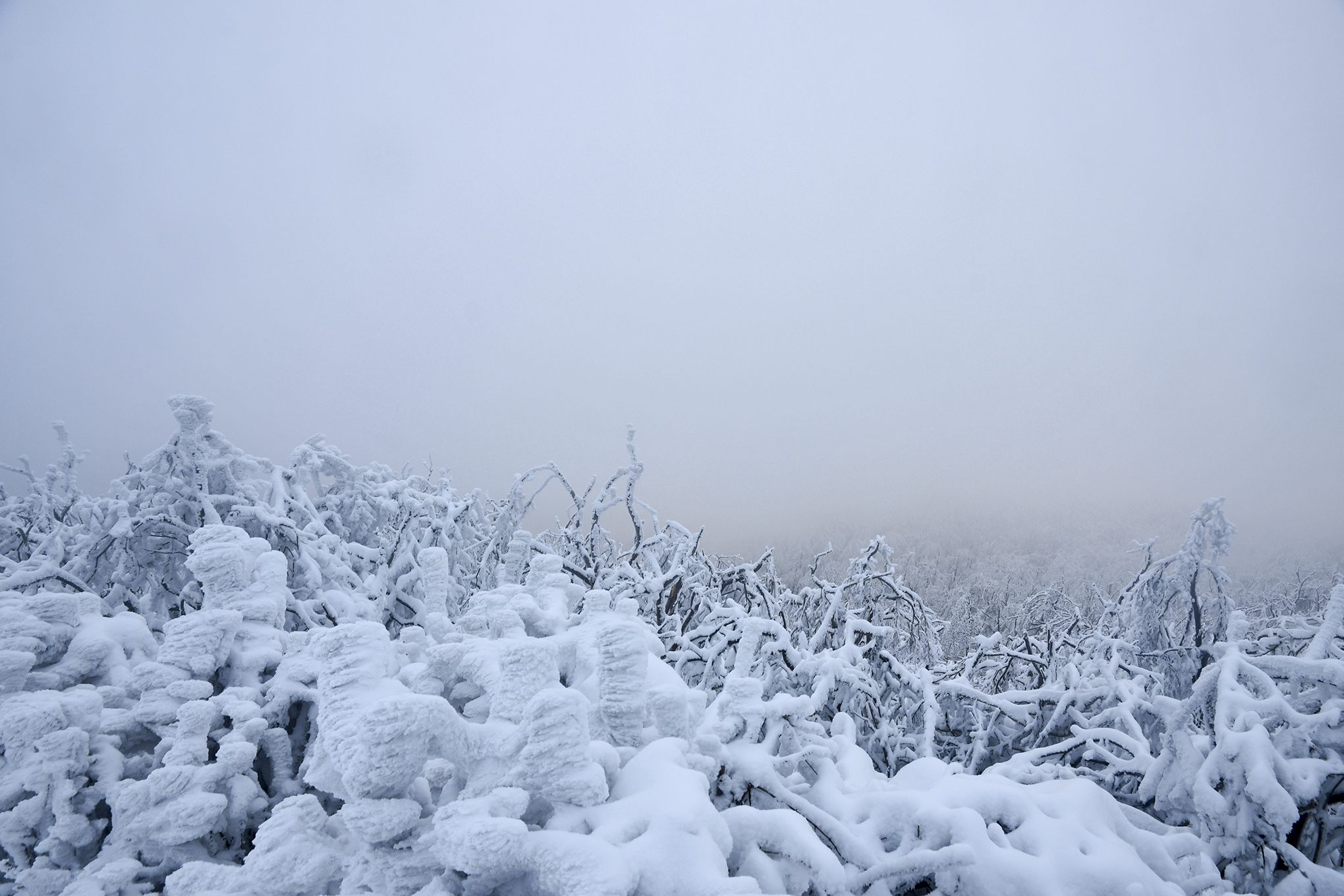 상고대라기 보다는 빙설에 가까울 정도로 가지마다 얼음덩어리들이 뭉쳐있는 모습이다.