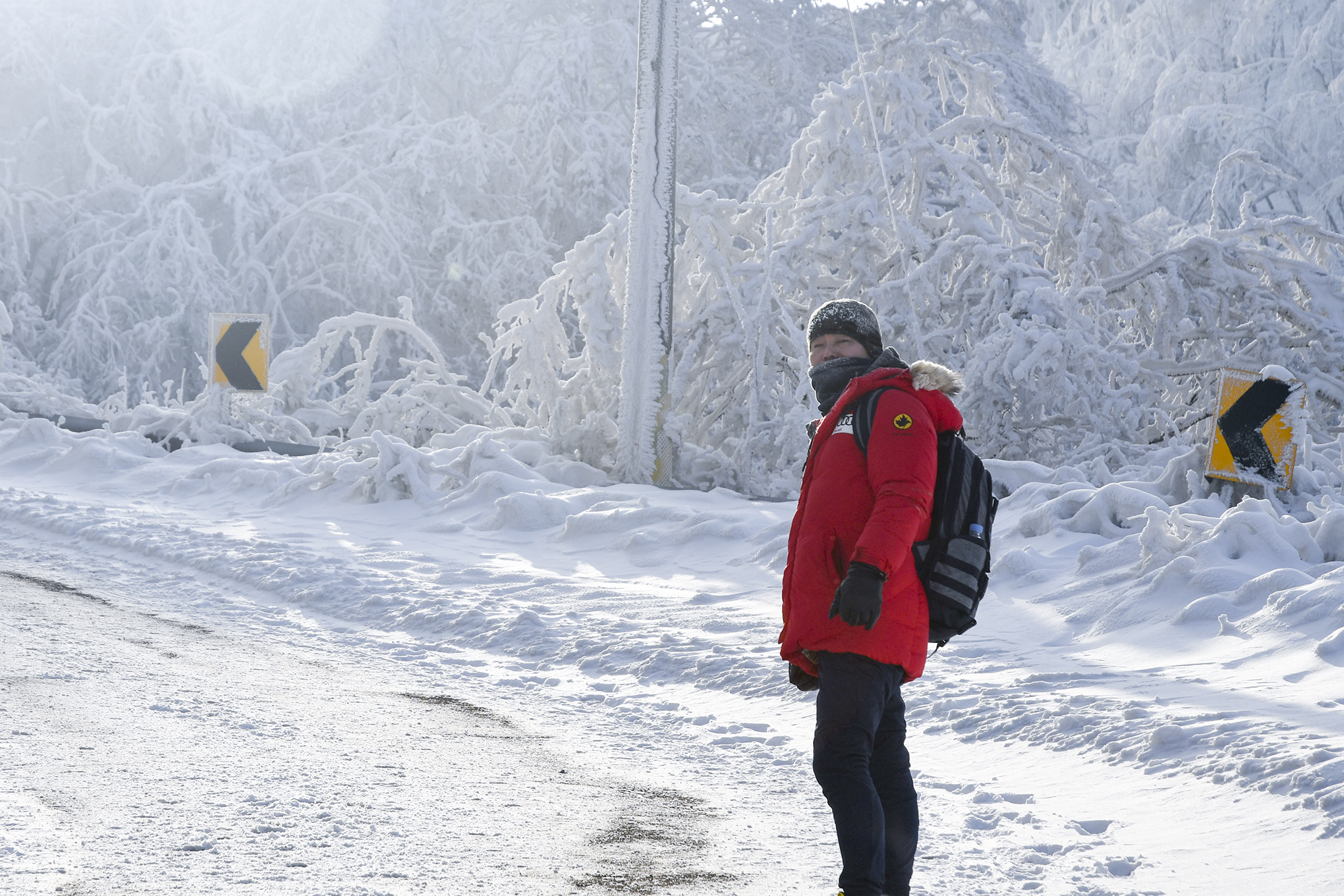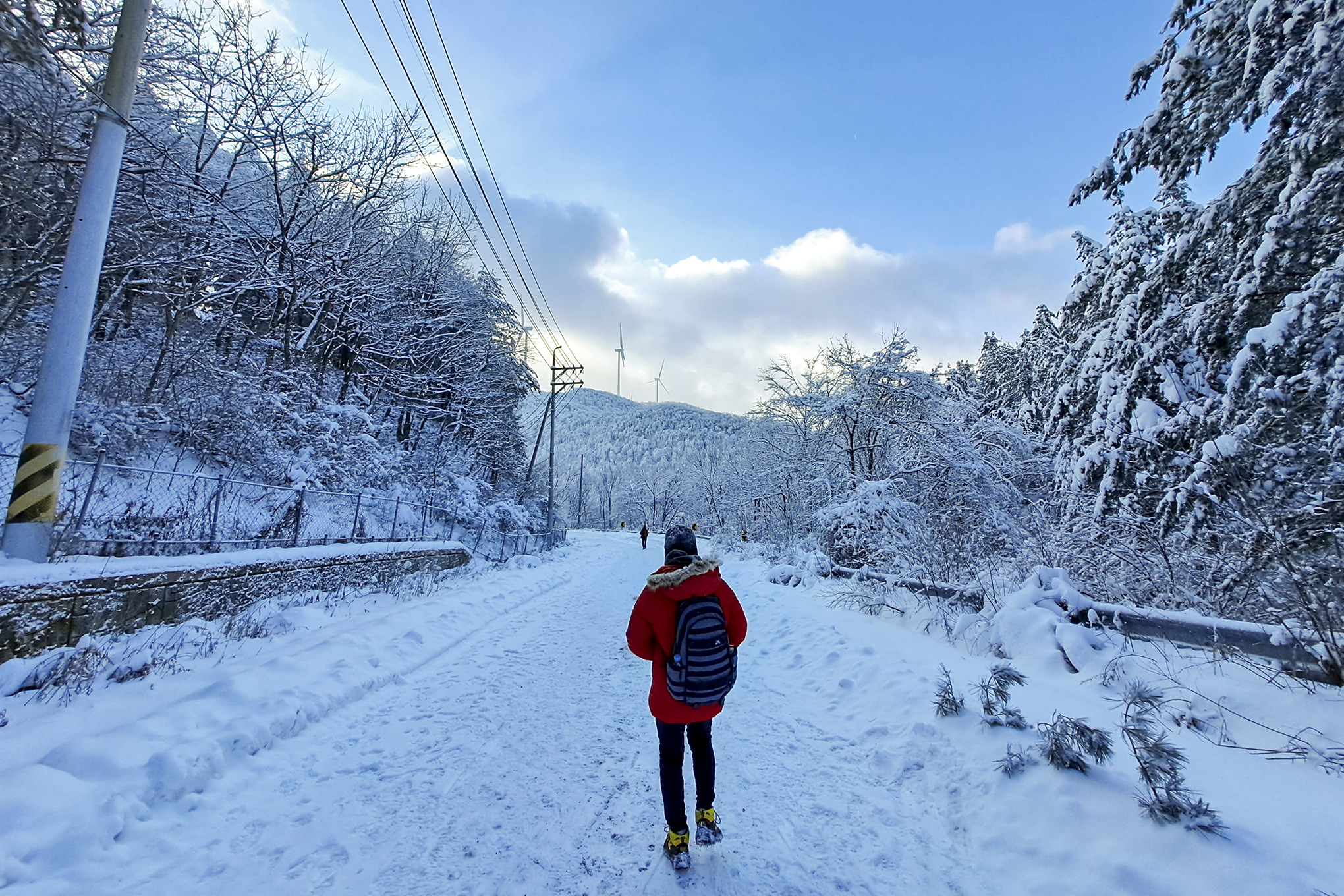 양구두미재가 가까워오지만 하얀 설경은 산 꼭대기나 이곳이나 여전히 변함이 없다.