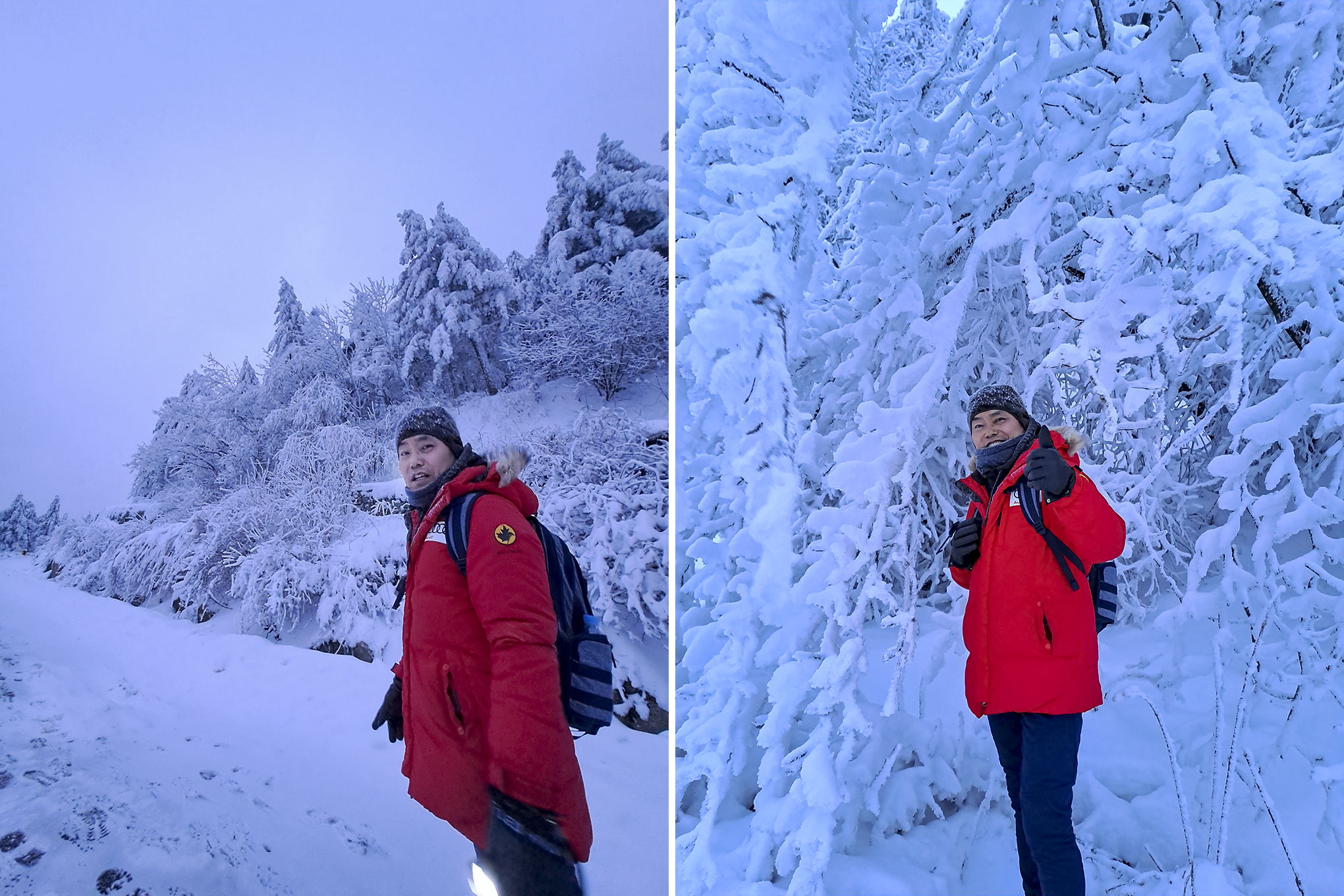 걸은지 1시간이 다 되어가는 시간, 어느새 날이 밝고 푸른 상고대가 장관을 이룬다.