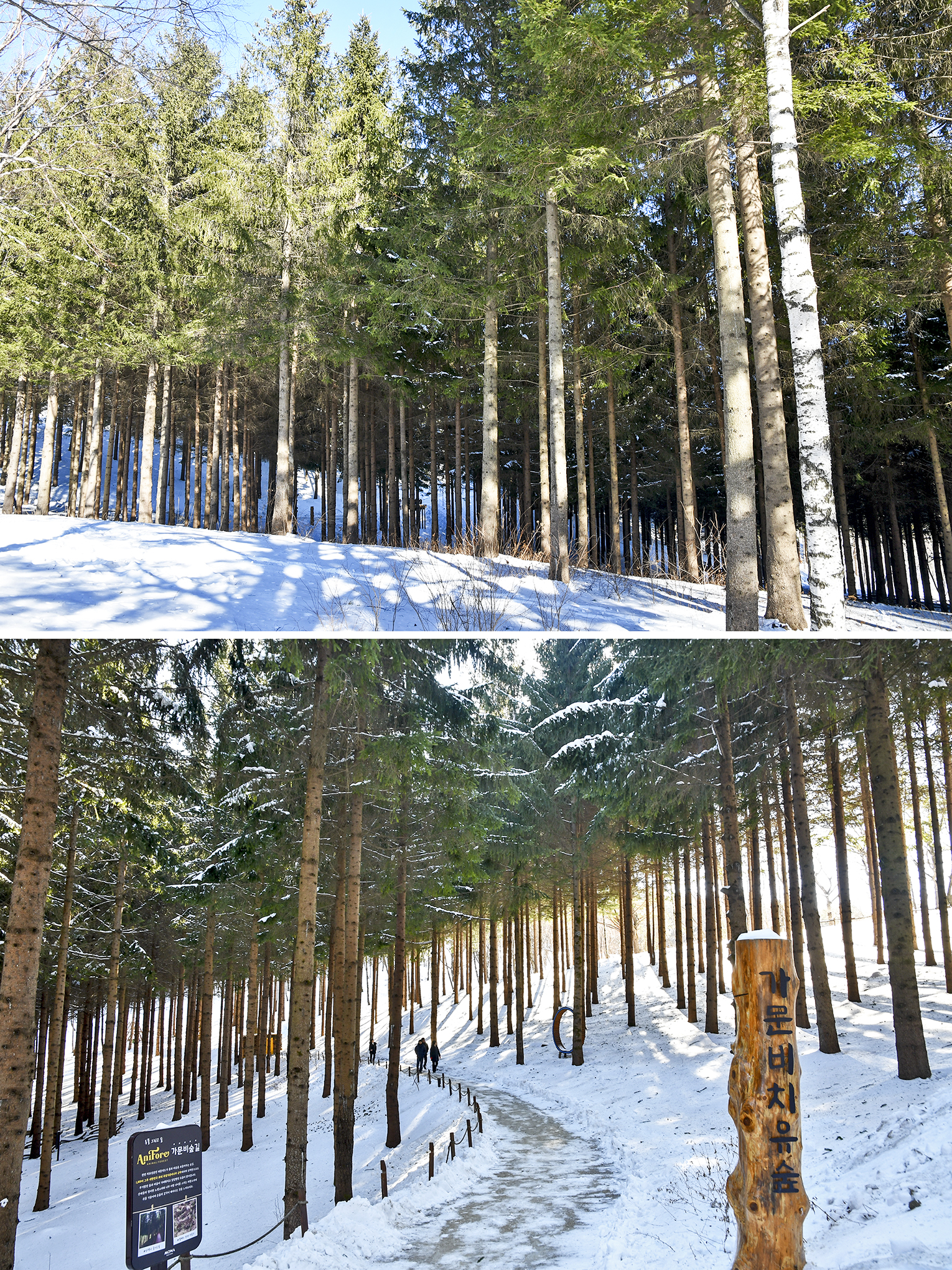 카페 옆에 화장실과 알파카 목장이 있는데 이곳까지 모노레일을 이용하면 쉽게 올라올 수 있다. 알파카목장은 입구에 매표소가 있지만 겨울이라 운영을 하지 않고, 가문비숲길은 걸어볼수 있다.