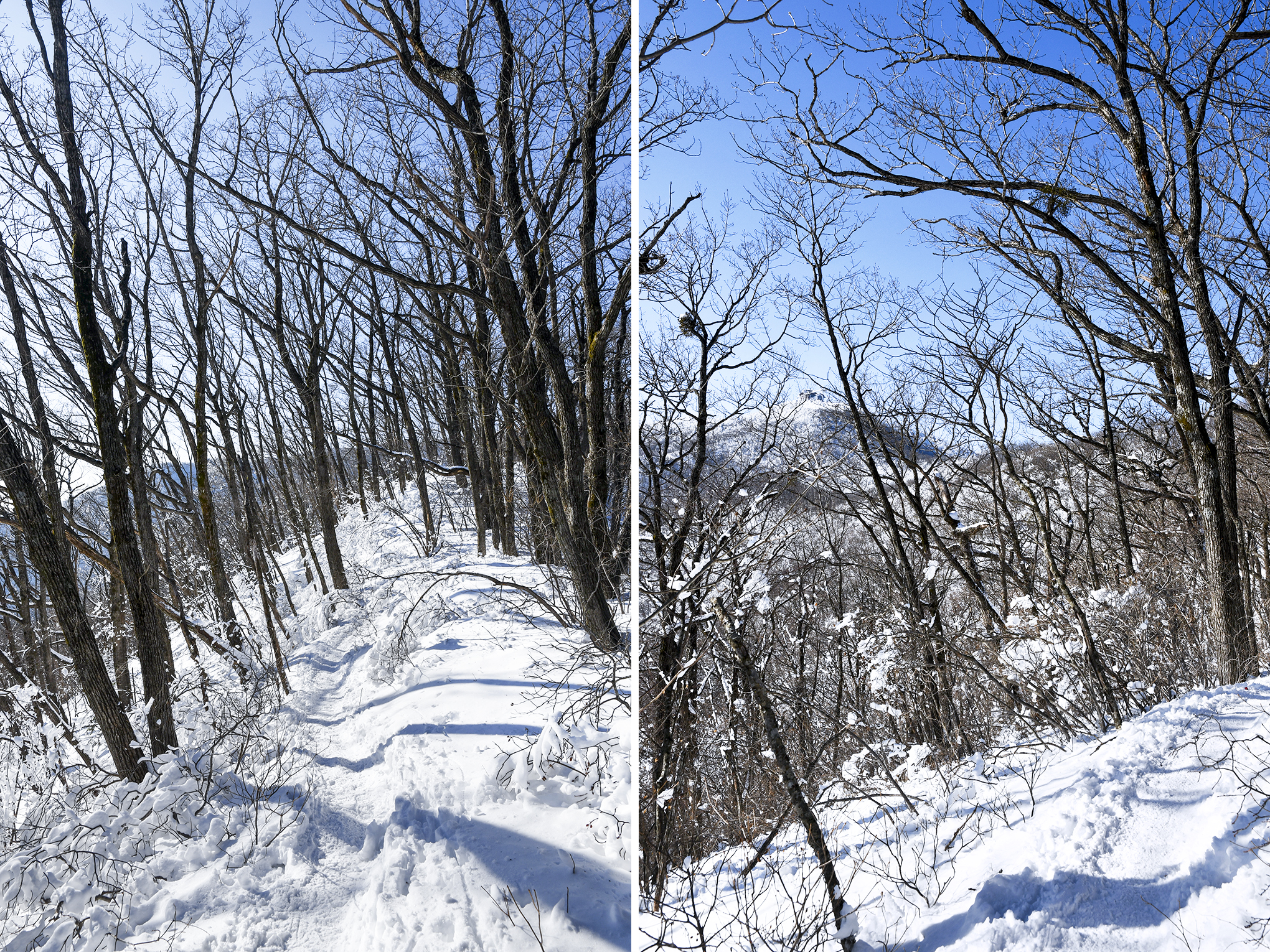 아이젠을 착용 했음에도 눈길은 미끄러웠고, 경사가 심해 한발 한발 내딛는 걸음이 무겁기만 하다.