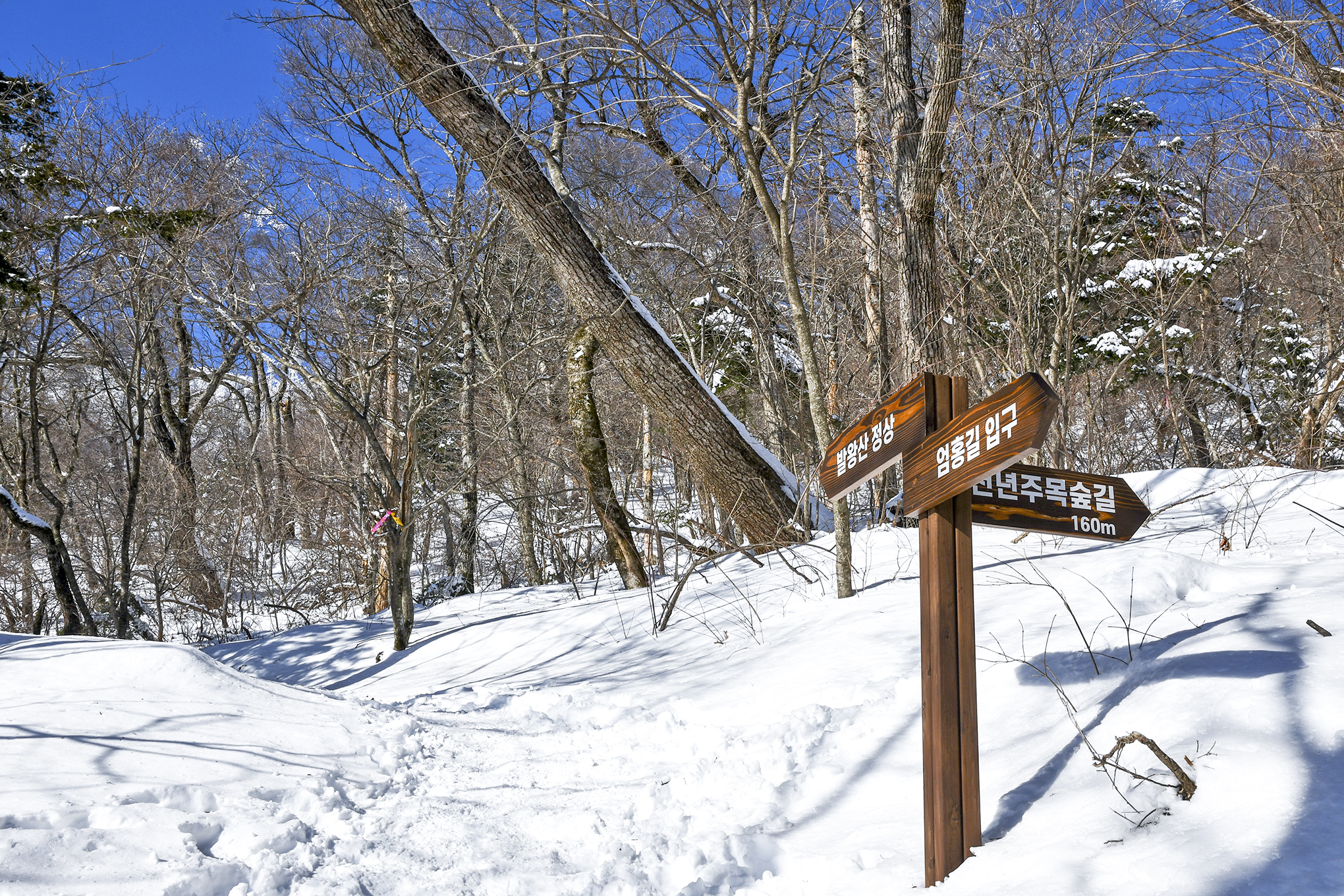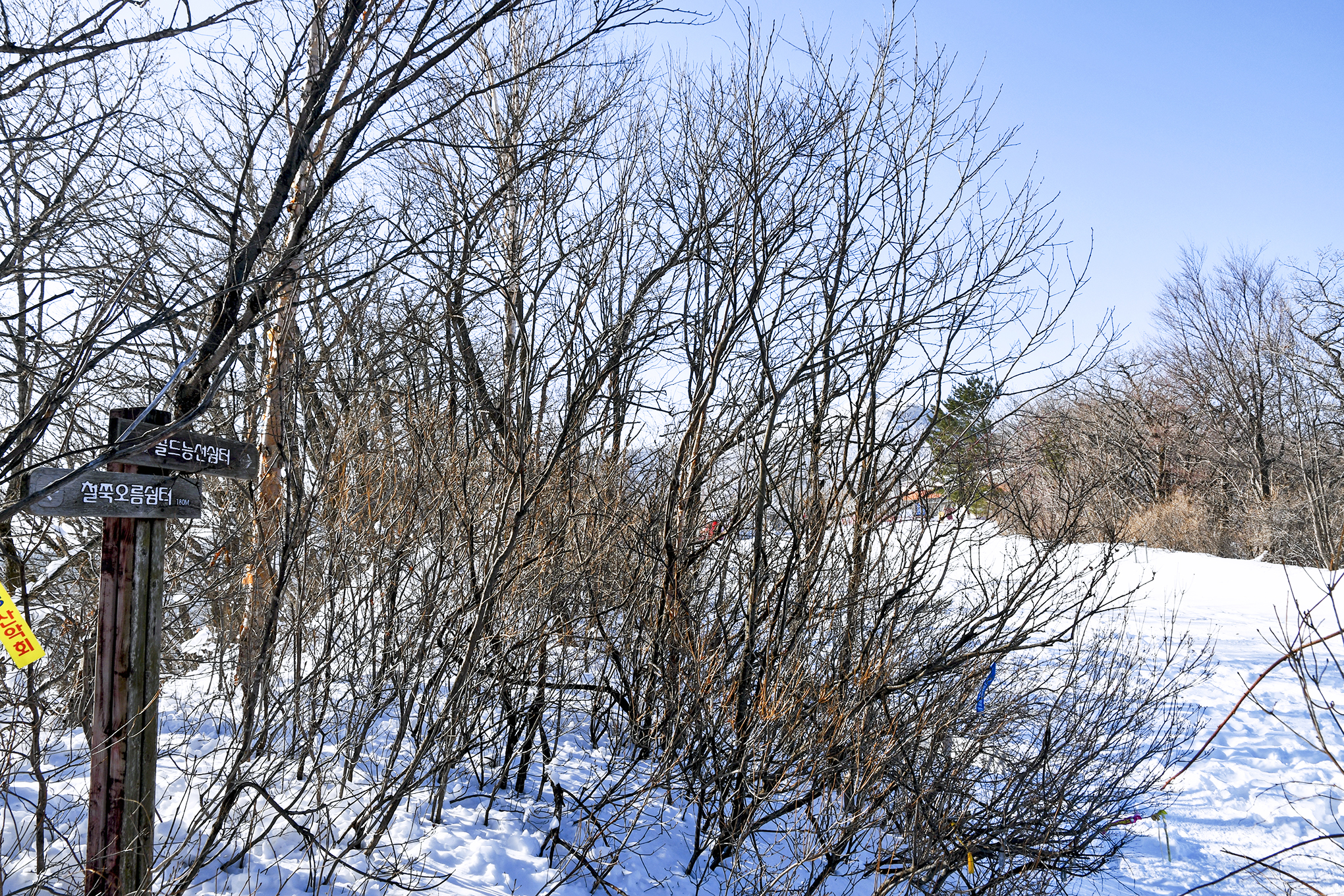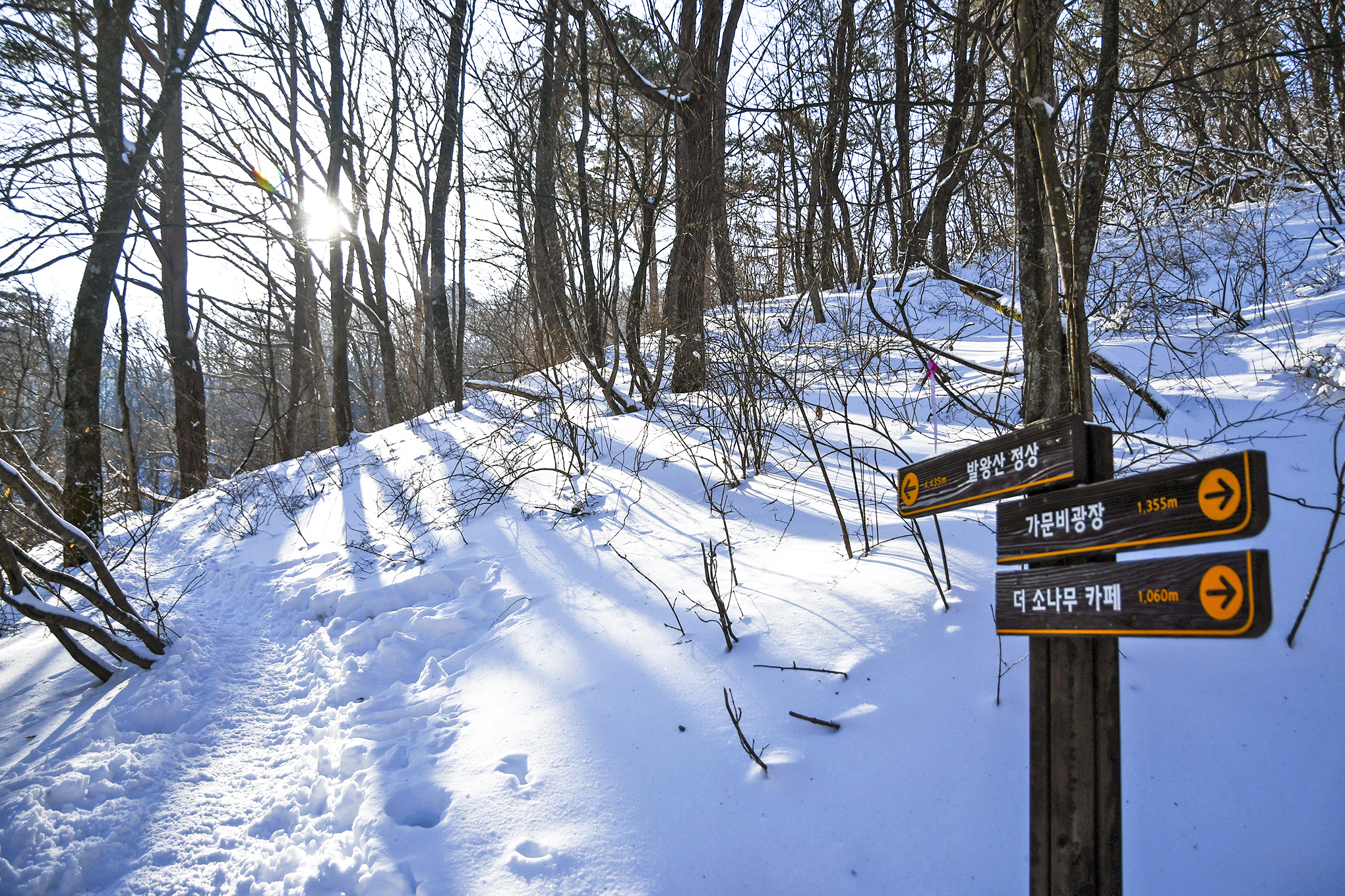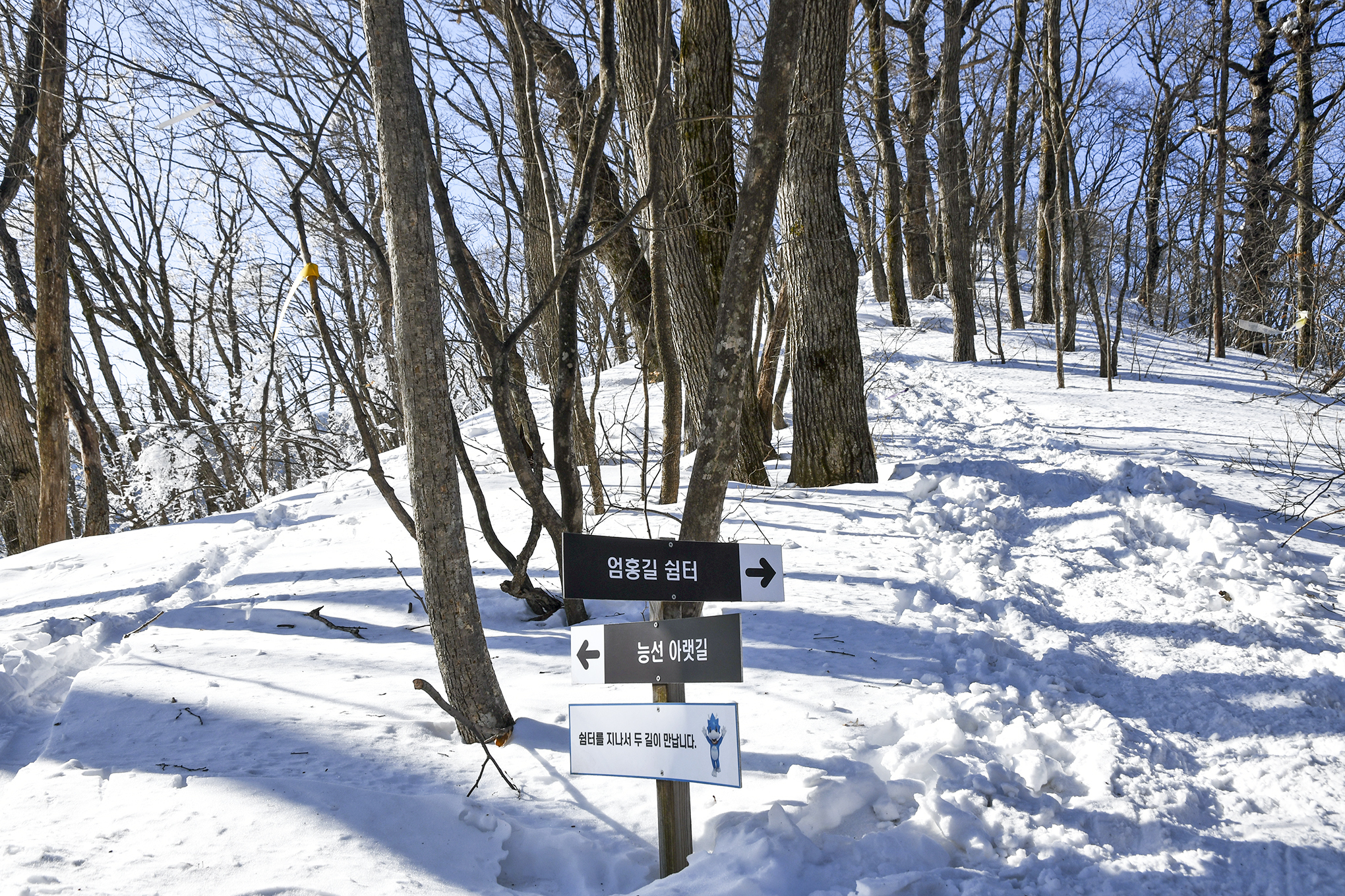눈바닥에 놓인 평창평화봉 이정표를 방금 지났다.