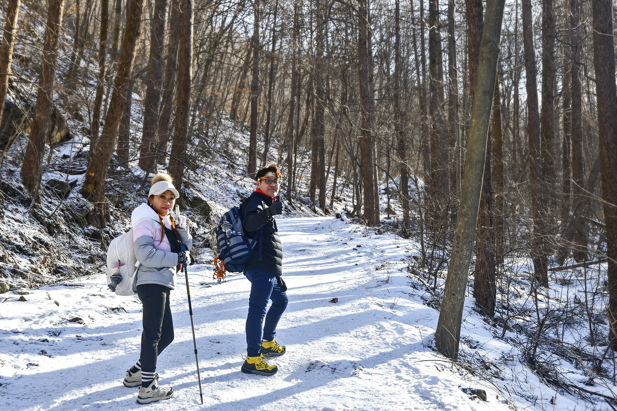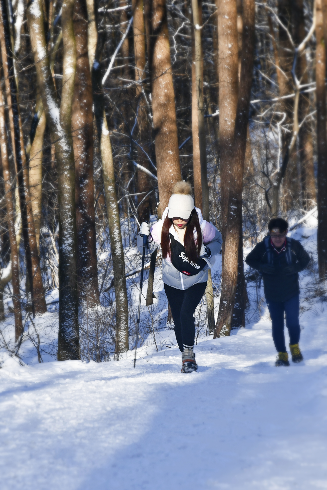 빙판길은 어느새 눈길로 바뀌고, 낙엽송 숲은 걷는 즐거움을 더해 준다.