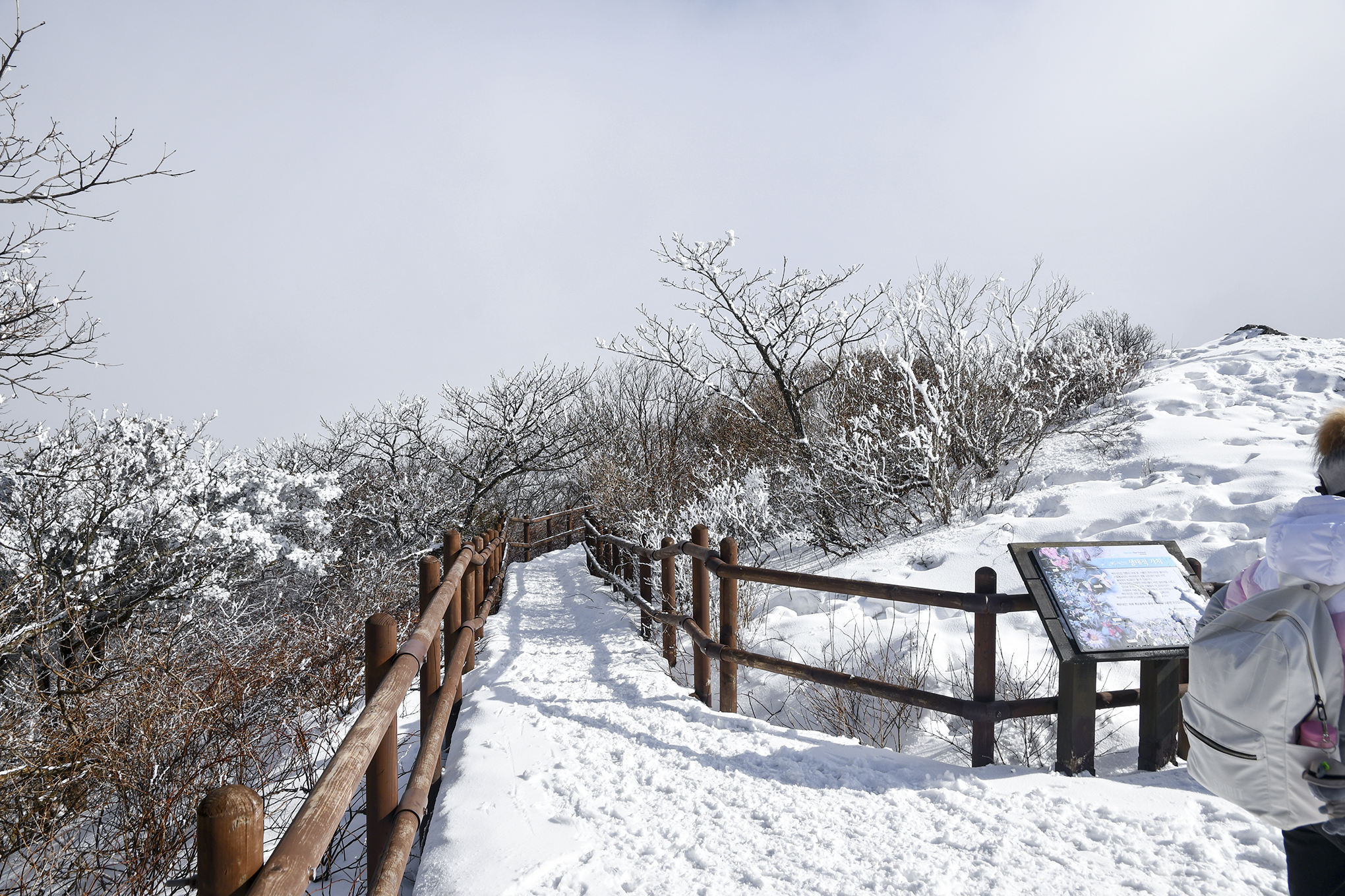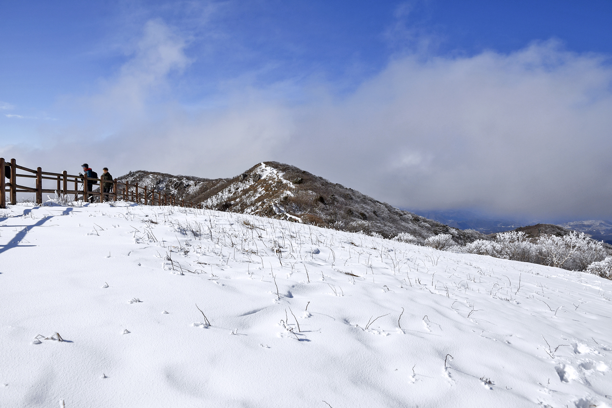 능선길 아래로는 철쭉 조망데크도 보이고, 하얀 설원이 펼쳐진다.
