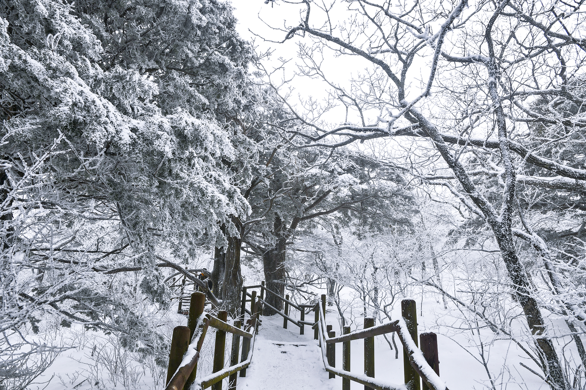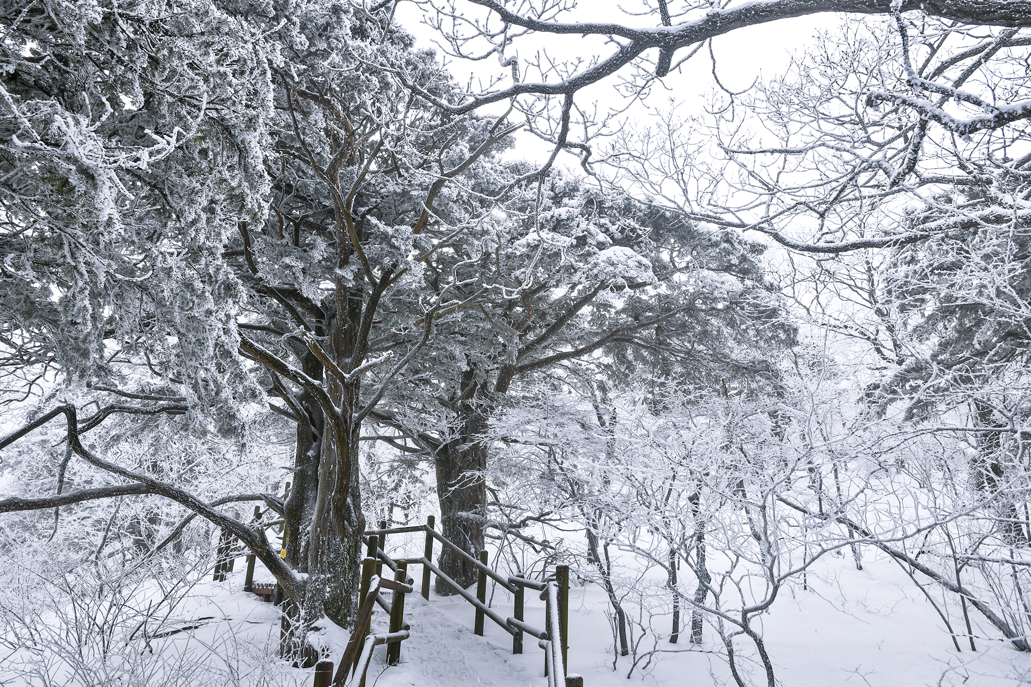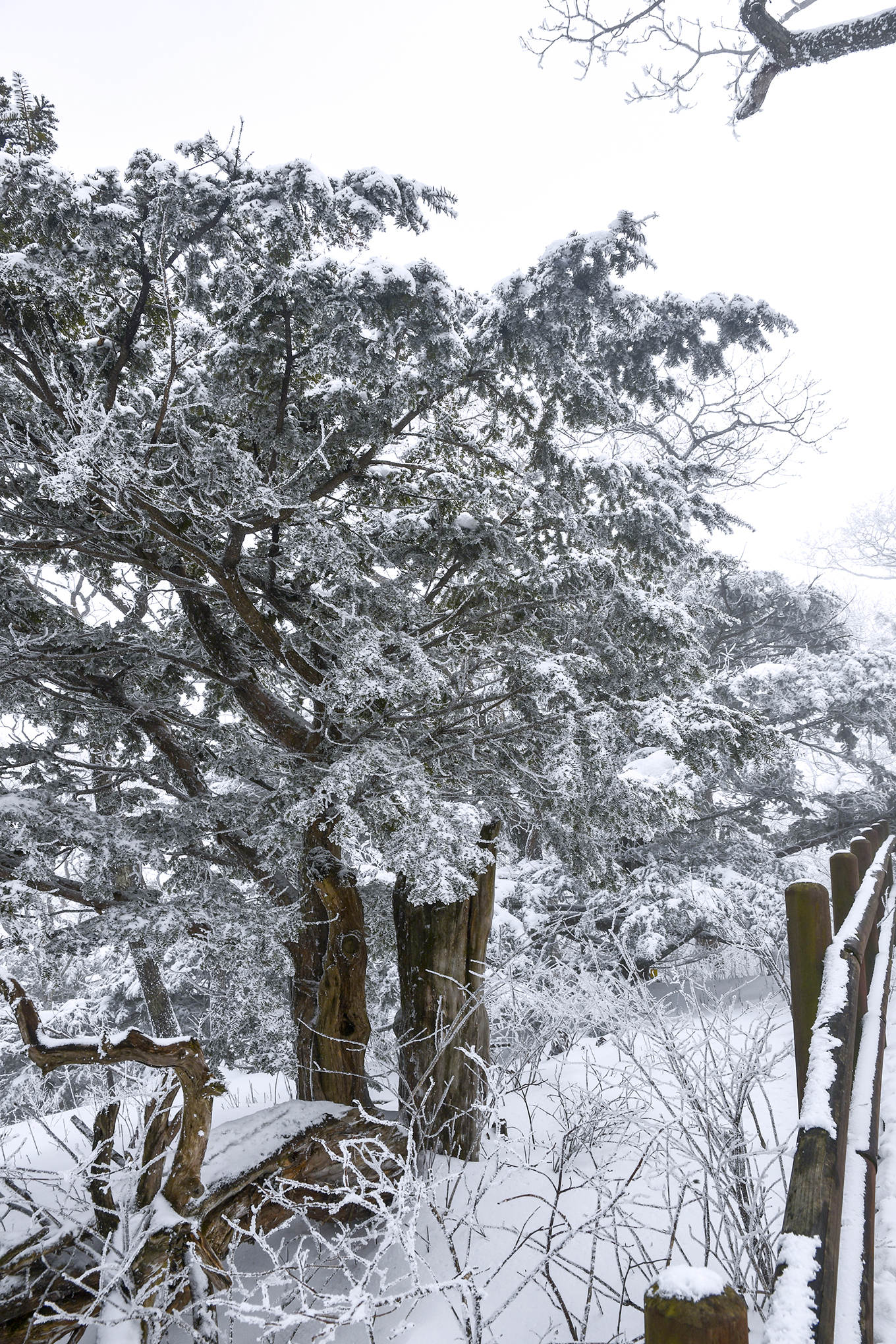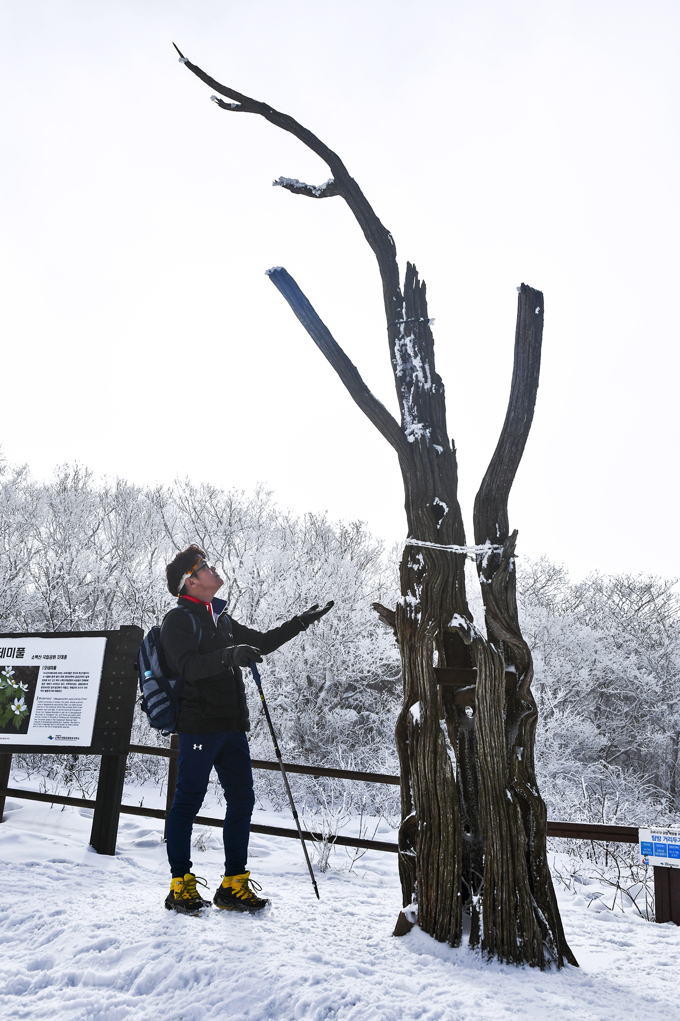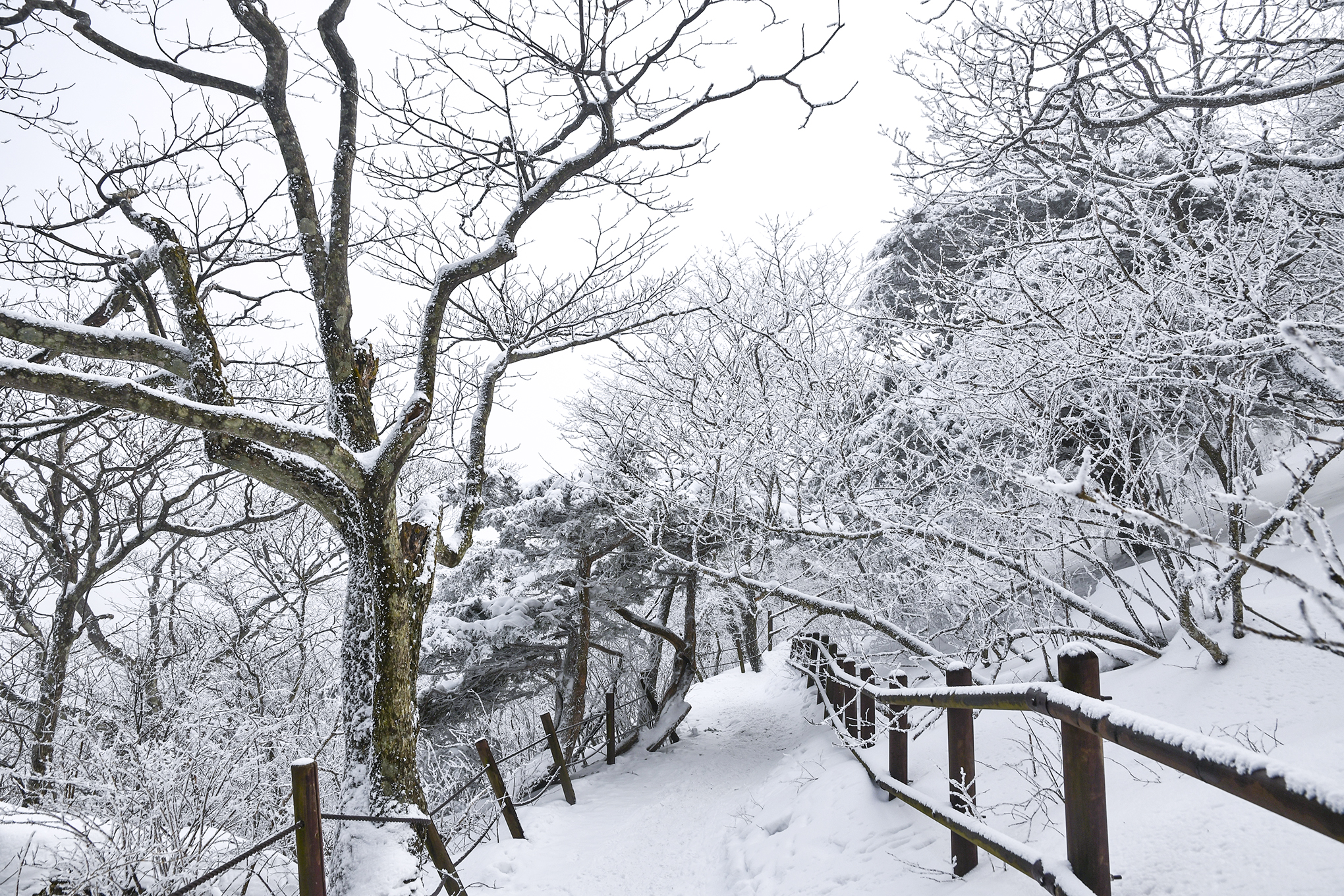 등산로 좌우로 500년 수령의 주목들이 아름드리 가지를 뻗은채 하얀 백발을 하고 있다.