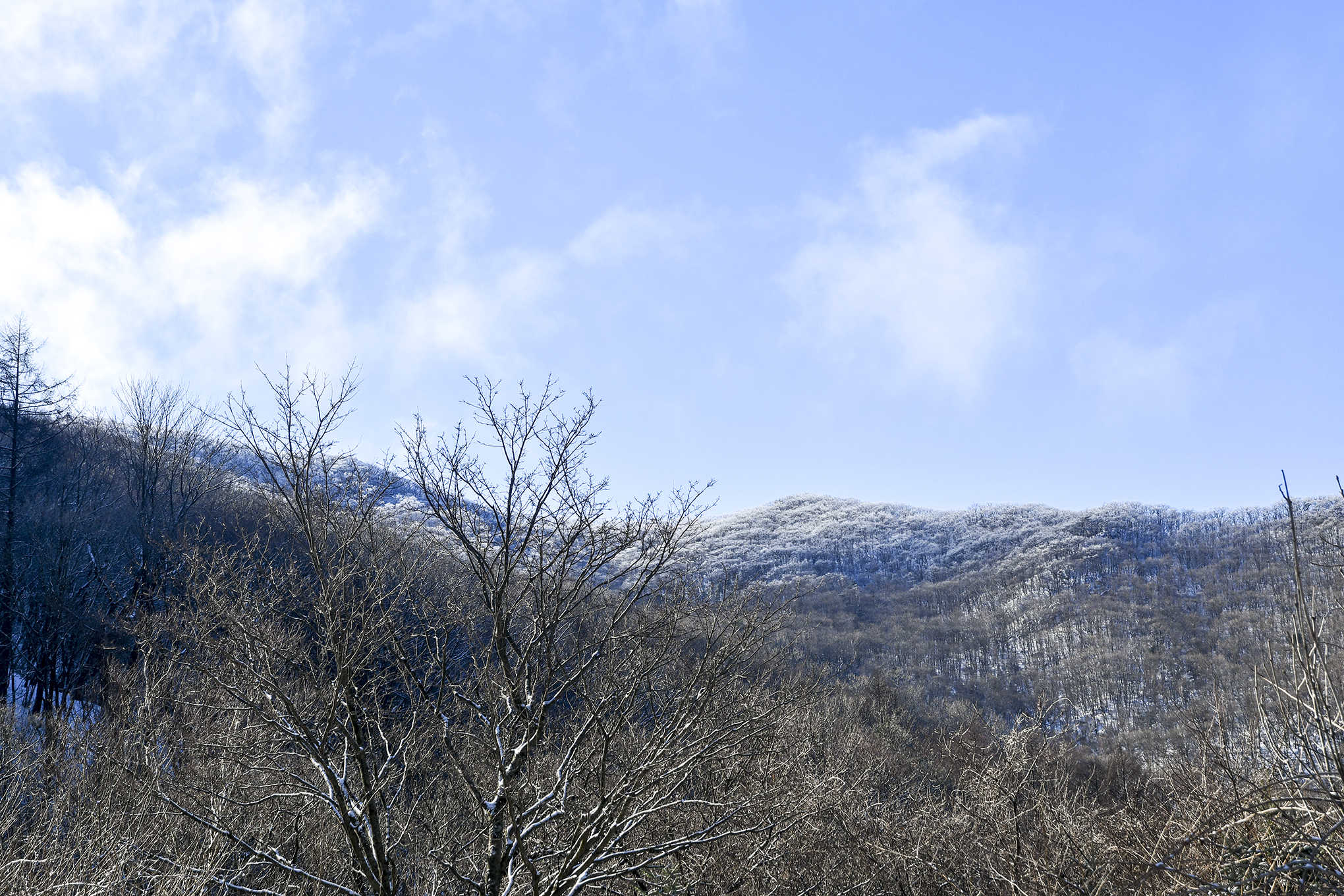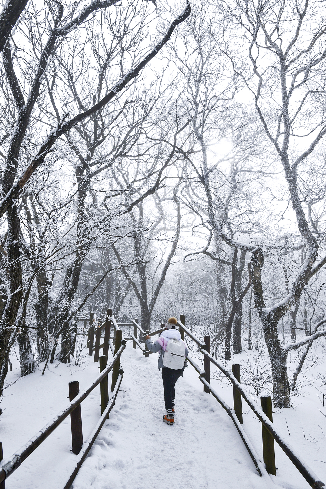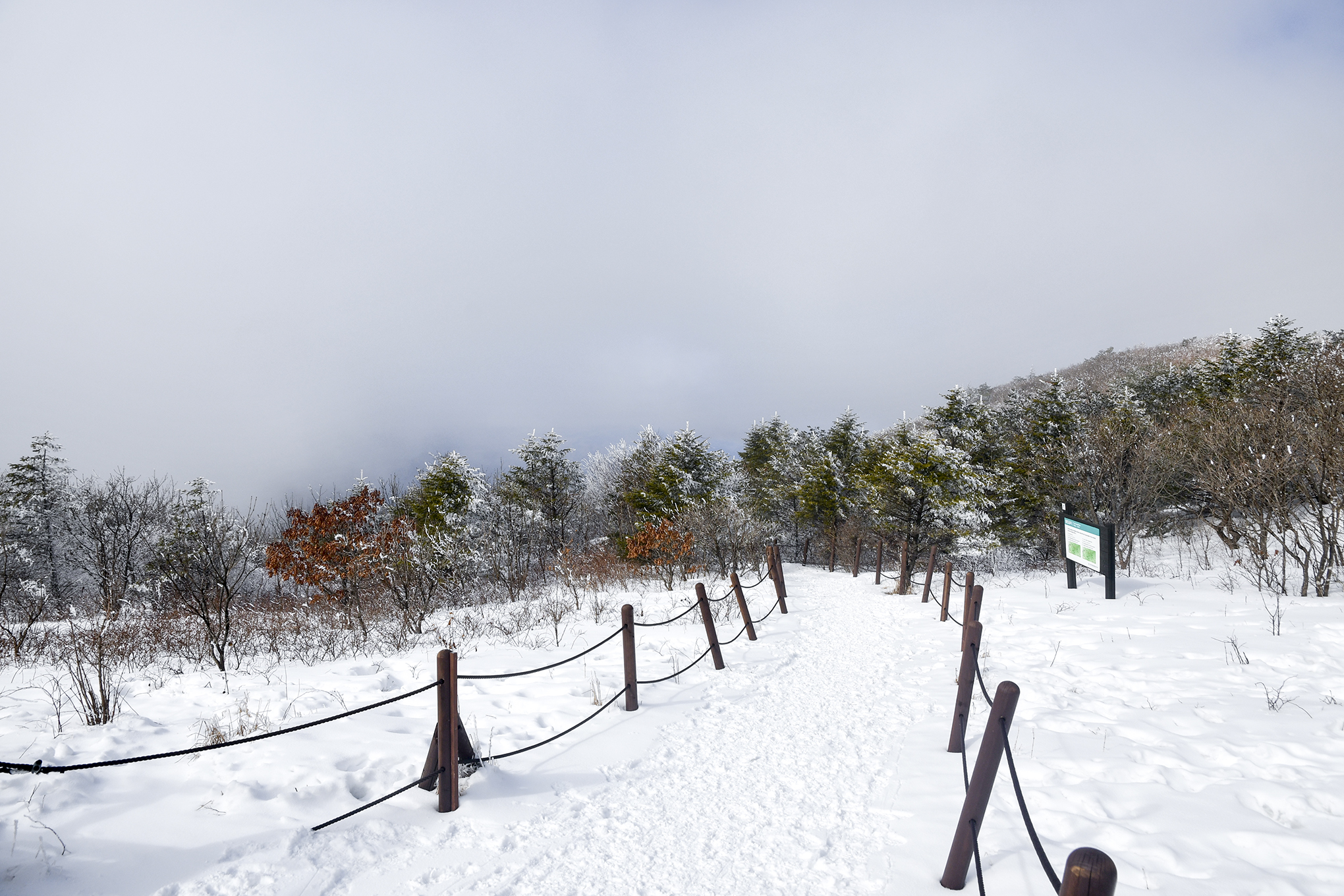 싸리눈이 내려 쌓인건지, 상고대가 피어나는건지 나무들은 희끗하게 변신중이다.