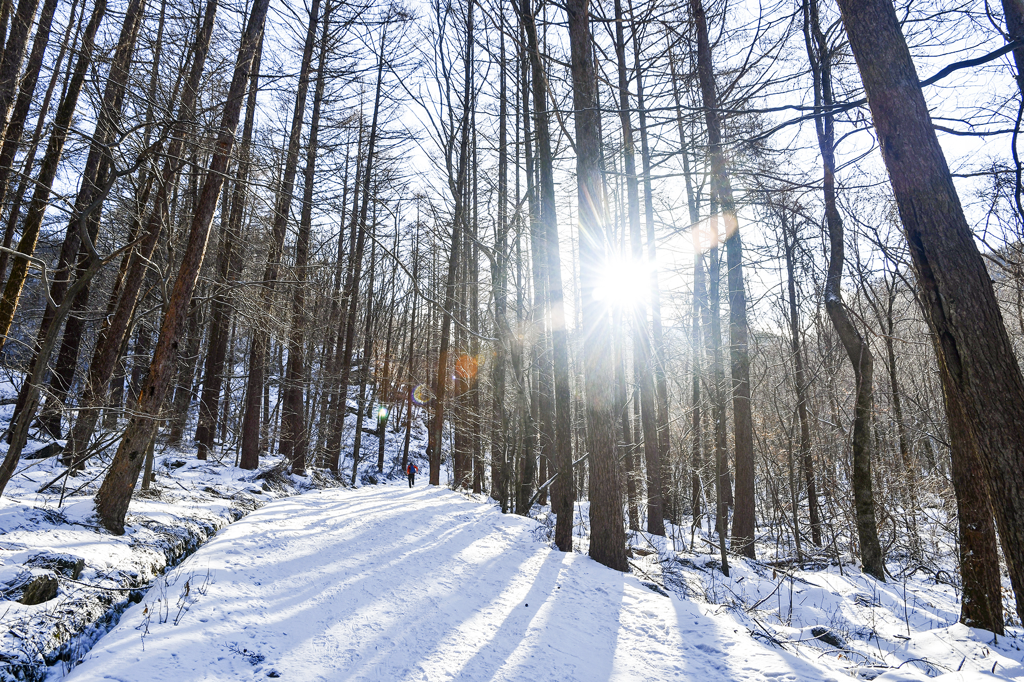 천동코스는 산 너머에서 해가 뜨기때문에 겨울에는 산그늘이 추위를 보태주는데, 이제야 해가 숲으로 들어오고 있다.
