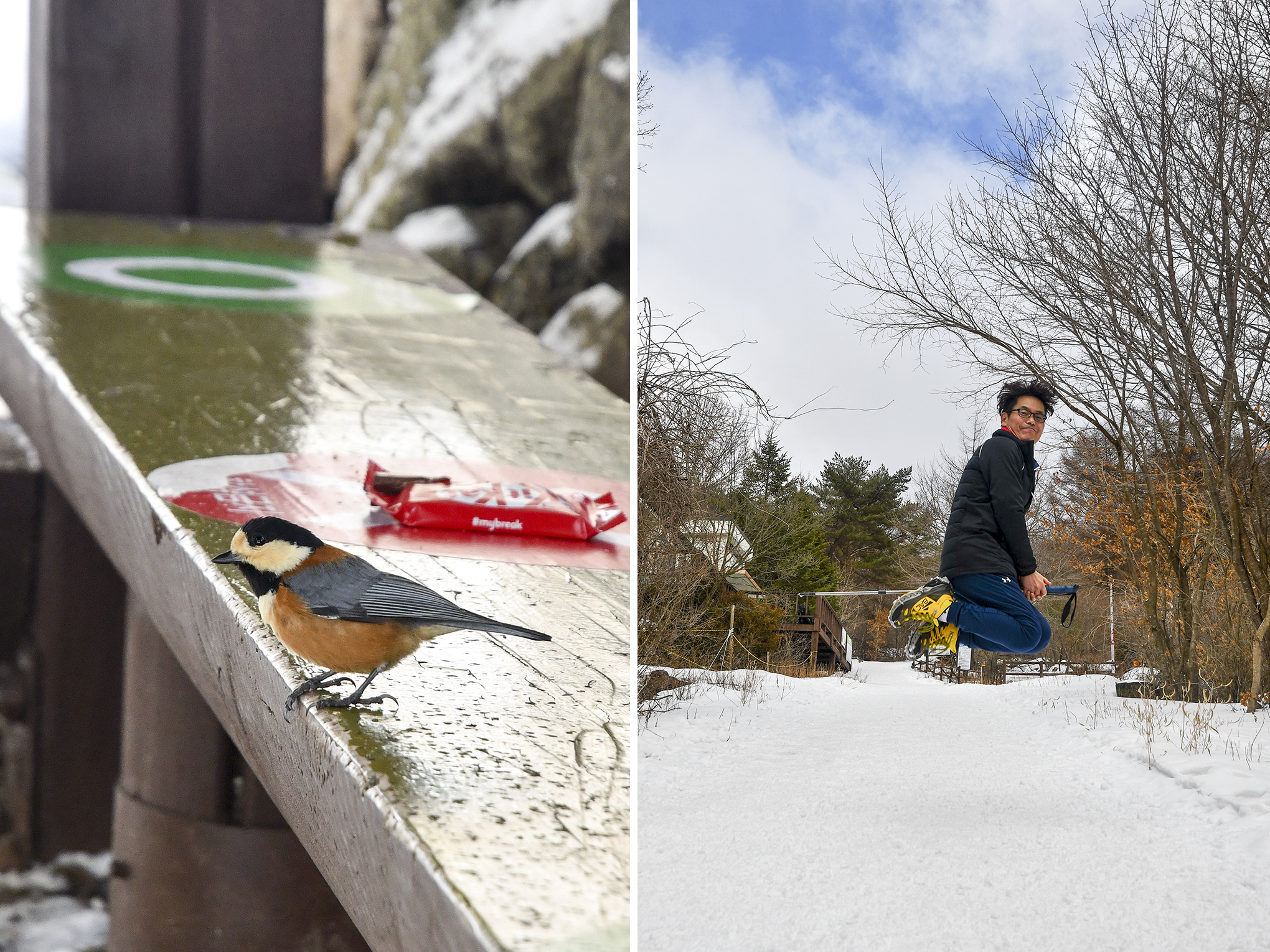 기다린듯 날아와 앉는 동박이는 곁을 맴돌고, 대장은 스틱 타고 빨리 내려가고 싶은 마음을 이렇게 표현했다.