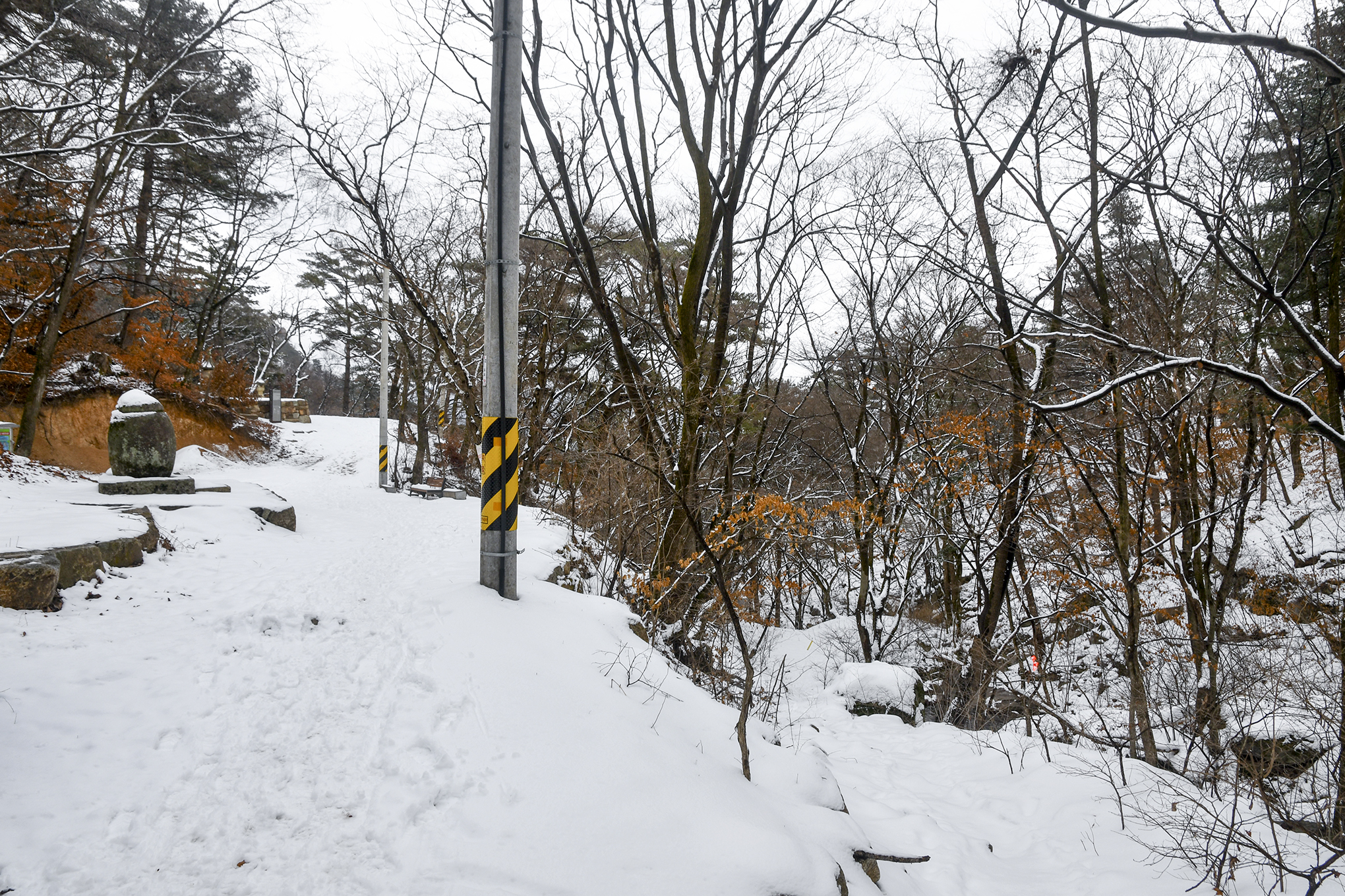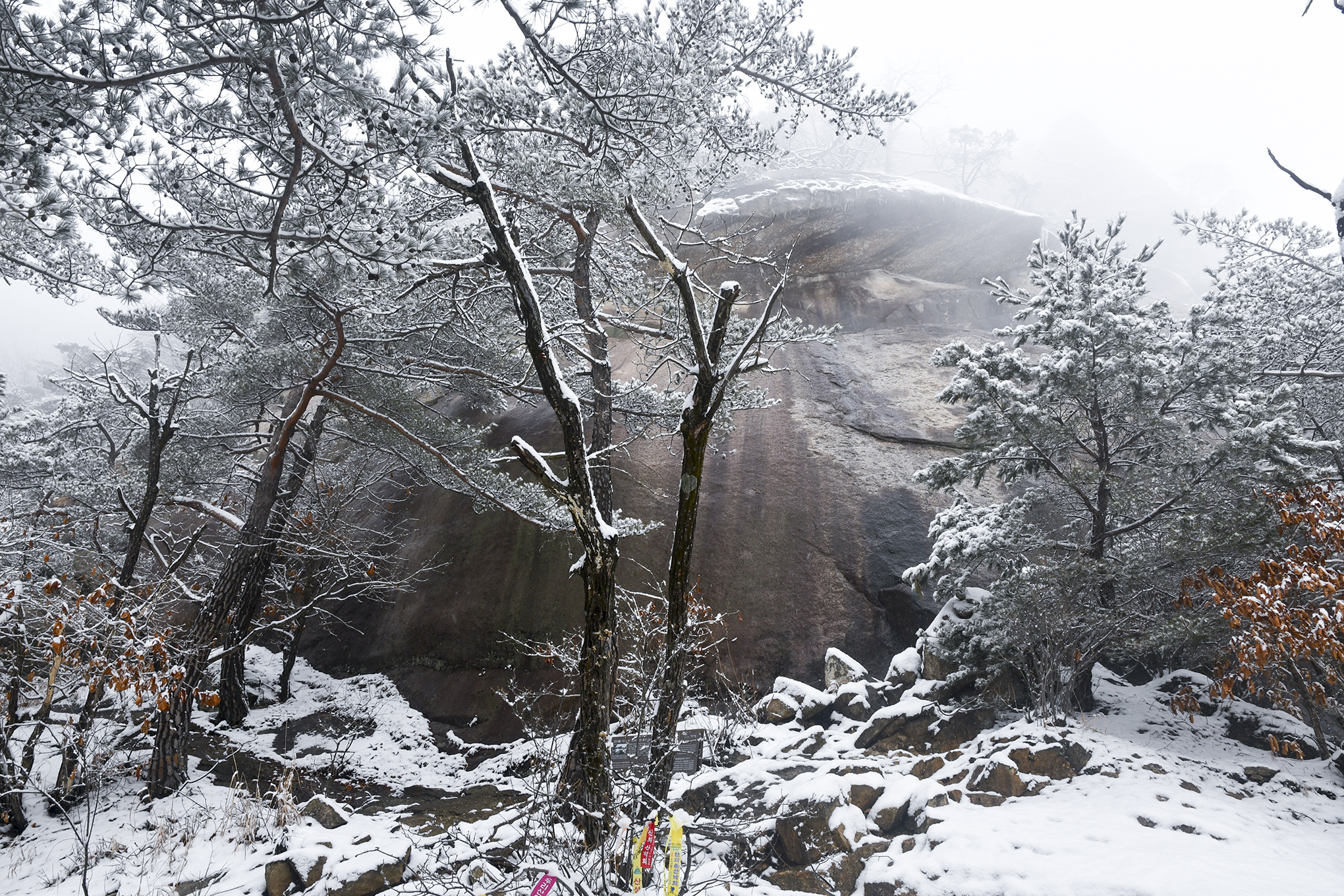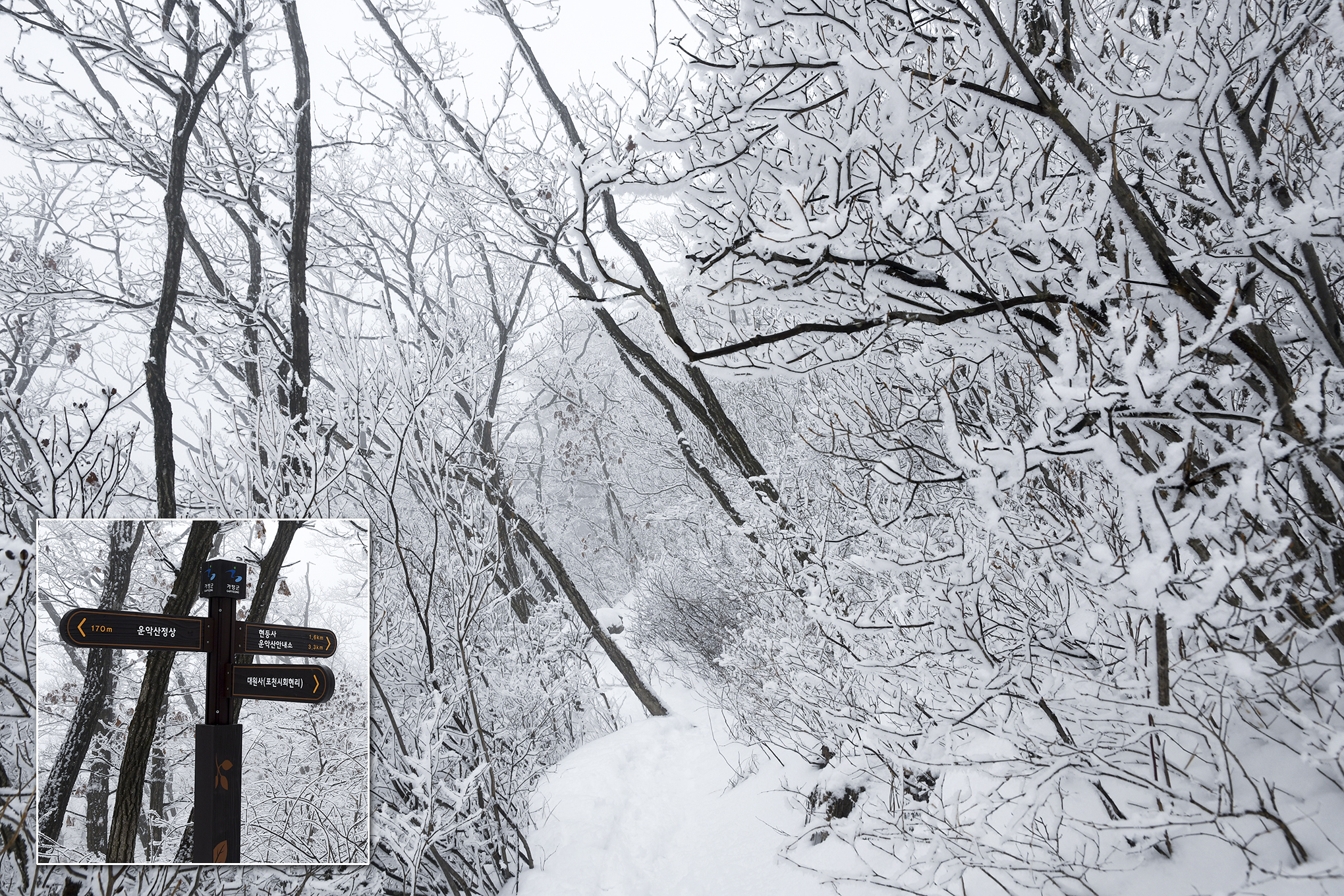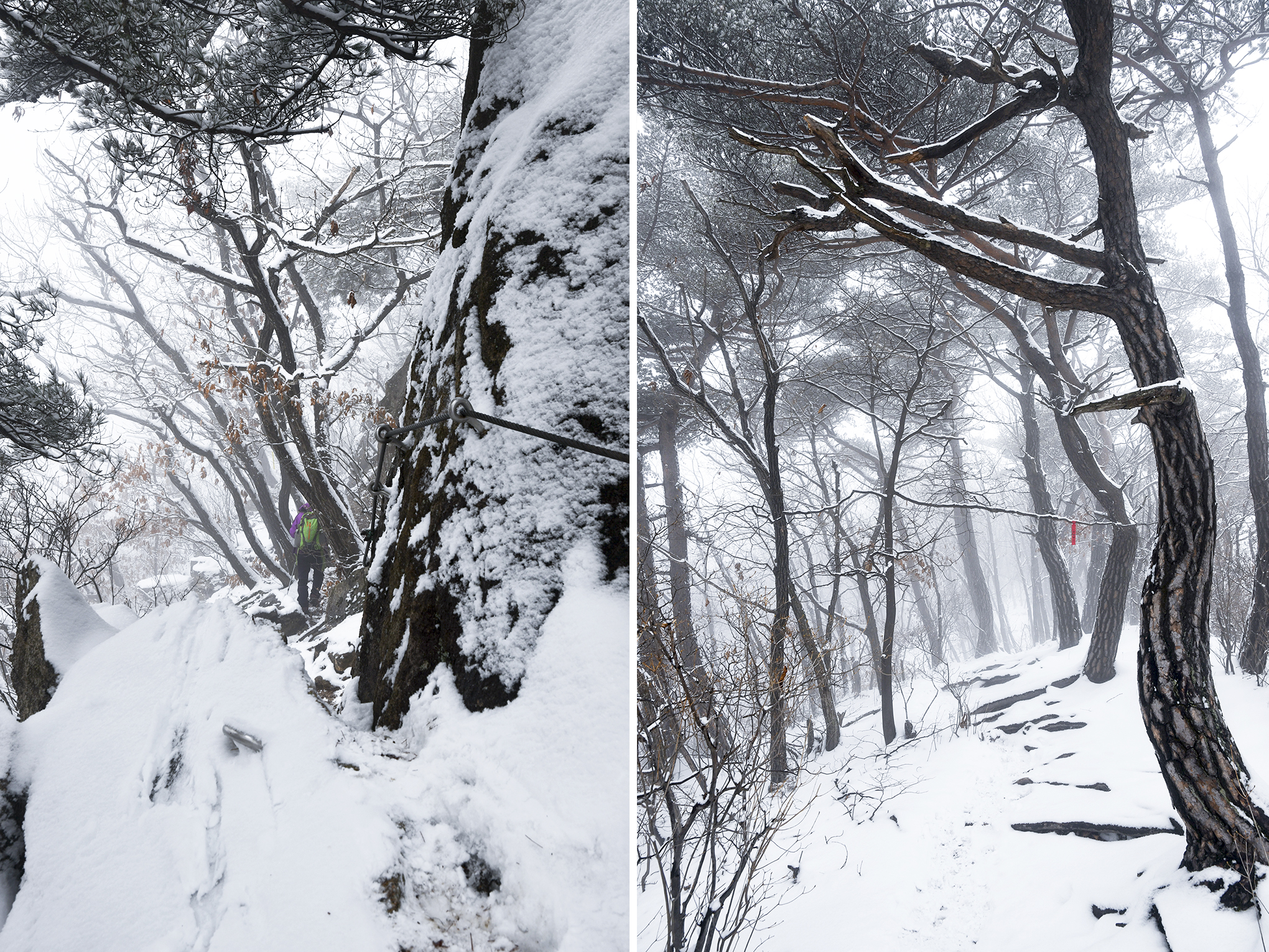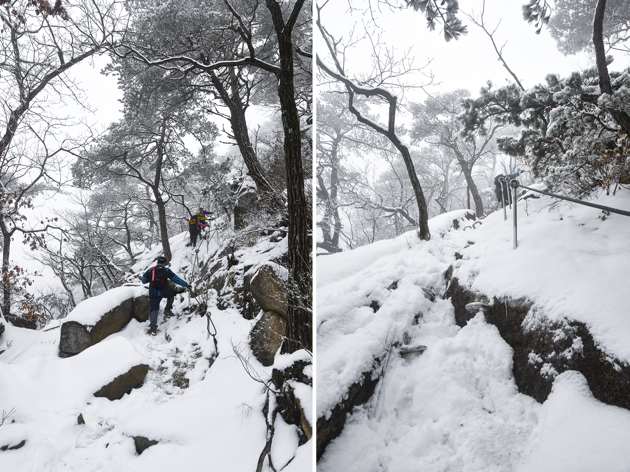 눈이 제법 많이 쌓여 푹푹 빠지는 구간도 있고, 아이젠 뒤꿈치에 눈이 뭉쳐 걷기가 불편해지기도 한다.