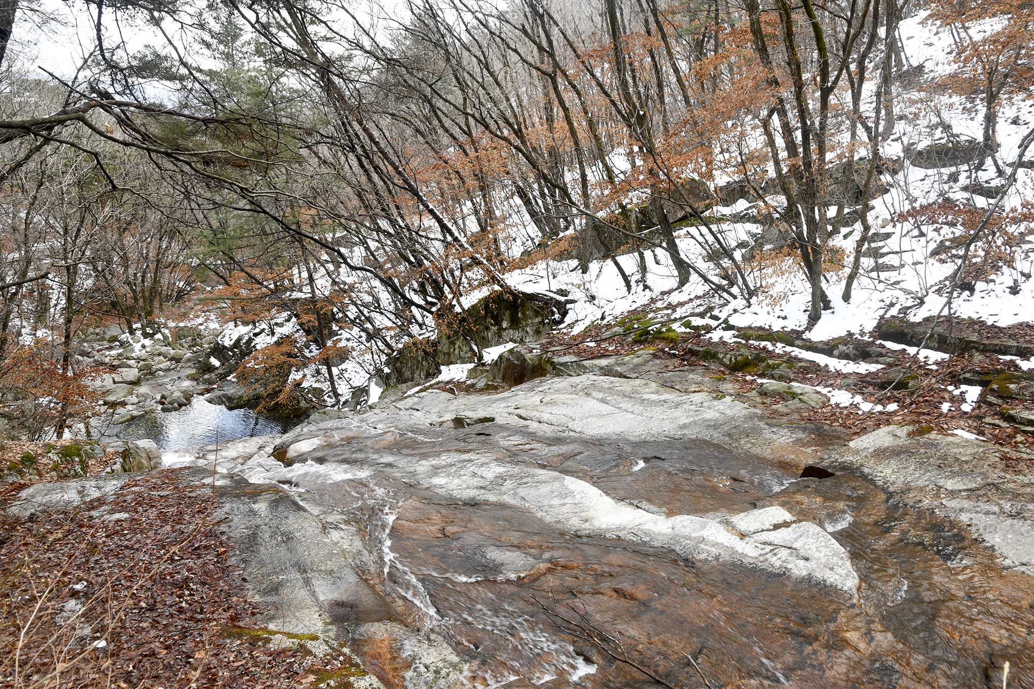 좌측 계곡에서 우렁찬 물소리가 걷는 내내 들려오지만 길에서는 나무들때문에 계곡 전망이 활짝 트이는 곳이 거의 없다.