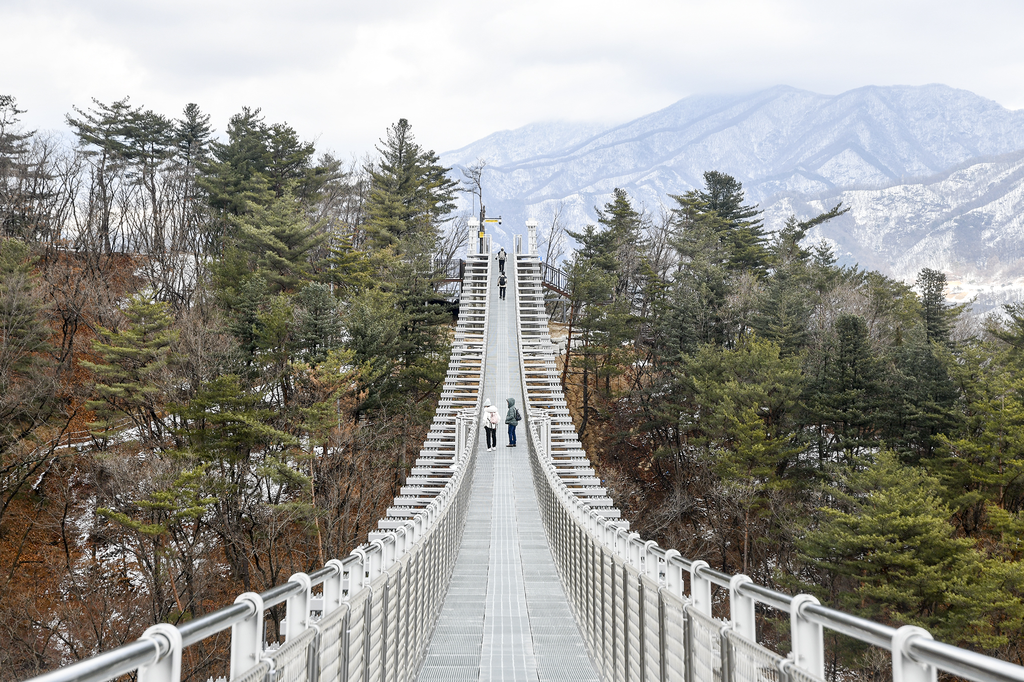 눈꽃이 만발했던 아침과는 또다른 풍경의 출렁다리, 다리에서 보니 산비탈을 따라 아침에 올라왔던 데크계단이 유난히 길고 가팔라 보인다.