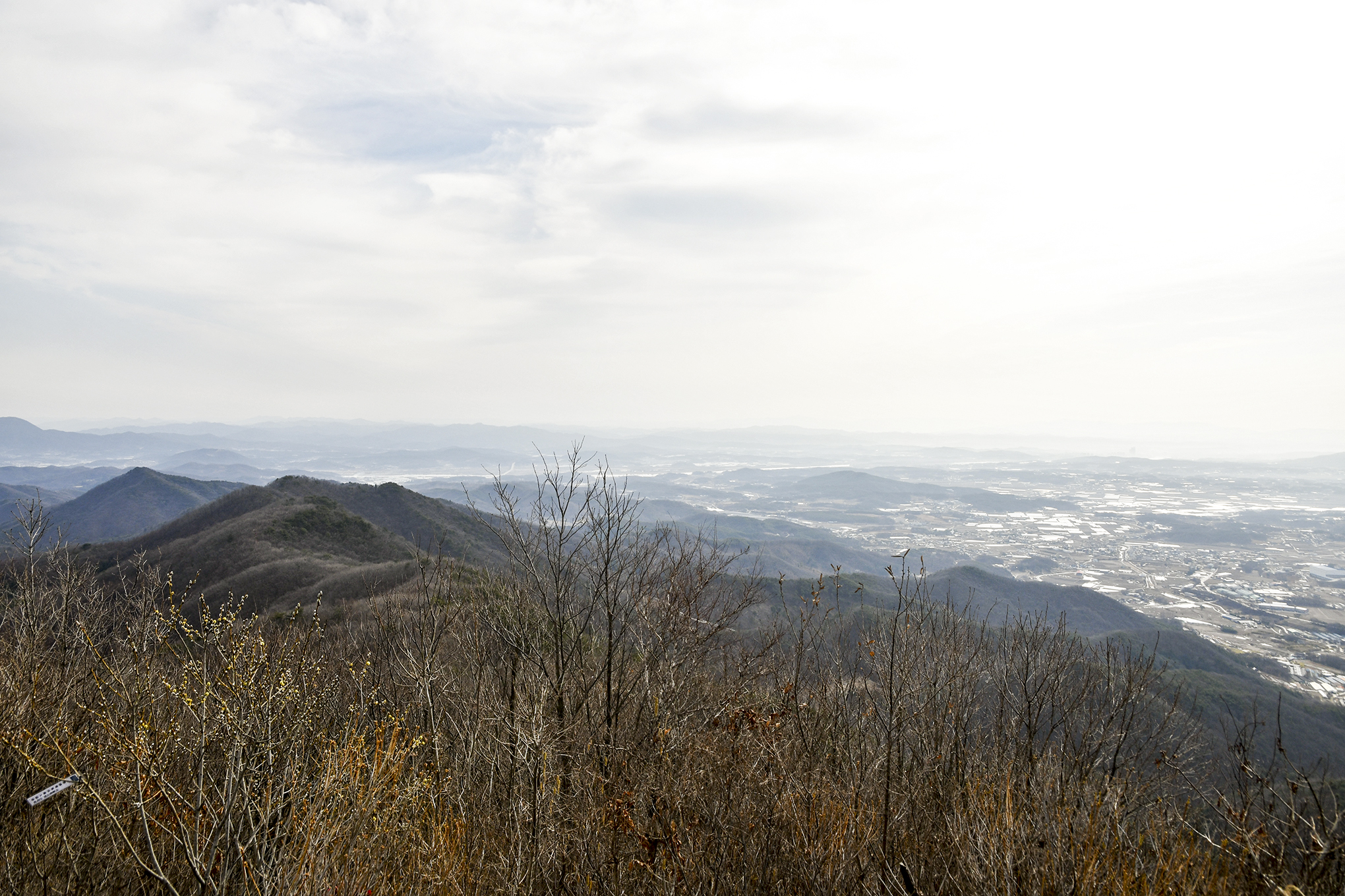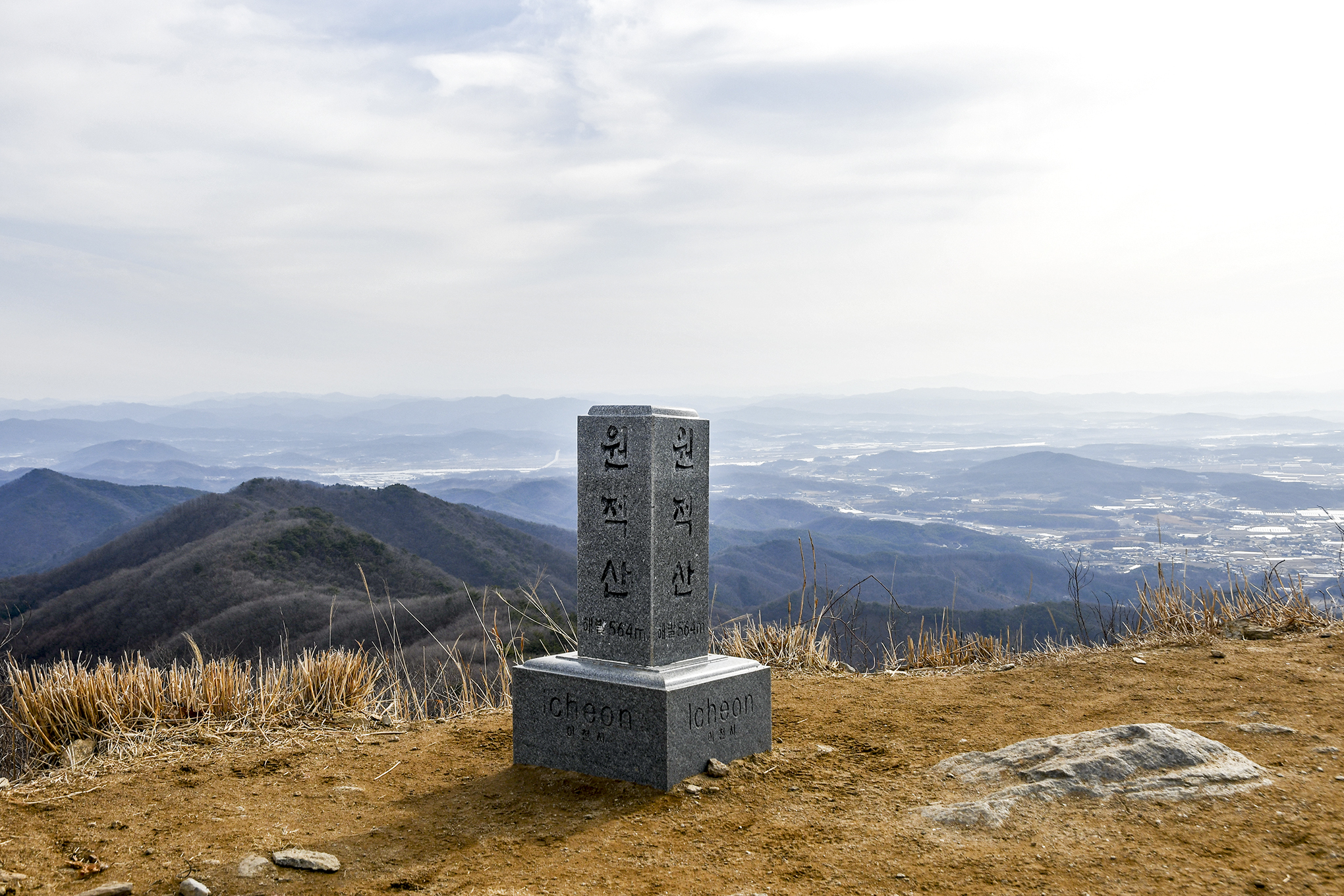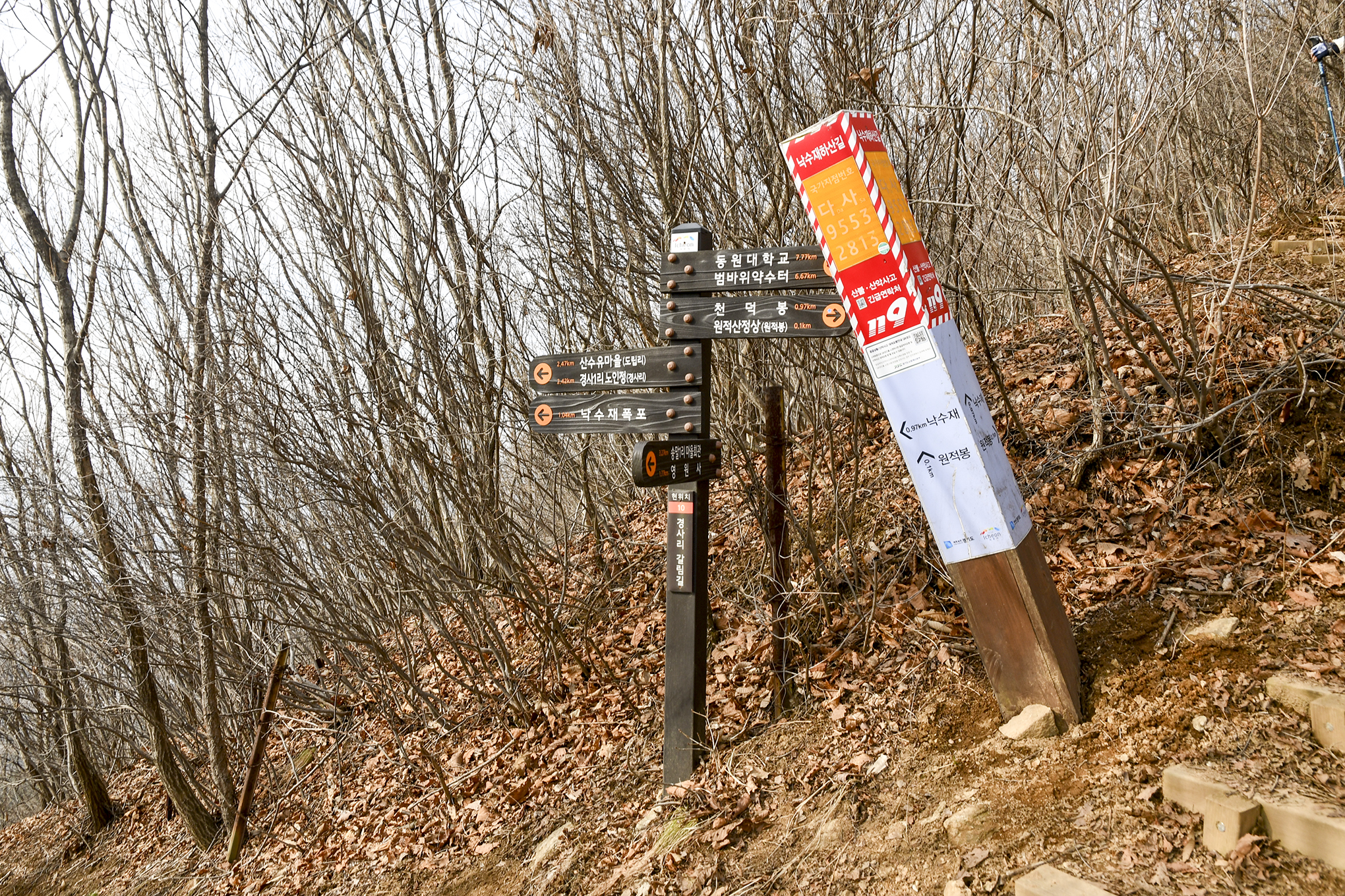 산 풍경이 가장 밋밋한 3월이지만 원적산 능선길에는 온통 진달래 나무가 가득해 꽃이 피는 계절에는 산행할 맛이 날것 같다. 불발탄 경고판이 세워진 쉼터에서 잠시 목을 축이고,
