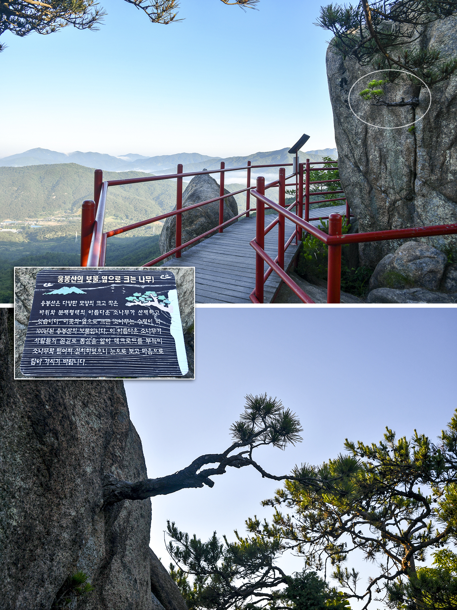 용봉산의 보물인 옆으로 크는 나무는 수령이 약 100년된 소나무로 그동안 사람들의 손길로 몸살을 앓아 부득이 데크로드를 소나무와 떨어져 설치하였다고 한다.