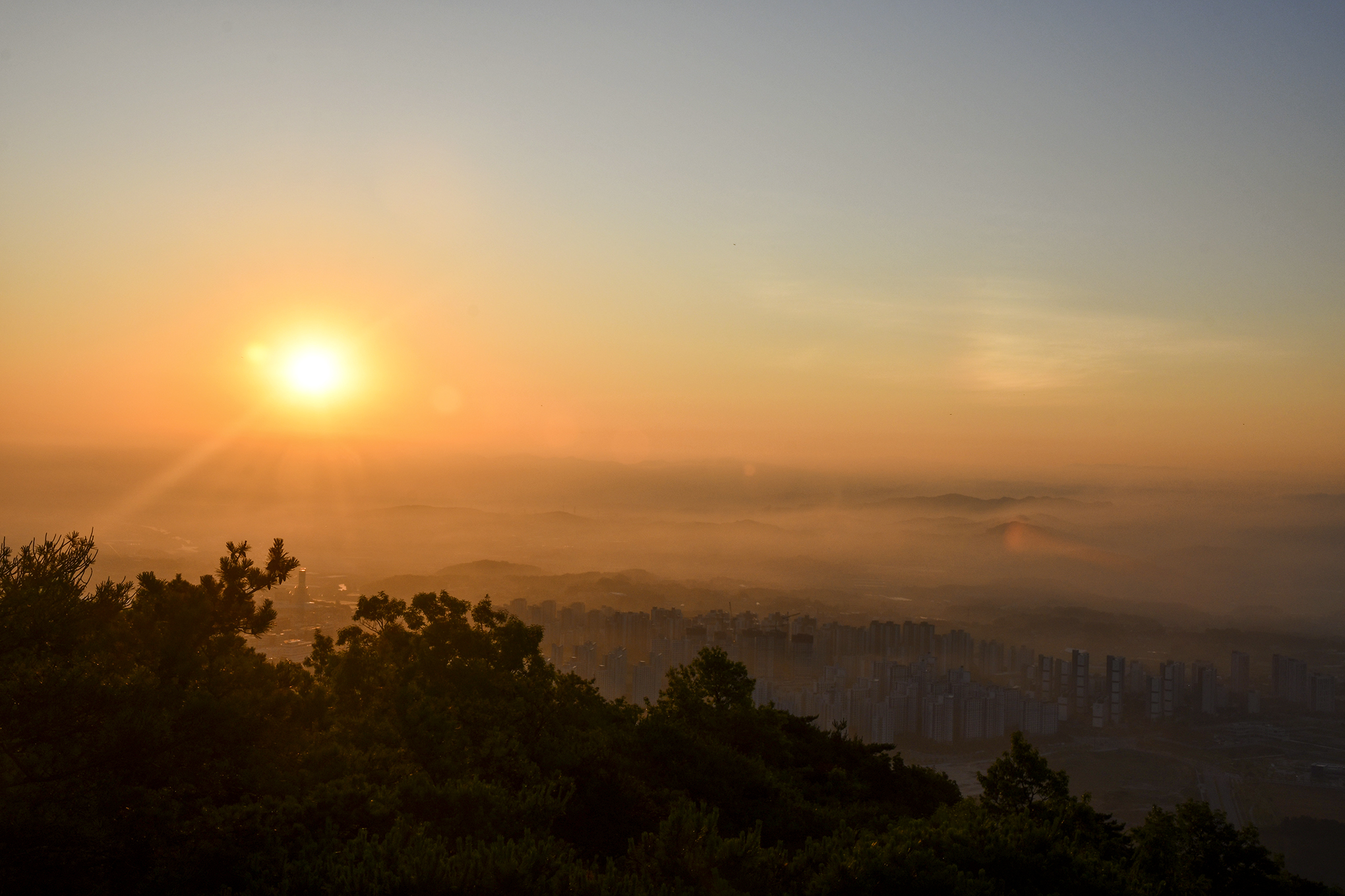 빠르게 솟아오른 태양 아래 드러난 내포신도시와 낮은 산 봉우리들이 운무에 잠겨 있다.