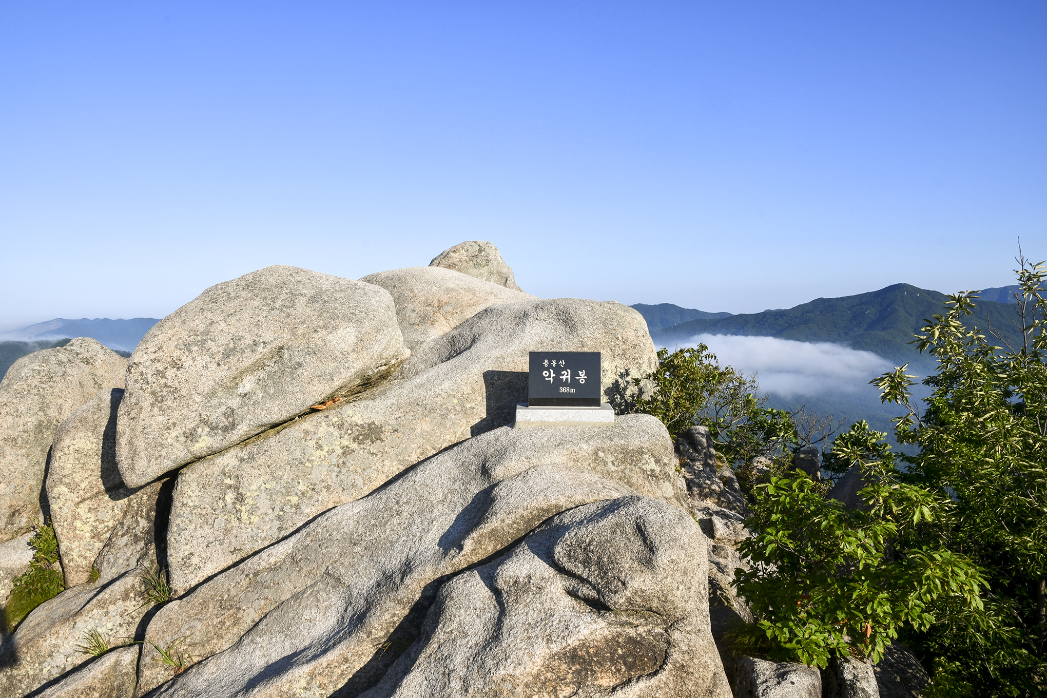이름도 무서운 악귀봉 정상석이 바위 절벽 끝에 놓여 있고,